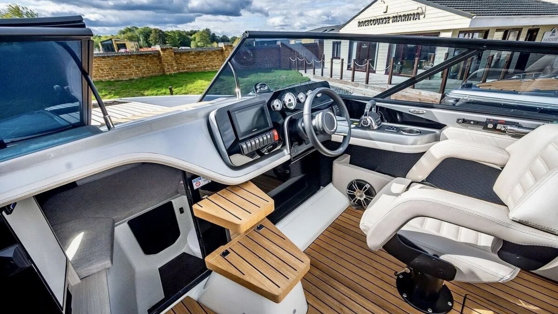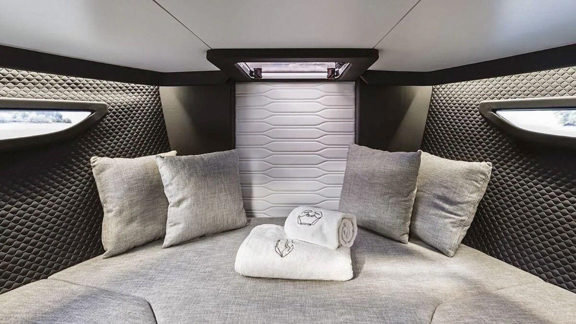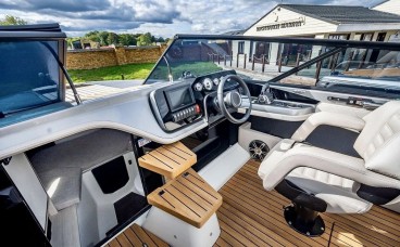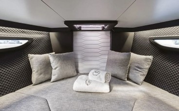 Smart & Versatile Layout: The cockpit features swiveling helm and co-pilot seats that integrate into a seating area with an L-shaped sofa, creating a fluid and spacious social space for your guests.