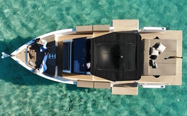 This model stands out for its minimalist aesthetic with clean lines and, above all, for its innovative hidden outboard engine concept, which maximizes deck space and reduces noise levels. It is the perfect vessel for an exclusive group seeking a day of sun, music, and sea with maximum sophistication and surprising habitability for her LOA (Length Overall).