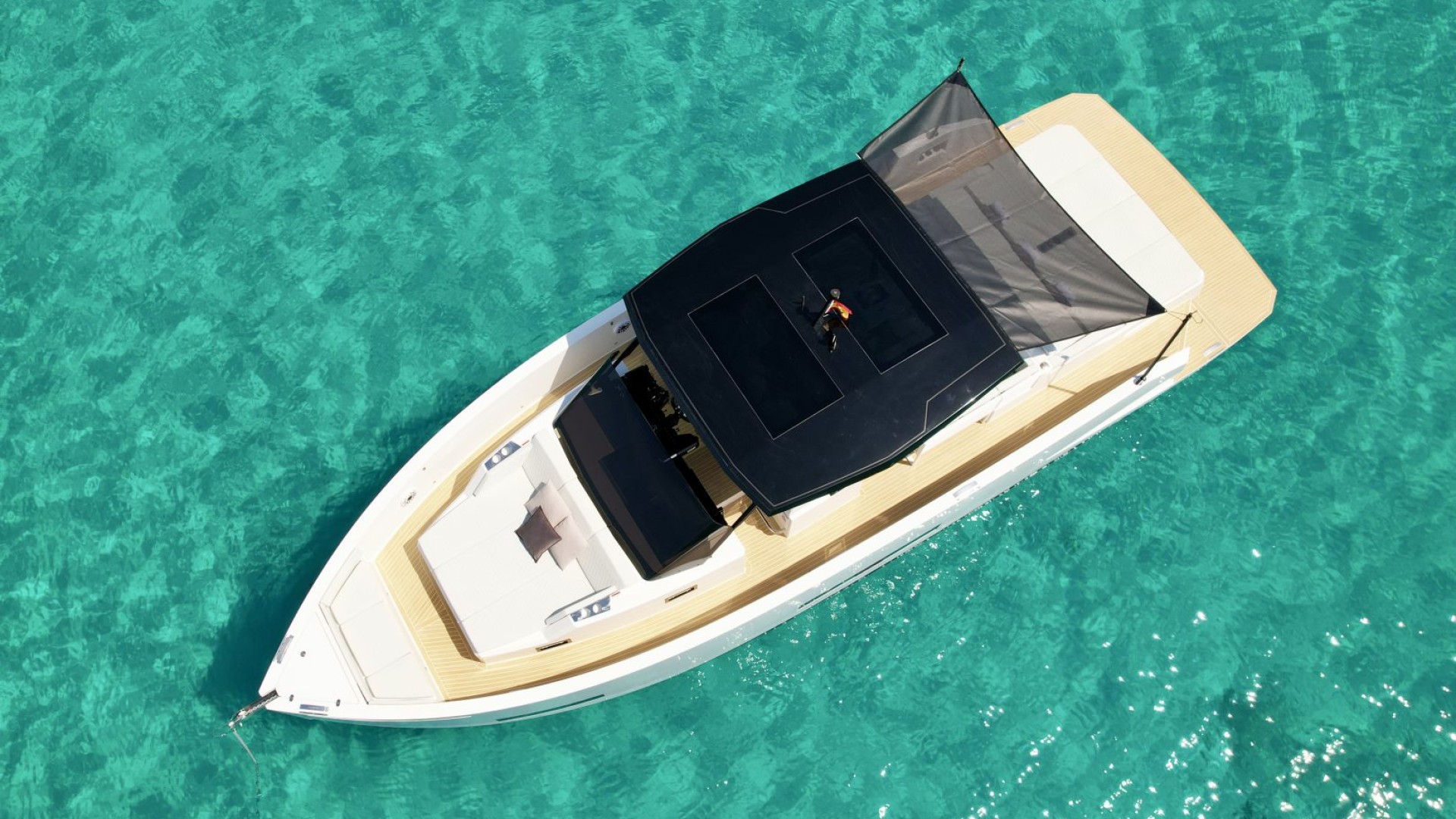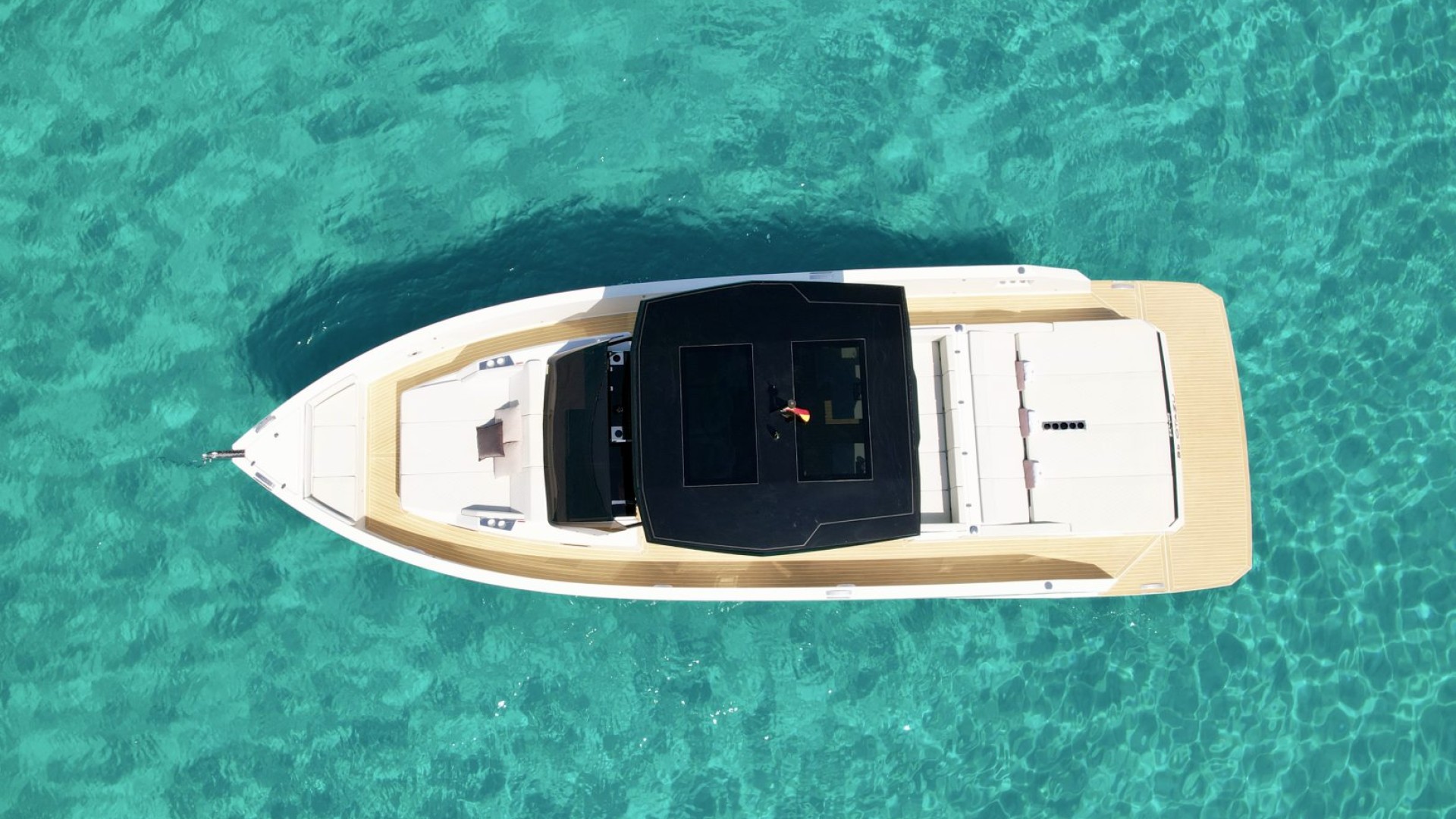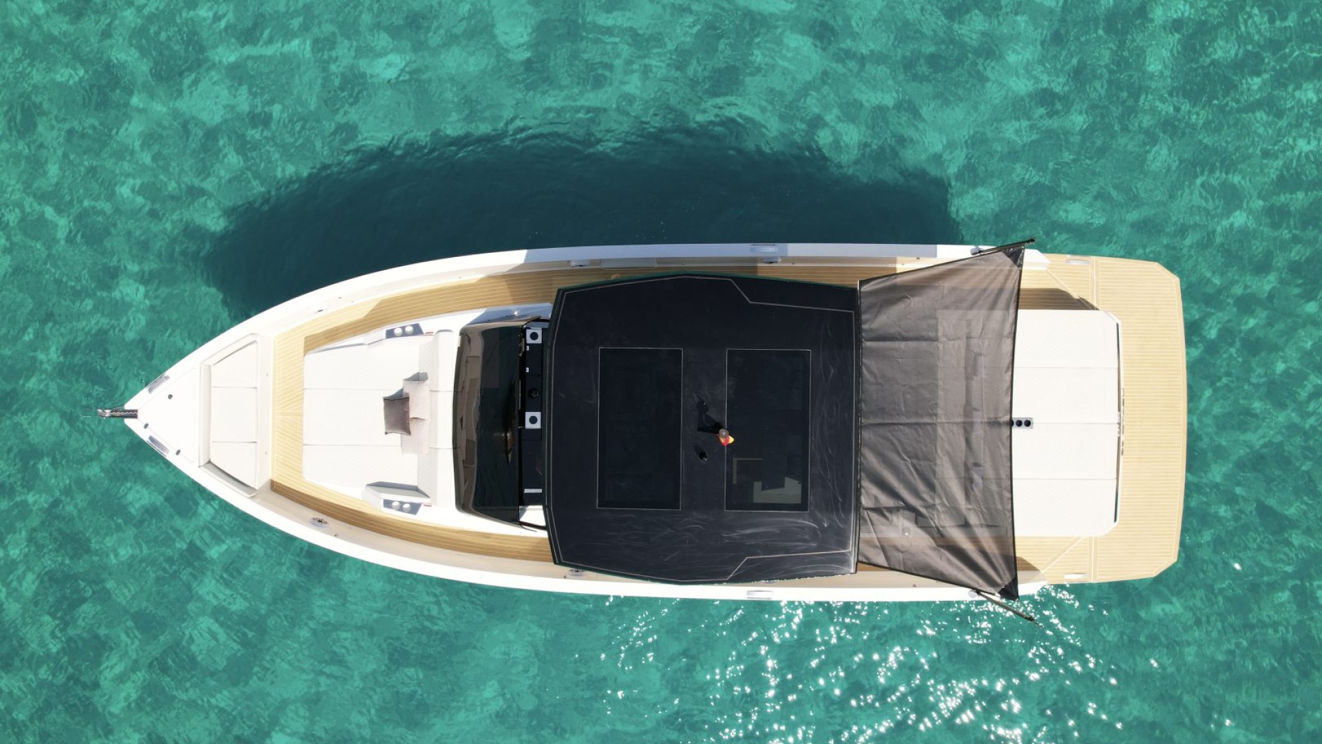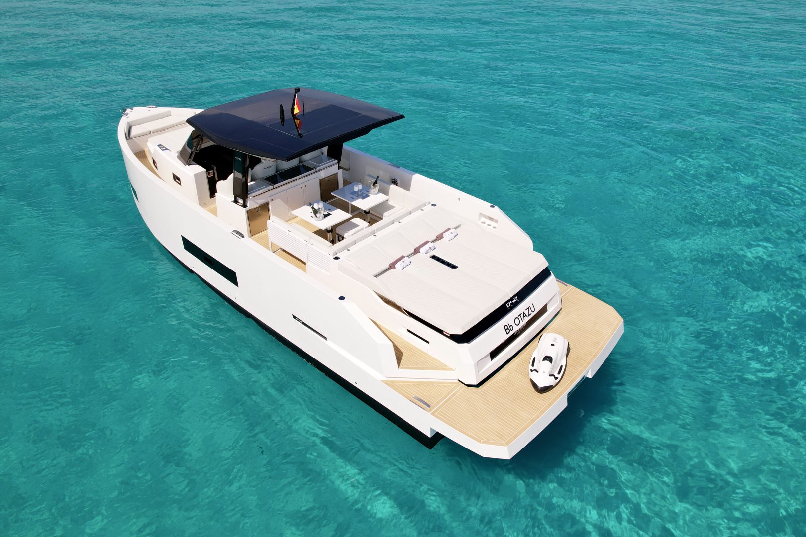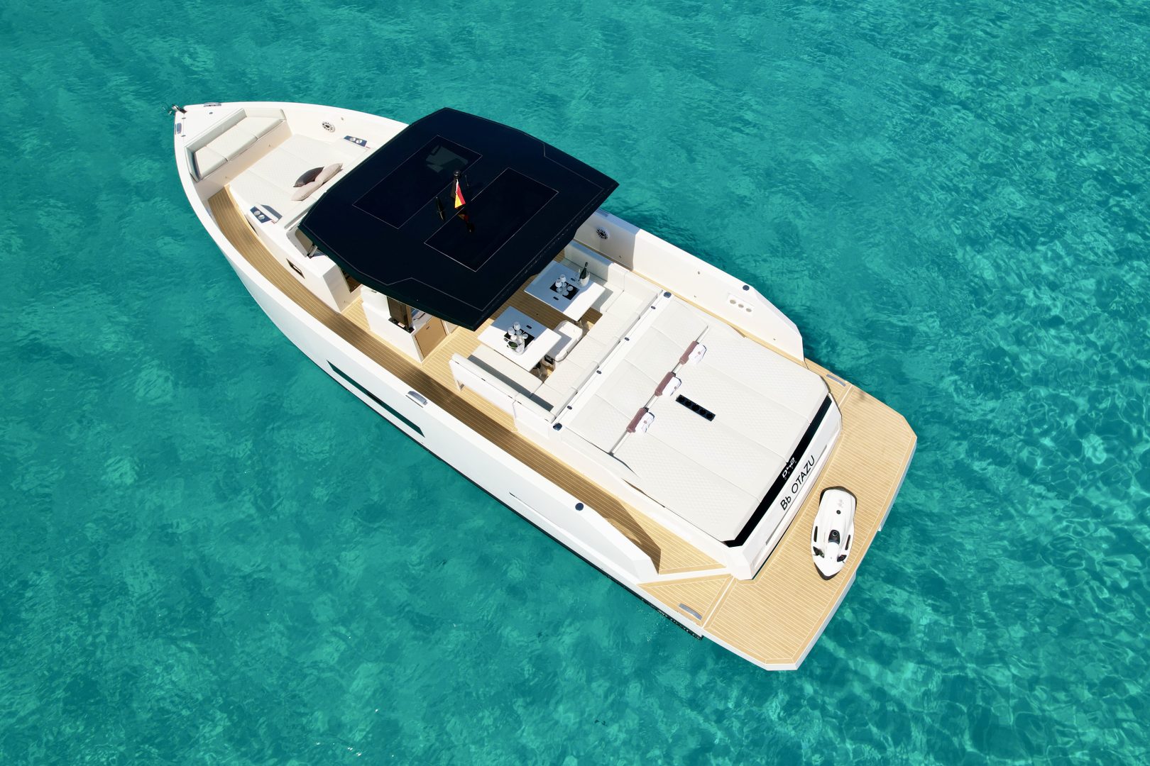 Dining and Chill-out Area: Equipped with two independent tables and a full wet bar (outdoor galley), it is designed for long lunches and sunsets with a glass of champagne, all under the protection of its iconic black T-Top.