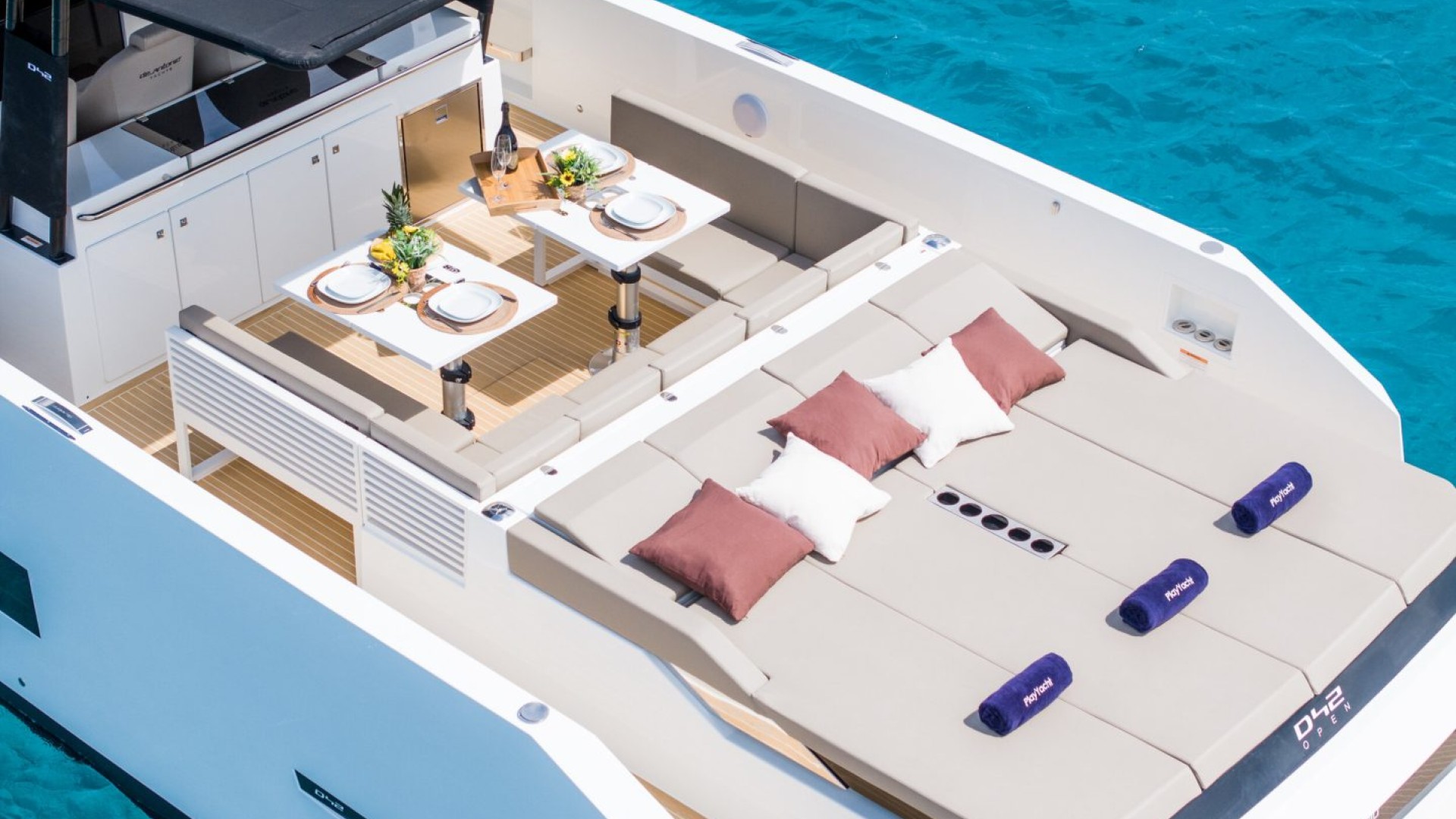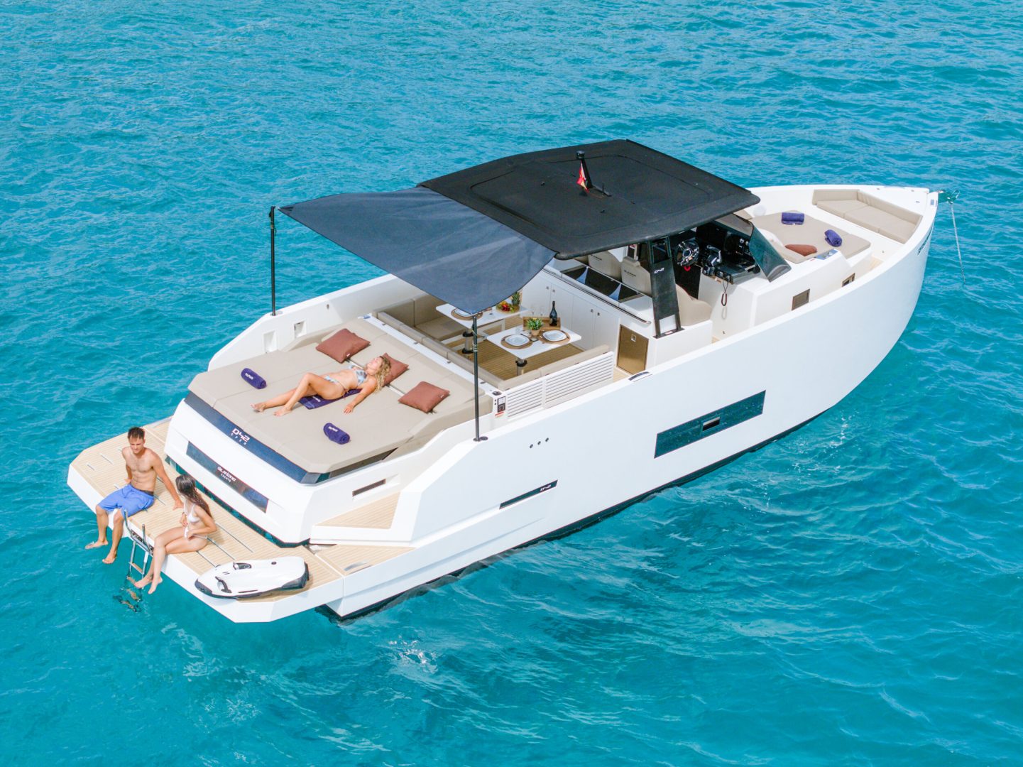Three Relaxation Areas: It features double sundecks (aft and bow) and a central dining area protected by an elegant carbon T-Top. It is, quite literally, a private beach club on the water.