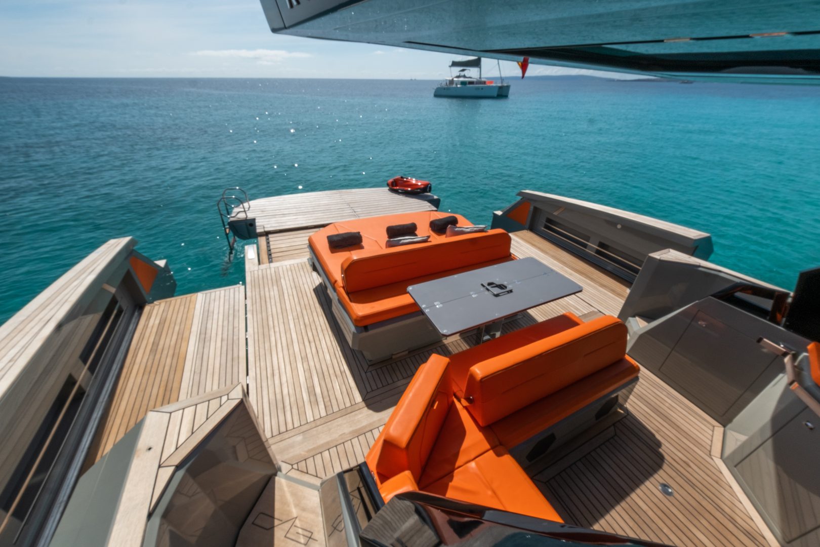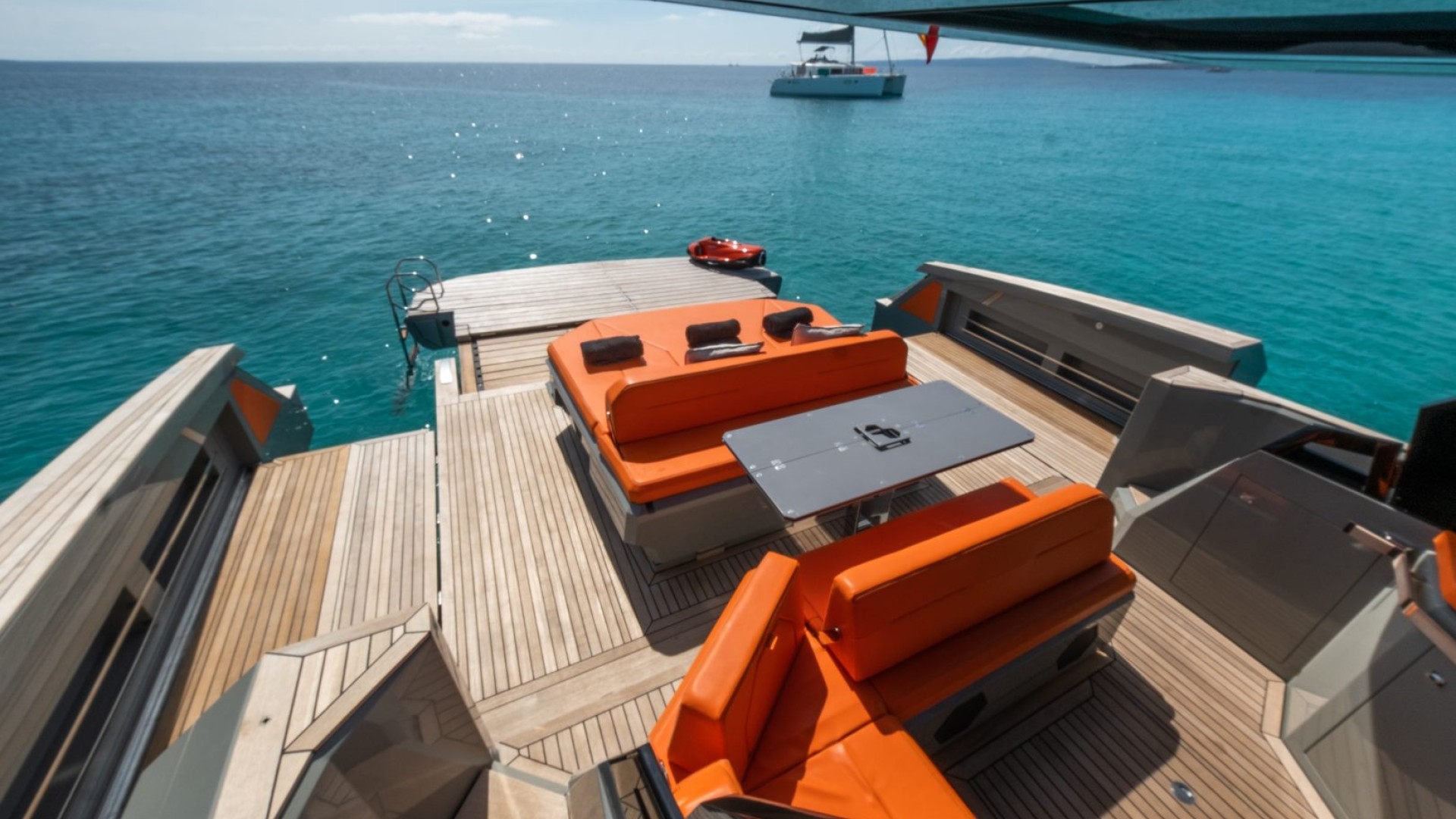 Infinite Space (X-Tension): Its most iconic feature is the folding bulwarks. At the touch of a button, the stern expands, increasing the deck surface by 40% and transforming it into a true floating terrace over the sea.