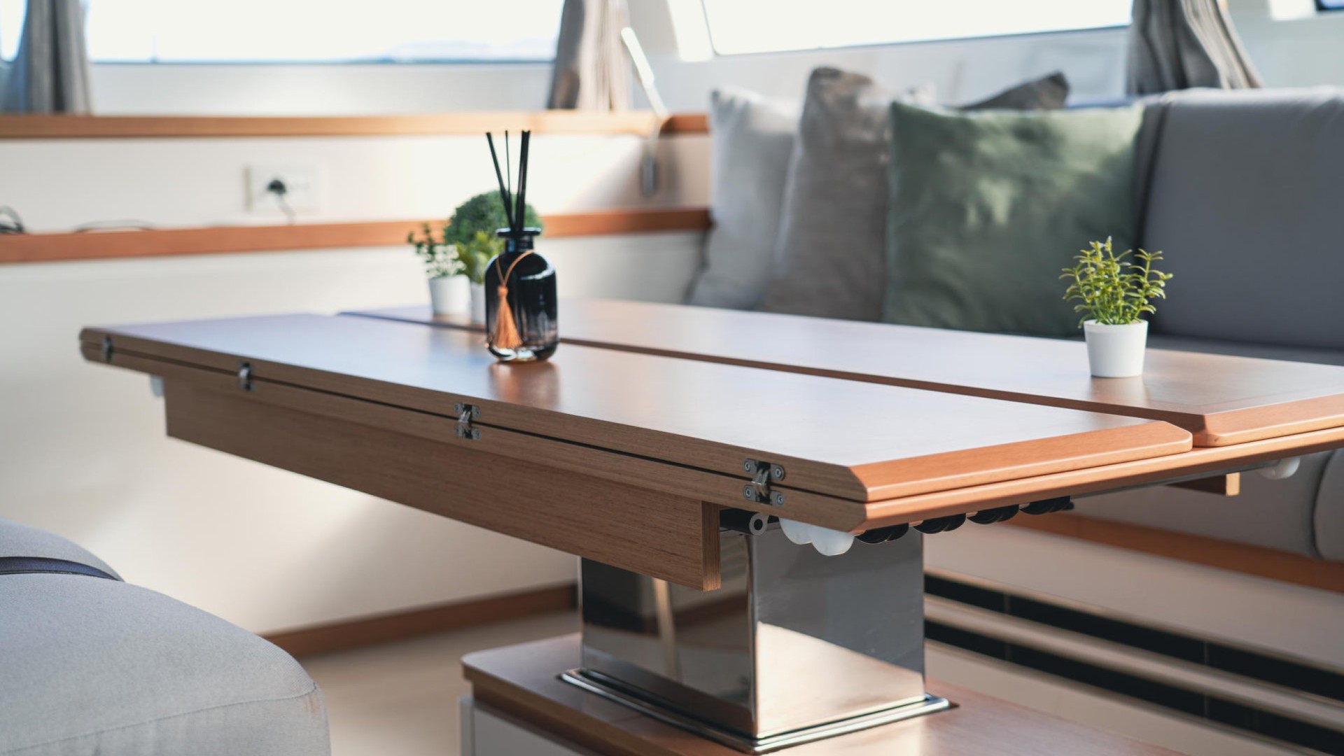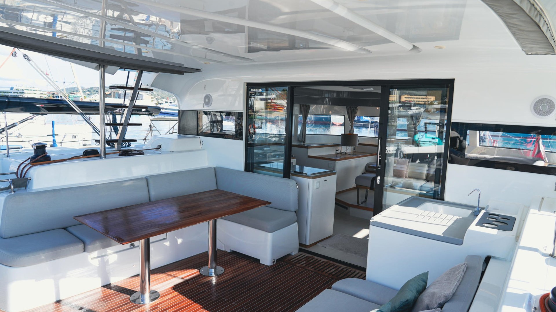 Unique Retractable Roof: The outdoor saloon features an innovative canvas roof that opens completely. Enjoy dinner under the stars or the midday sun with a single gesture—a level of versatility rarely found on yachts of this LOA (Length Overall).