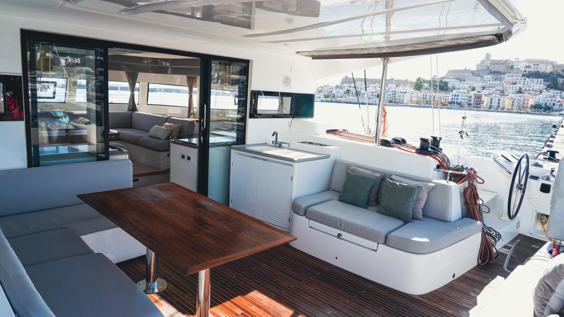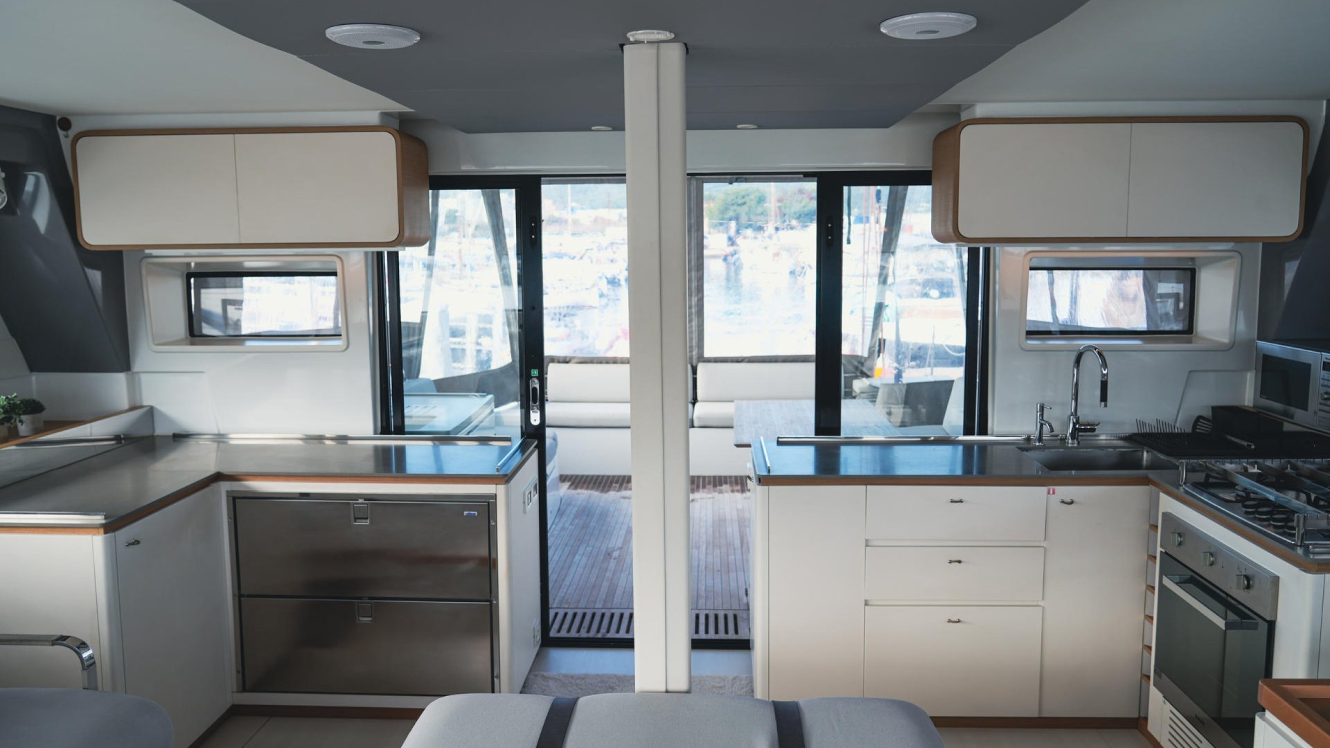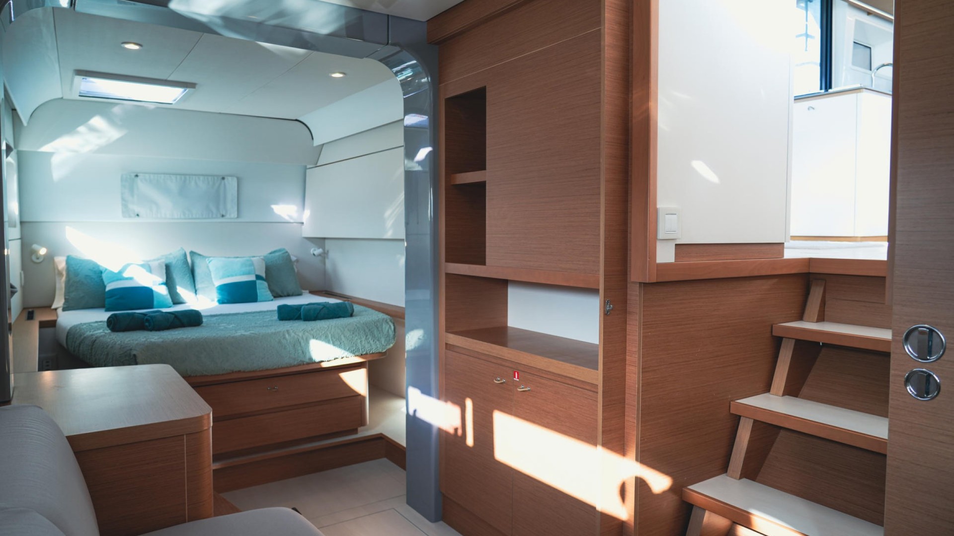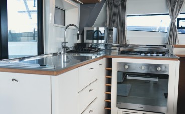 Twin Aft Helm Stations: Unlike models with a closed flybridge, Avatar features its helms at the stern. This not only provides a sporty, elegant silhouette but also ensures a genuine connection with the sea and full visibility of the sails, allowing you to feel the breeze while engaging with guests in the cockpit.