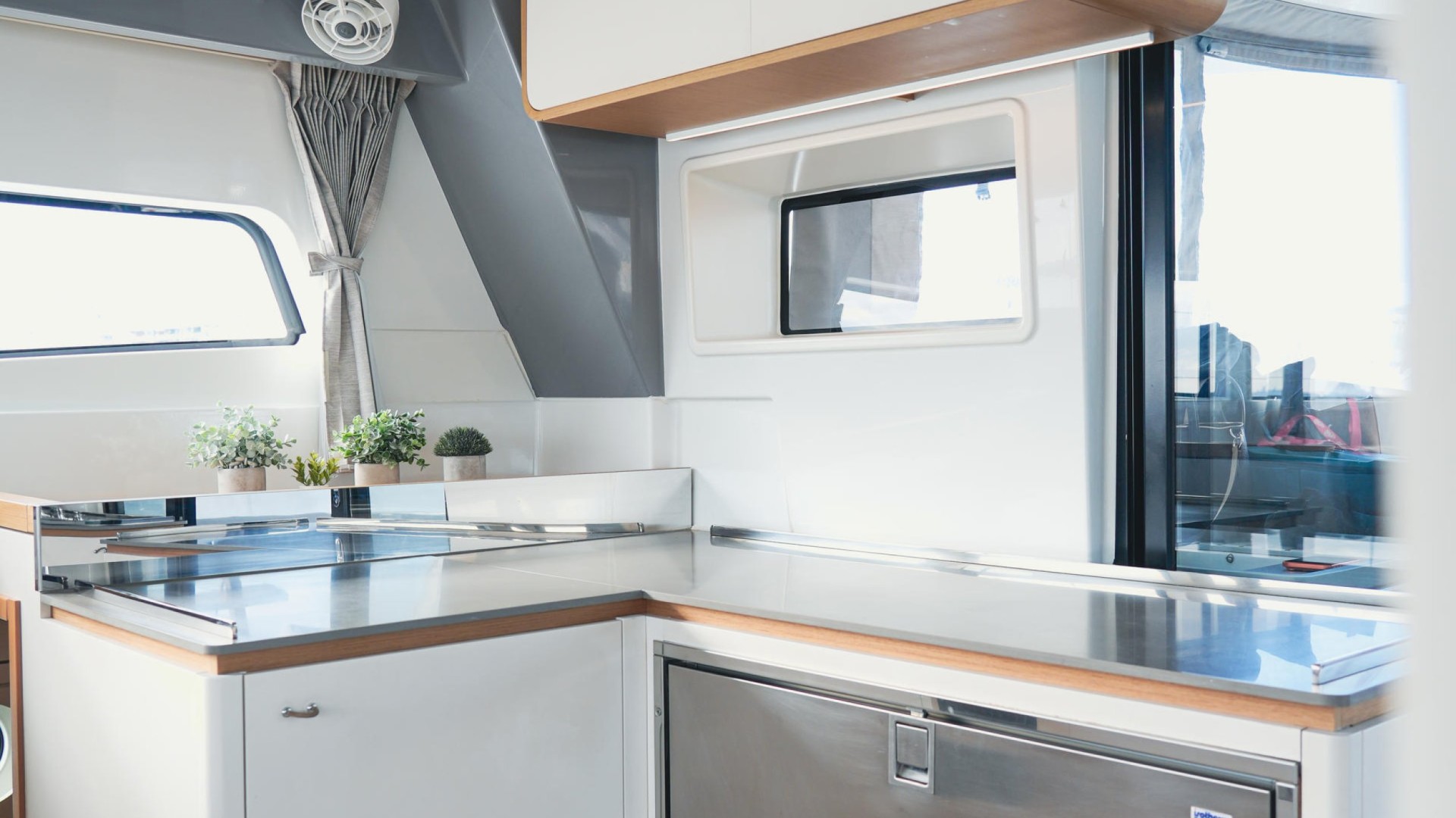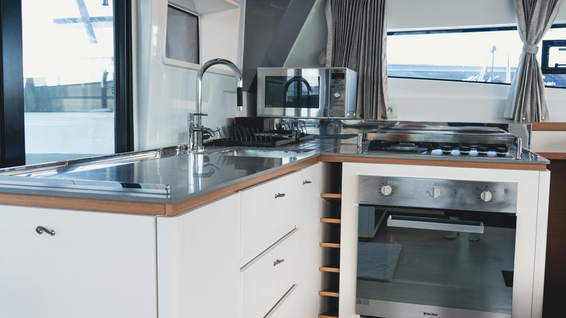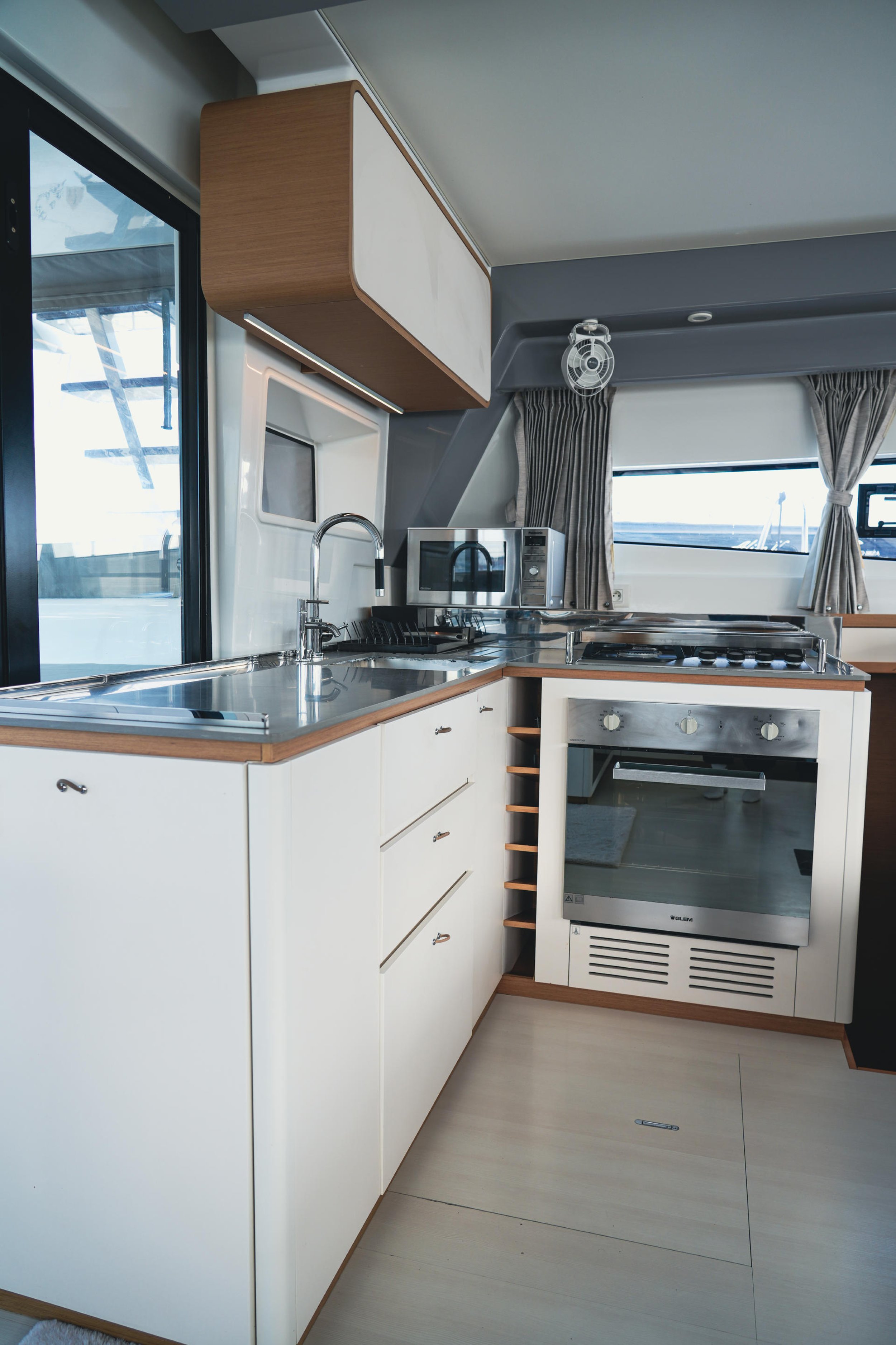 Twin Aft Helm Stations: Unlike models with a closed flybridge, Avatar features its helms at the stern. This not only provides a sporty, elegant silhouette but also ensures a genuine connection with the sea and full visibility of the sails, allowing you to feel the breeze while engaging with guests in the cockpit.