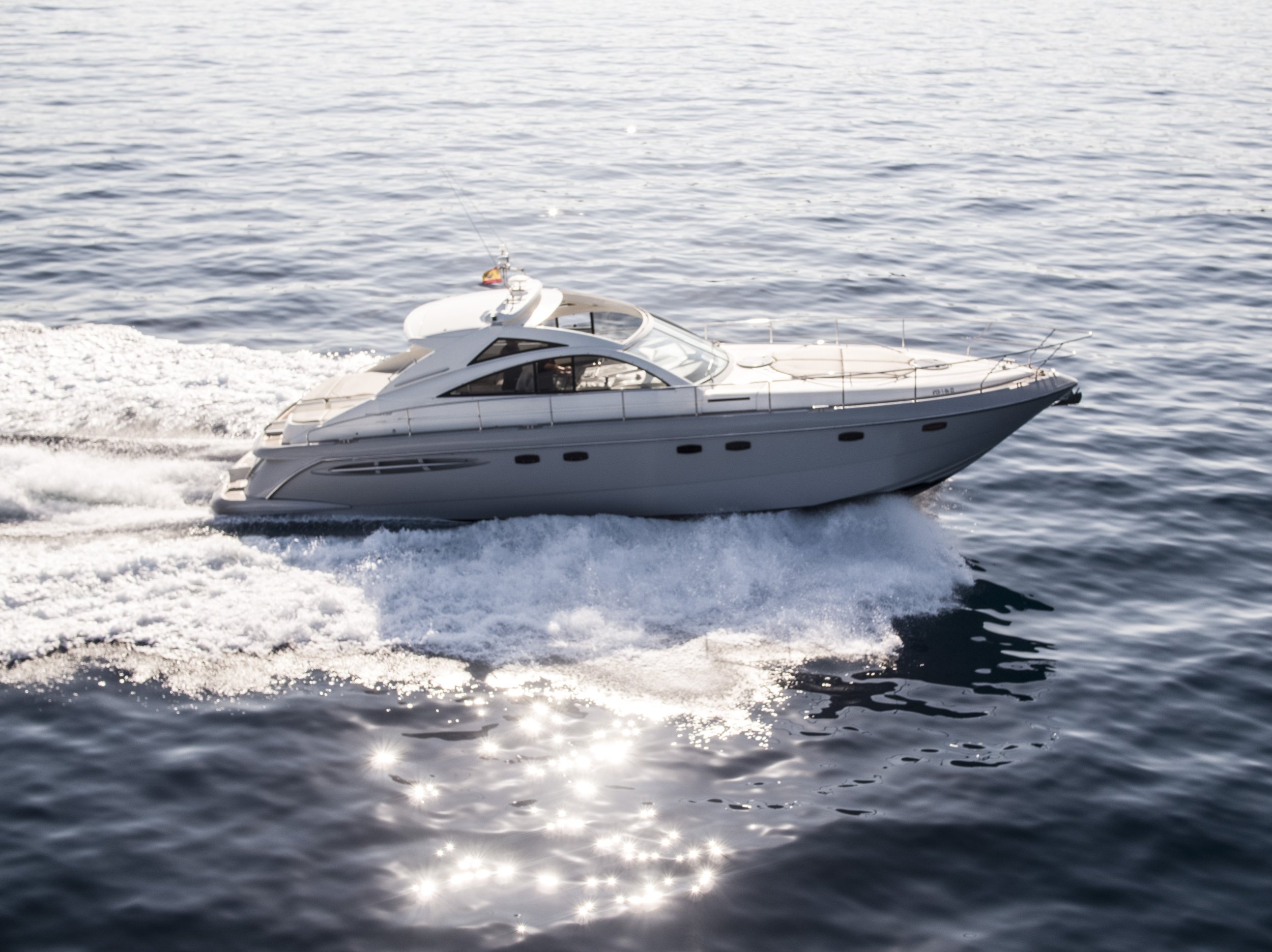 The Fairline Targa 52 “Billie Jean” is an icon of the prestigious British shipyard, setting the standard for mid-range luxury cruisers by balancing exceptional hull engineering with near-perfect interior habitability.With a length overall (LOA) of 16 meters, this vessel stands out for its powerful, classically proportioned silhouette. The hull is specifically engineered to cover long distances with unwavering smoothness. Unlike more experimental models that sacrifice stability for aesthetics, “Billie Jean” relies on solid naval architecture. Its expansive cockpit serves as the social heart of life on board, protected by a retractable hard-top that provides either the Ibiza sun or cool shade at the touch of a button.Designed for serious and comfortable cruising, she accommodates large groups without compromising the sense of space. Equipped with powerful inboard shaft-drive engines, she offers reliable and stable handling, reaching cruising speeds of 30 knots with a range that encourages carefree exploration of neighboring islands. With three spacious cabins and a saloon finished in fine woodwork, the Fairline 52 is the ultimate choice for those seeking a “thoroughbred” yacht that blends British robustness with the most sophisticated Mediterranean lifestyle.