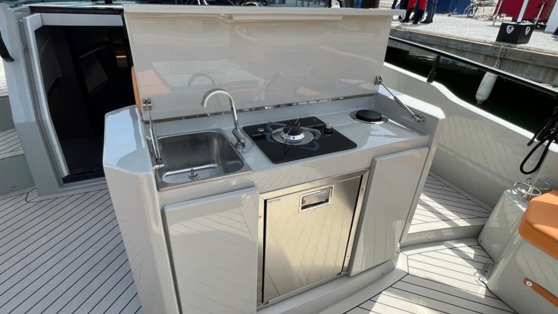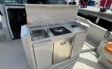 Fully Equipped Wet Bar: Featuring a stove, sink, and stainless steel refrigerator, the outdoor galley allows you to enjoy gourmet appetizers or meals while at anchor in the finest coves, without needing to go ashore.