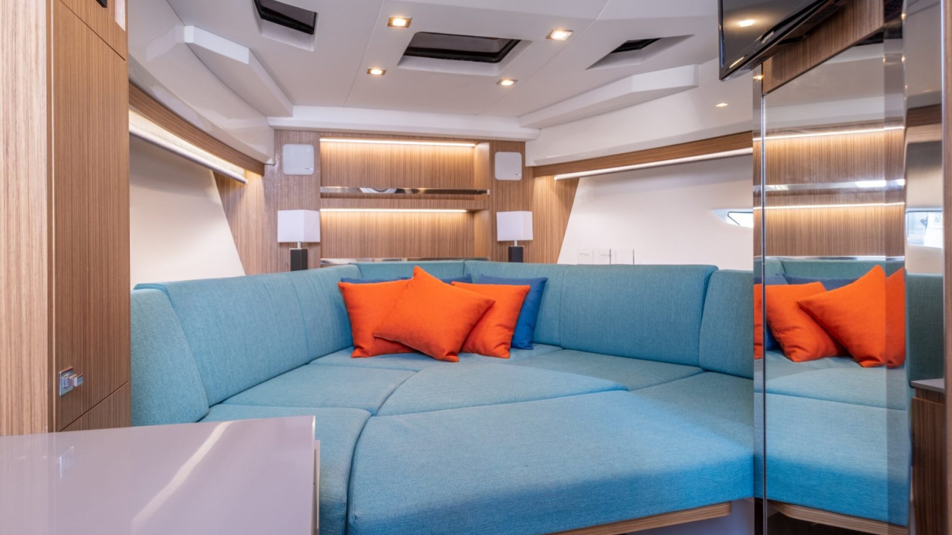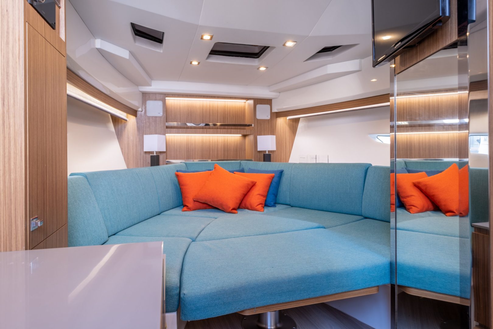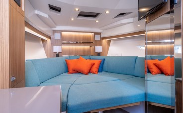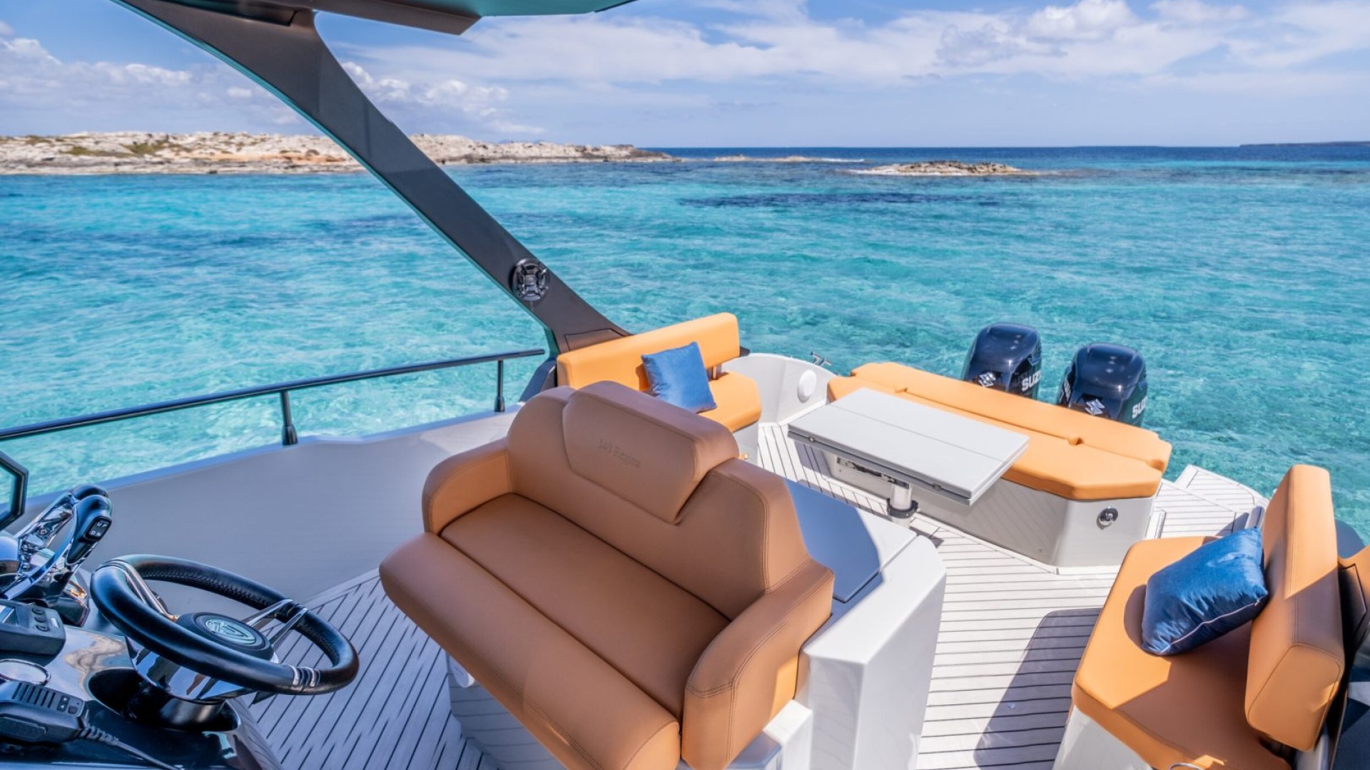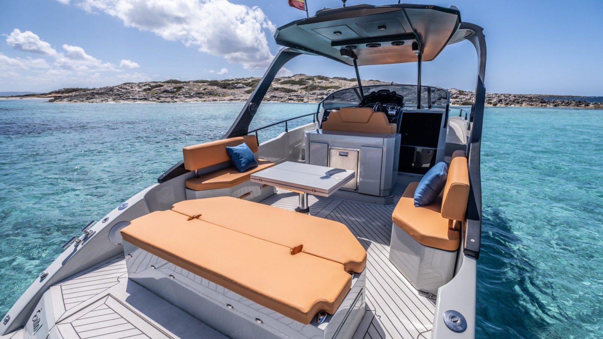 Superior Quality Details: Synthetic teak finishes, premium upholstery in earth and blue tones, and a high-fidelity sound system create the perfect atmosphere for an unforgettable day in the Mediterranean.