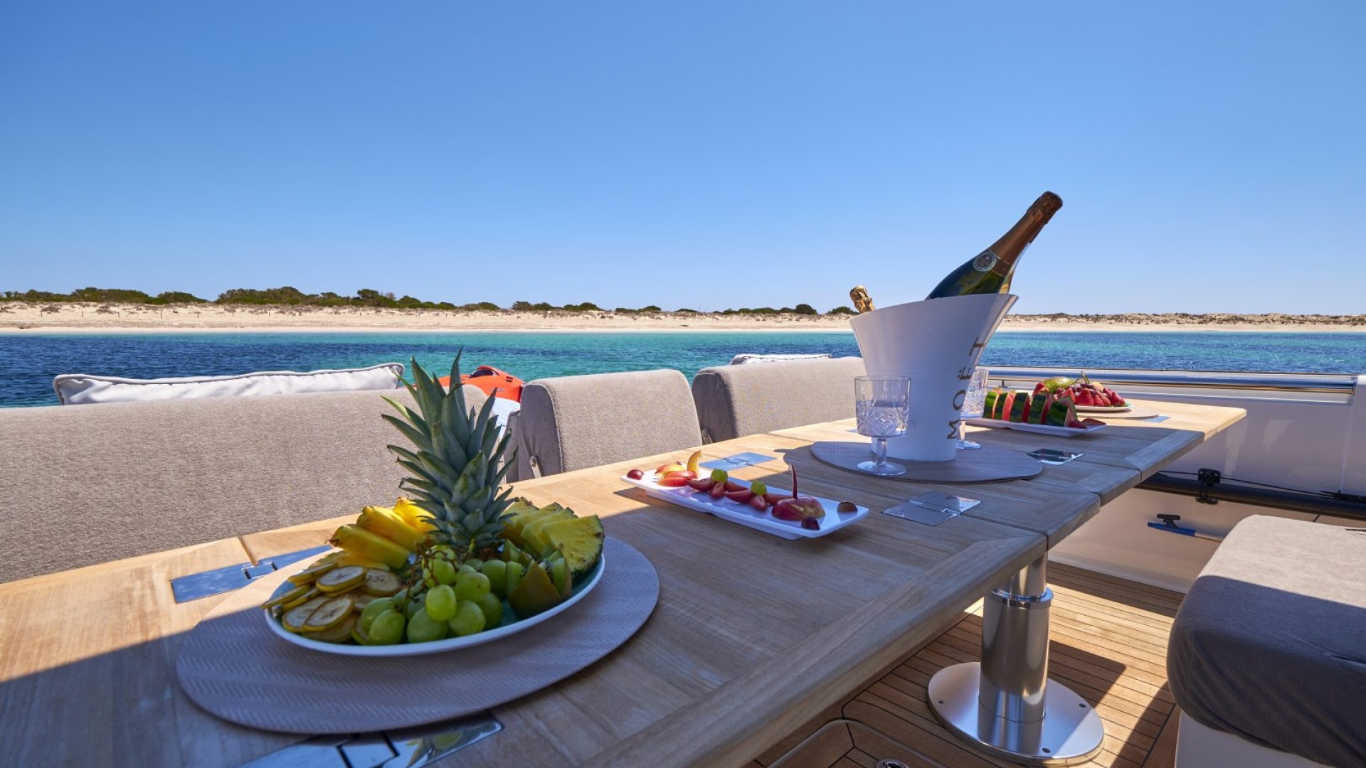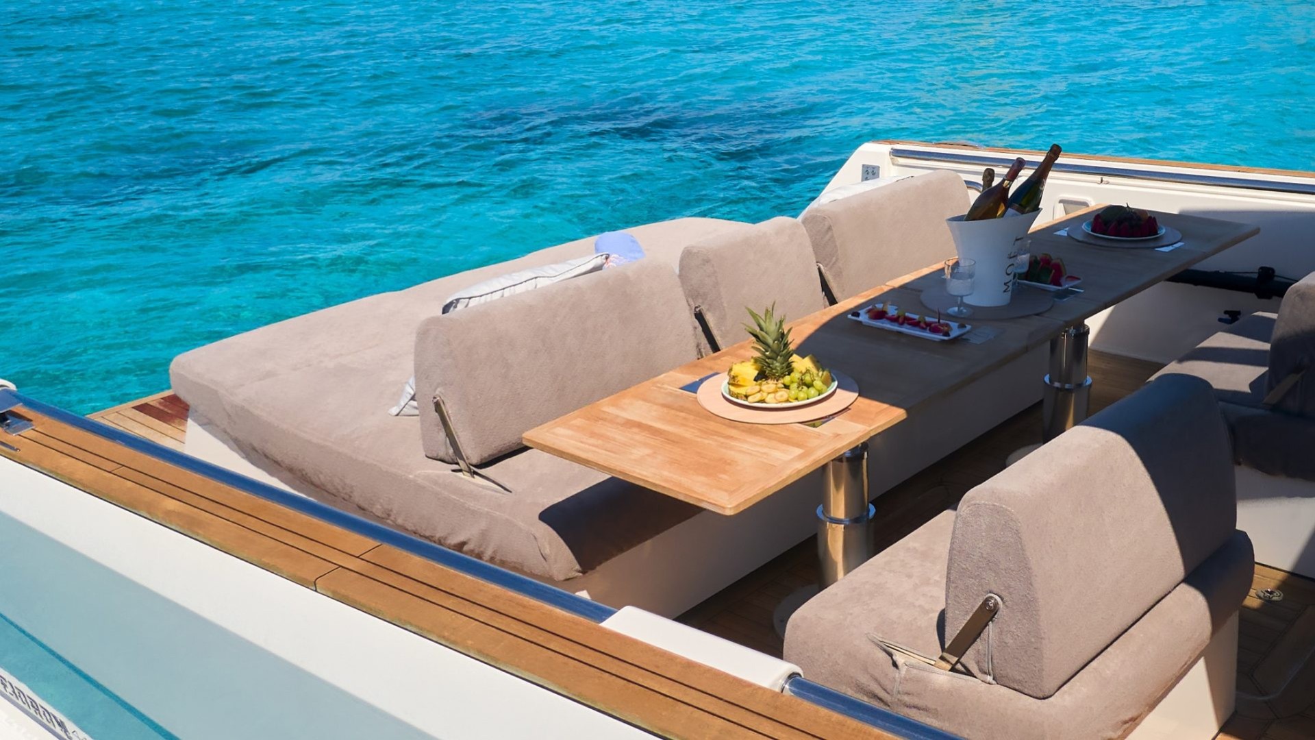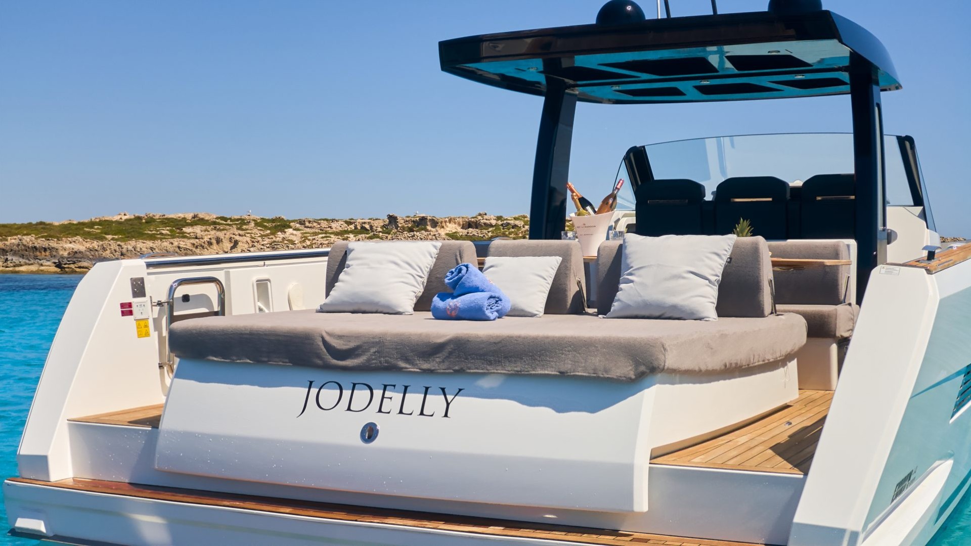 Versatile Social Area: The aft area is the heart of the boat. It features a spectacular convertible table that transforms into a king-size sun pad in seconds—perfect for relaxing after lunch overlooking Es Vedrà.