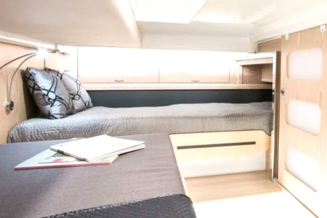 Premium Interior Comfort: Surprisingly habitable, she features a sophisticated master cabin, a guest cabin, and a full head with high-quality wood finishes, offering a peaceful, air-conditioned sanctuary after a day in the sun.