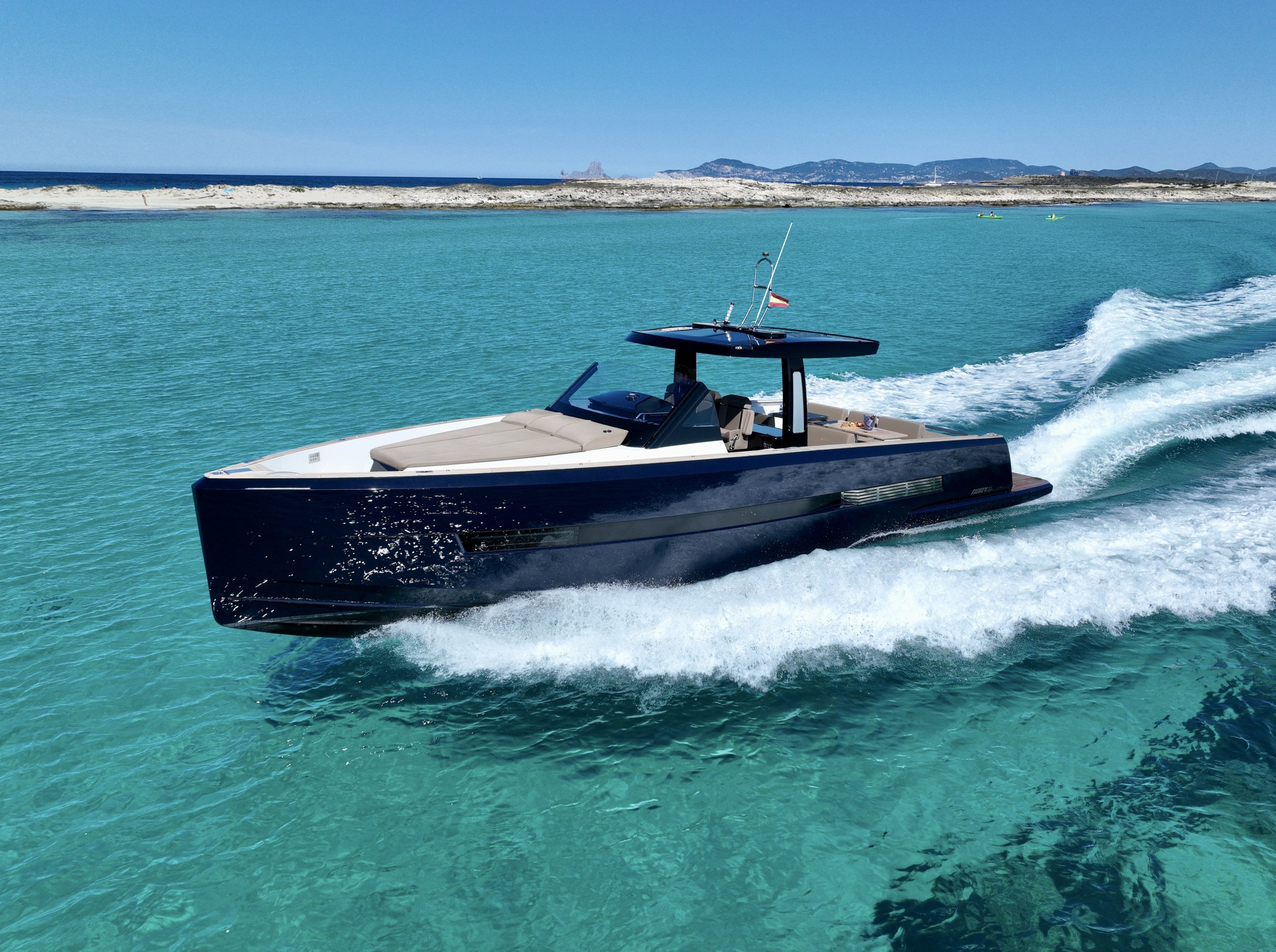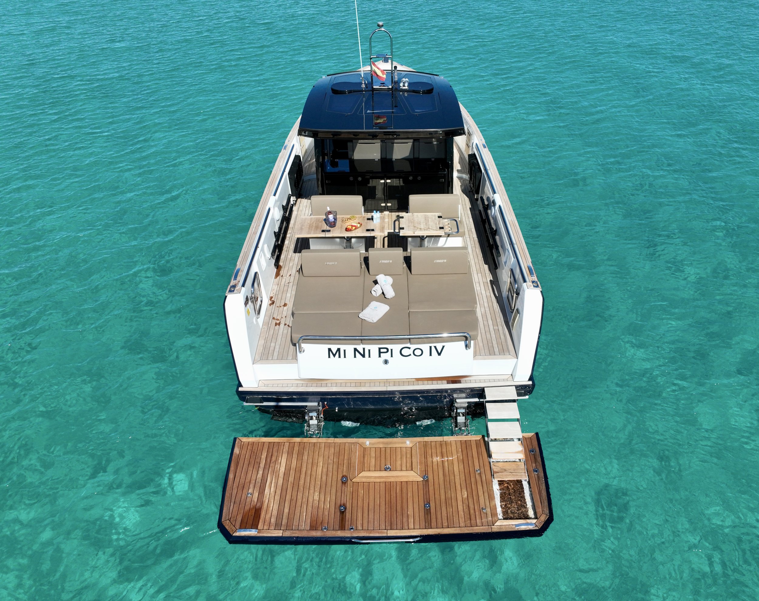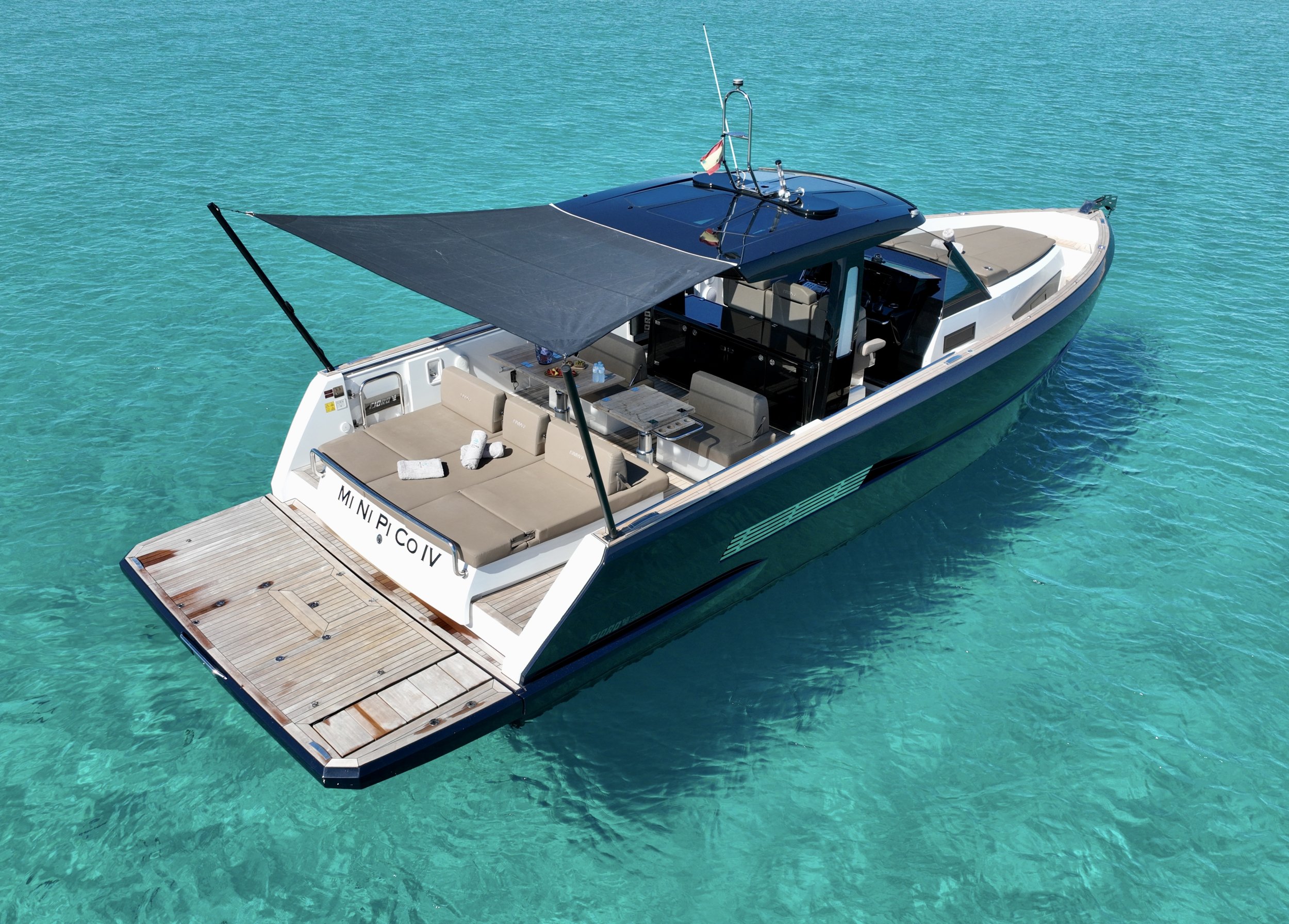The Fjord 44 Open “Minipico IV” is the quintessence of the cool and functional design that has established Fjord as the absolute benchmark for open motor yachts in the Mediterranean—a vessel that blends minimalist aesthetics with cutting-edge engineering.With an overall length (LOA) of 13.4 meters, this unit stands out for its unmistakable vertical bow and high freeboards, which ensure unparalleled safety and a sense of volume within its class. Unlike other sport cruisers that sacrifice deck space for bulky cabins, “Minipico IV” opts for a full walk-around layout, allowing fluid and secure movement from the massive forward sunpad to the versatile aft area, protected by an iconic carbon fiber T-Top that appears to float above the helm station.It is a boat designed for maximum social enjoyment and outdoor living, capable of reaching speeds exceeding 35 knots thanks to its advanced Volvo IPS propulsion. This system not only provides remarkable efficiency and top speed but also allows for pinpoint maneuverability via joystick, facilitating docking in the busiest marinas of Ibiza. Featuring a generous hydraulic swim platform and an interior that surprises with its brightness and two spacious cabins, the Fjord 44 “Minipico IV” is the definitive choice for those seeking an iconic, extremely stable day boat with the hallmark of Nordic sophistication.