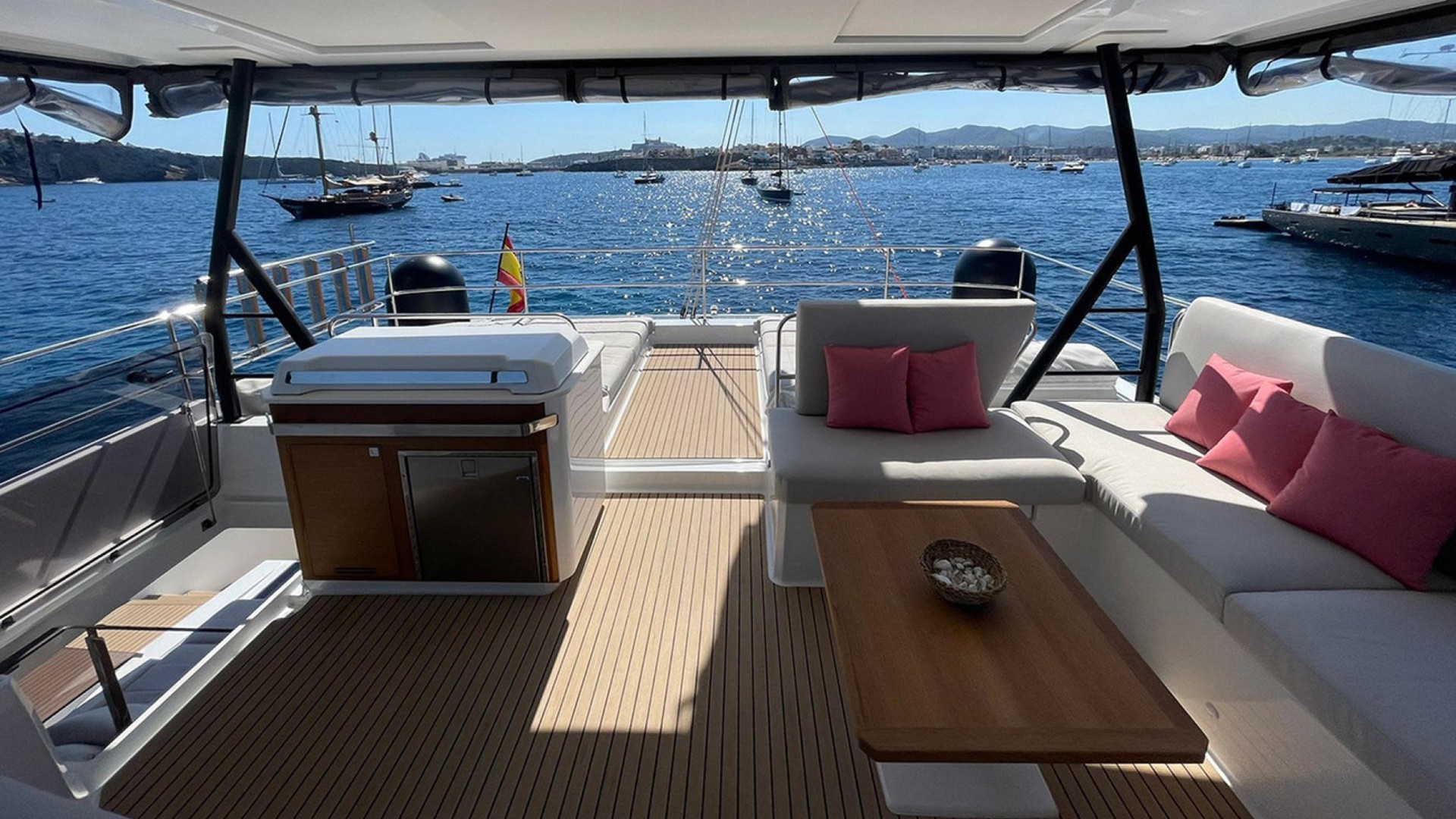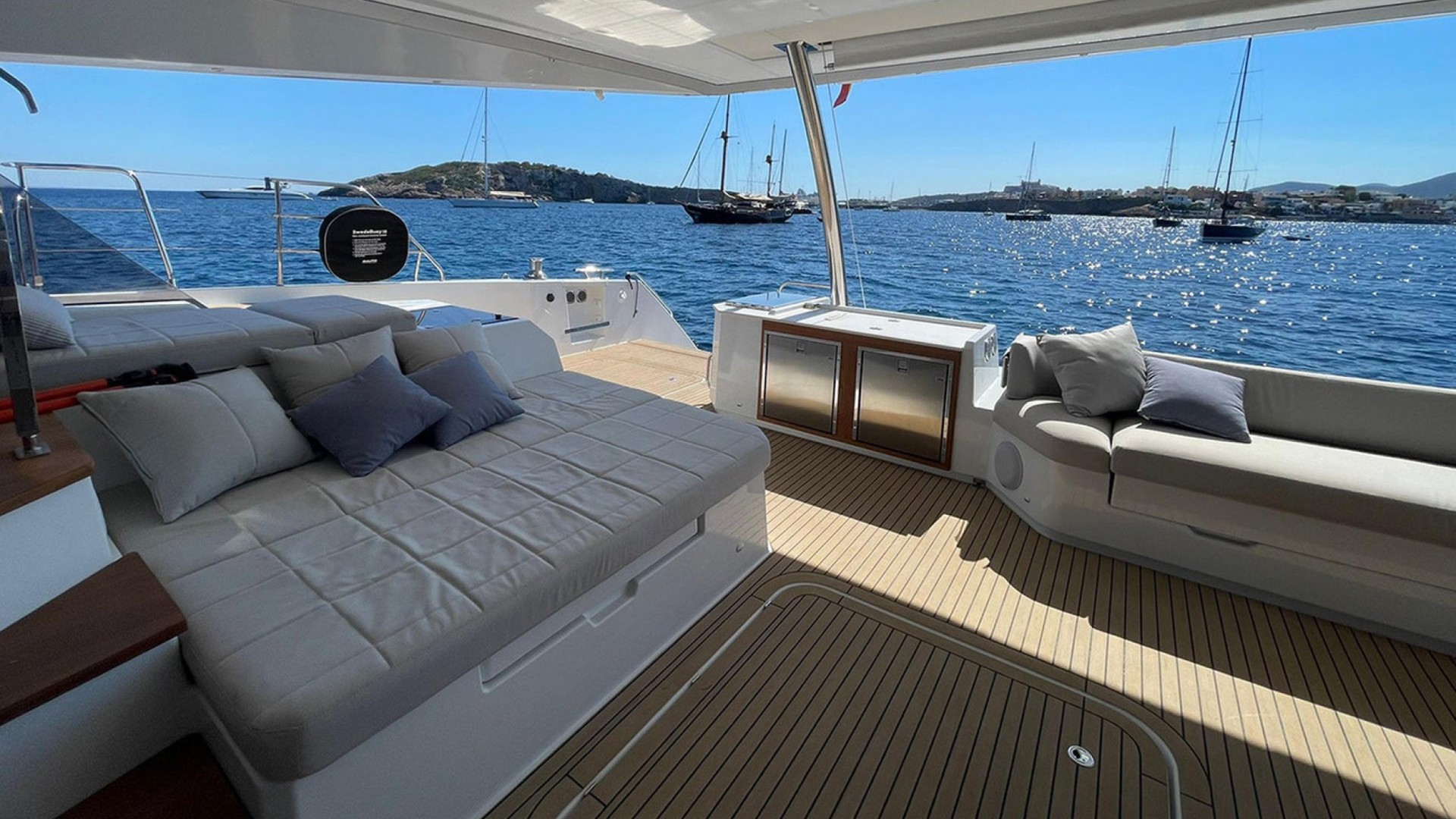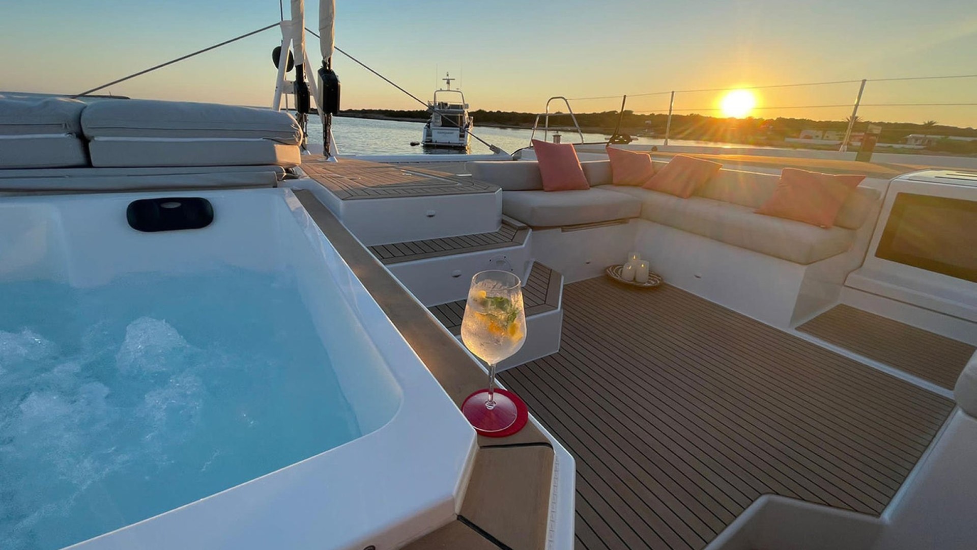 Private Bow Jacuzzi: Its most distinctive feature. Imagine relaxing in the jacuzzi while cruising toward the crystal-clear waters of Formentera or enjoying the sunset in Cala Saona.