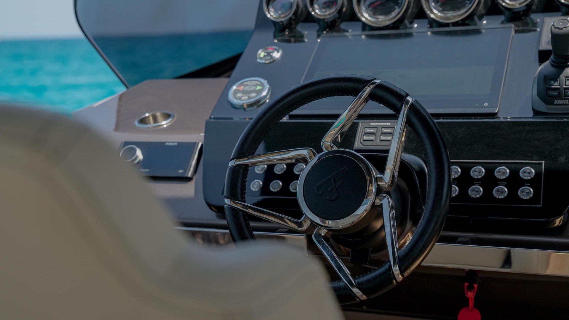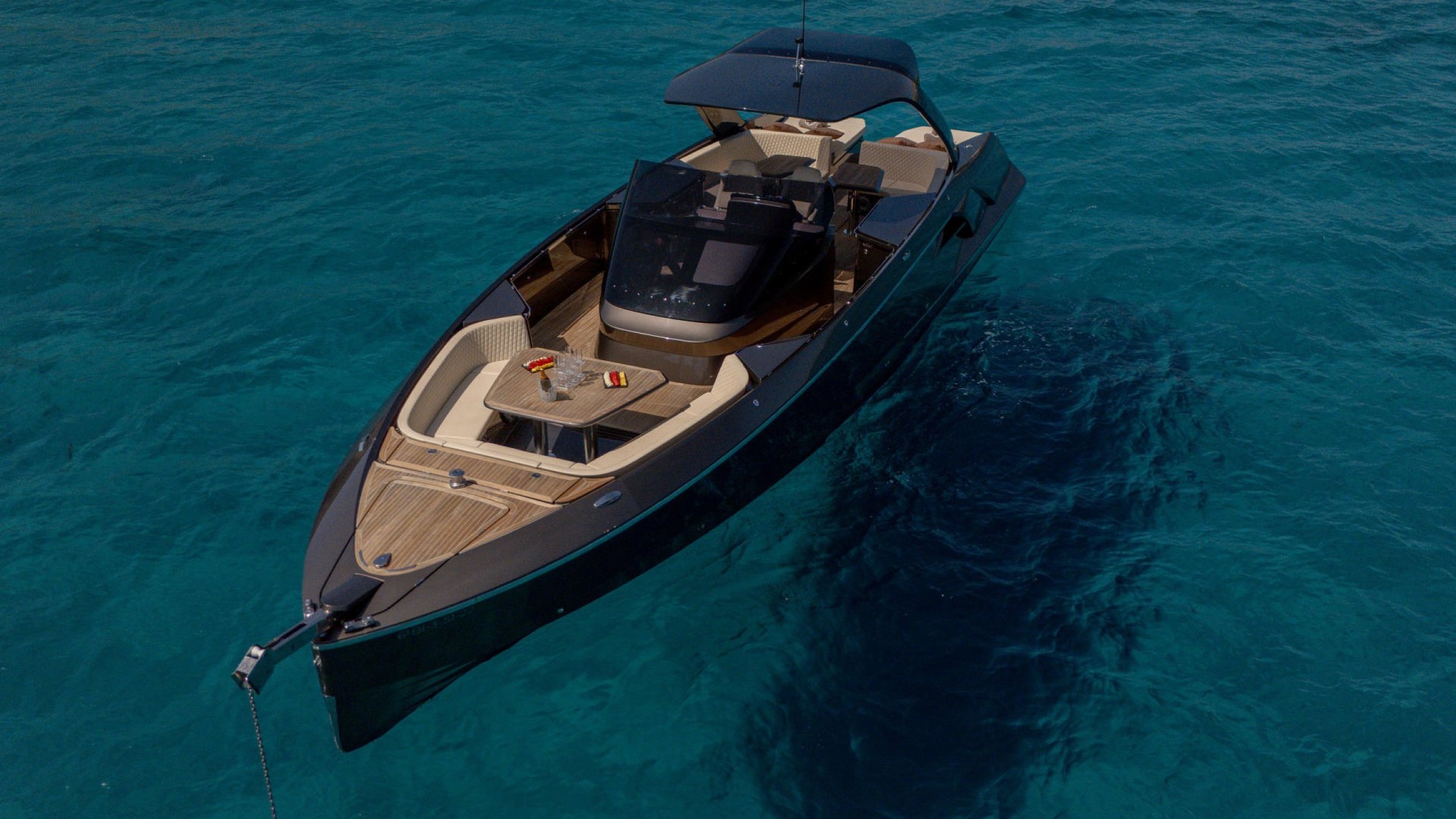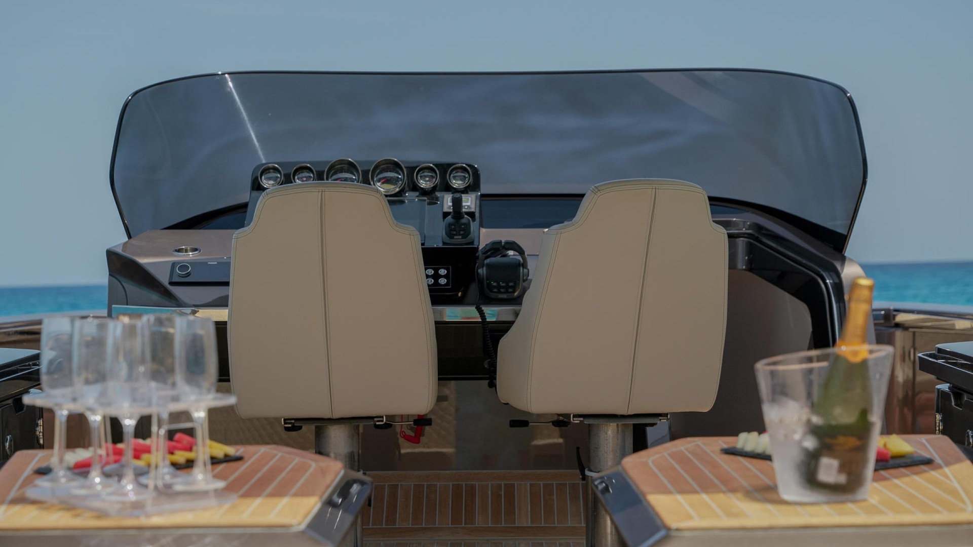Revolutionary Open Design: Its walk-around configuration allows for fluid and safe movement on board. Highlights include its imposing carbon fiber T-Top and its fore and aft biminis with carbon poles, offering technical shade without compromising style.