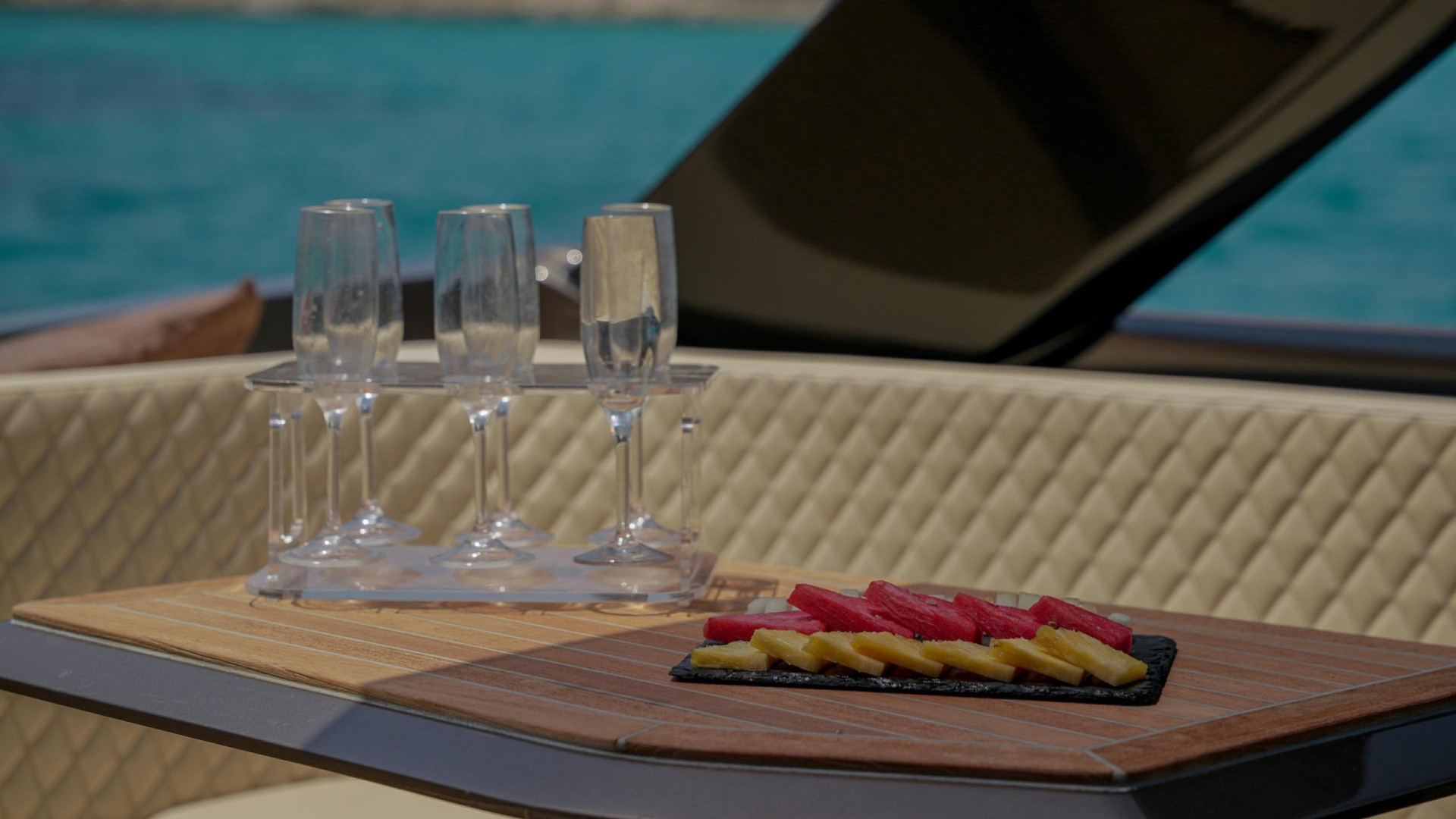 Bow Lounge Area: Unlike other boats, it features a forward lounge with an adjustable table, ideal for breakfast facing Es Vedrà or relaxing on a sun pad designed with high-end textures.
