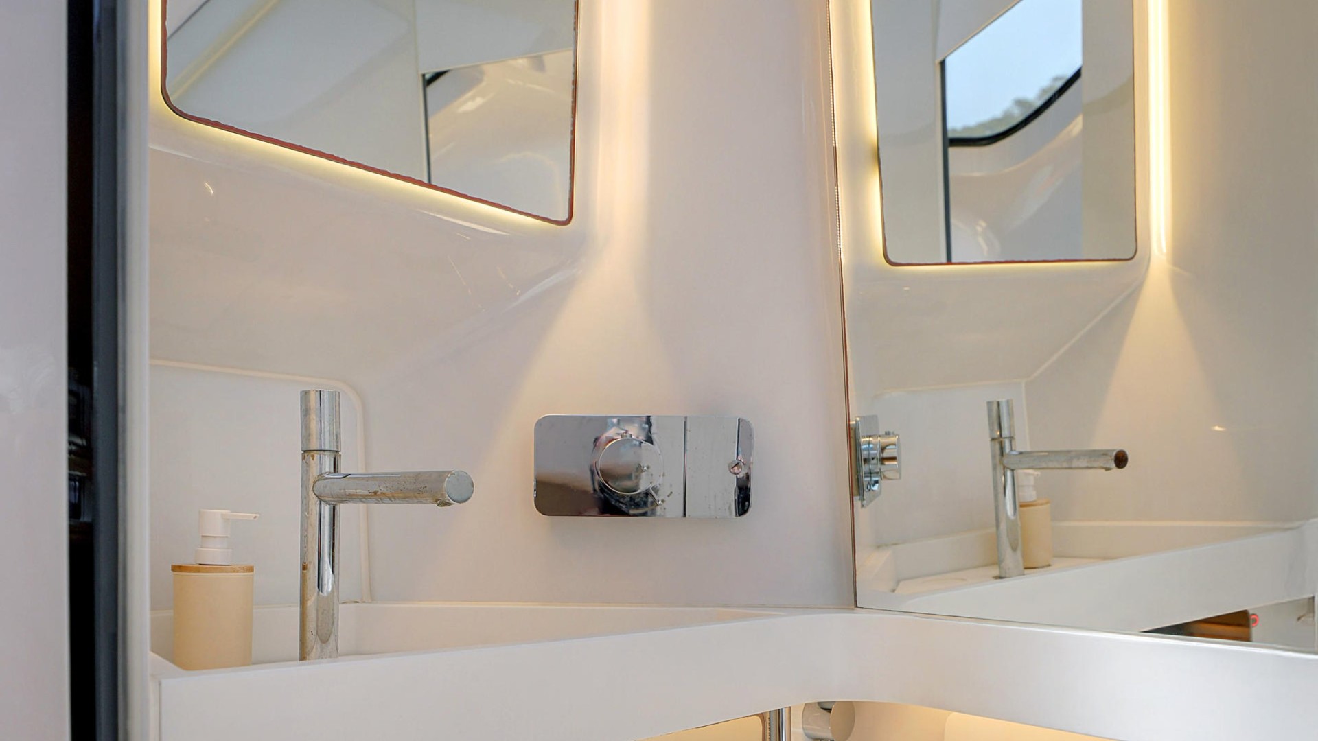 Elite Finishes: Every detail, from the decking to the fixtures and backlit mirrors, reflects Frauscher’s Austrian manufacturing standards, ensuring a premium atmosphere at all times.