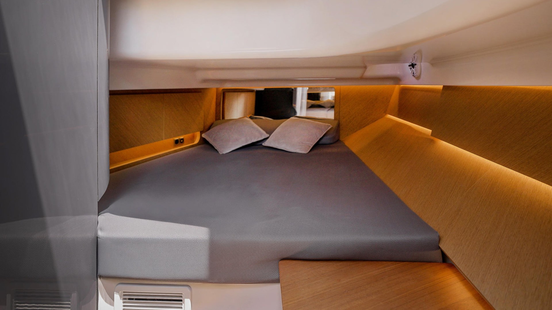 Avant-Garde Interior: The design extends below deck; featuring a double cabin with clean lines, indirect LED lighting, and a designer head reminiscent of a luxury boutique hotel.