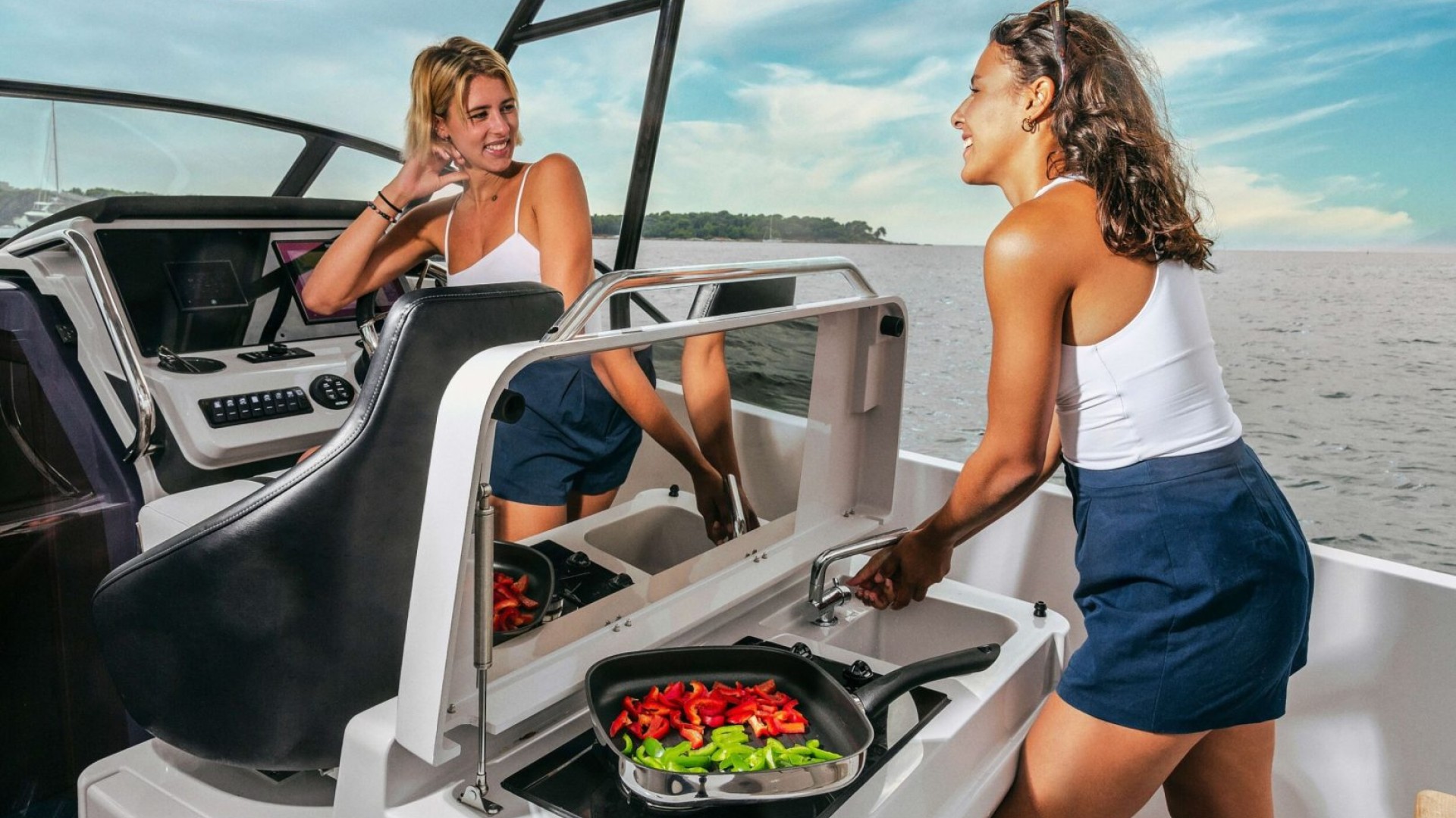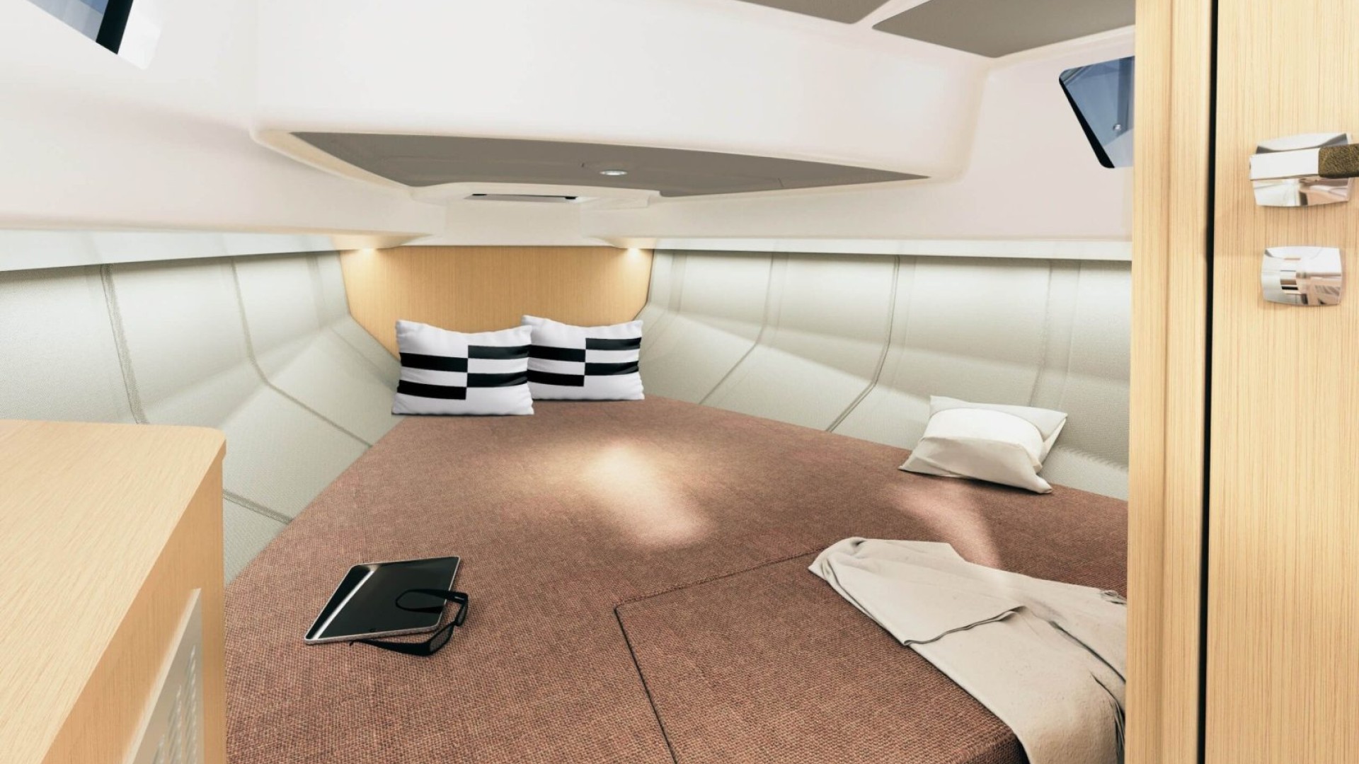 Unexpected “King-Size” Cabin: Unlike other boats in its class, below deck hides a luxury cabin with a double bed and a separate head, allowing for comfortable overnight stays or a private dressing room after a swim.