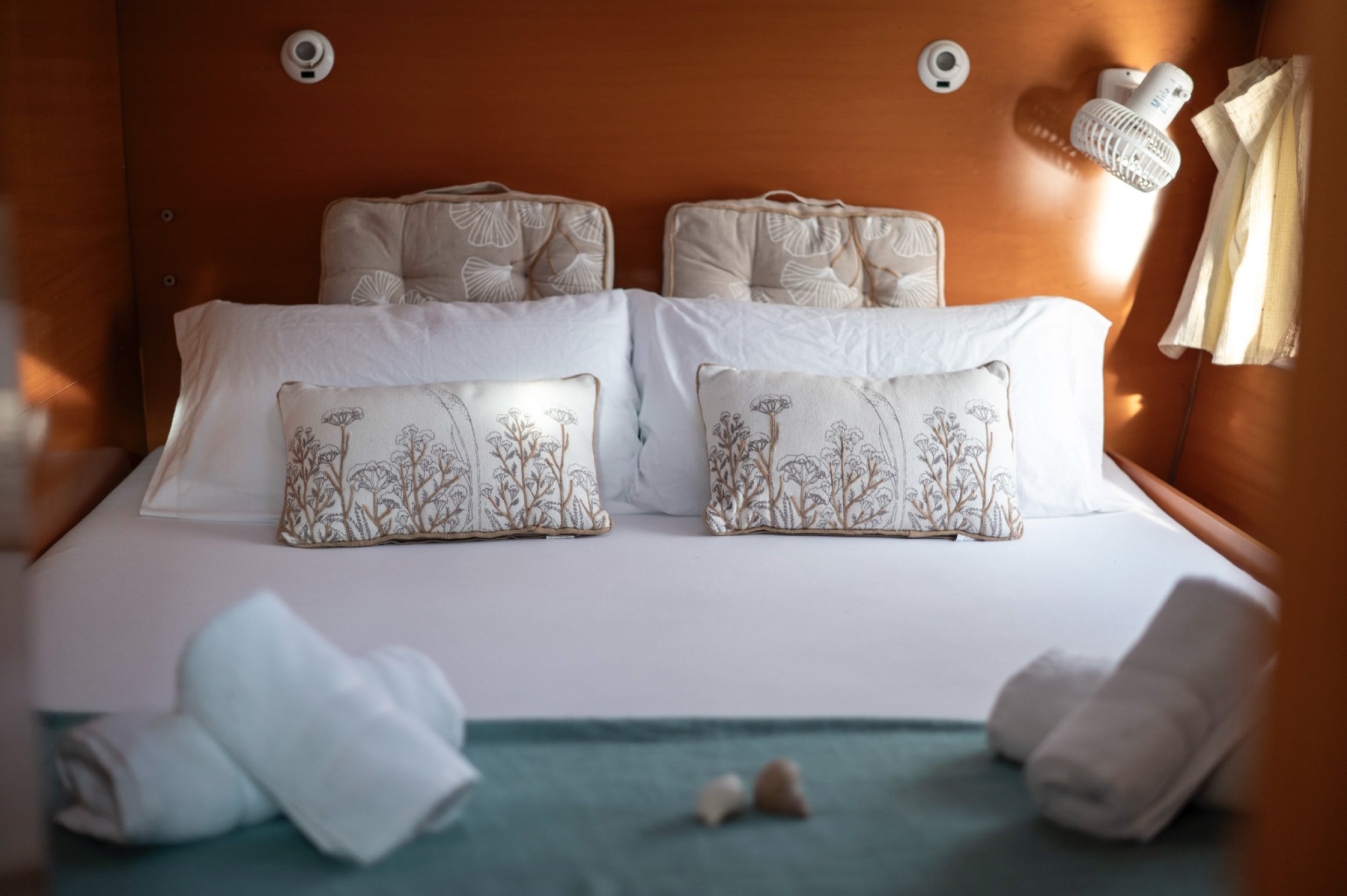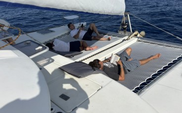 Stability and Deck Space: As a multihull, sailing is smooth with no uncomfortable heeling. The bow with its nets (trampolines) is the sacred spot for sunbathing, reading, or feeling the breeze as we sail toward Formentera.