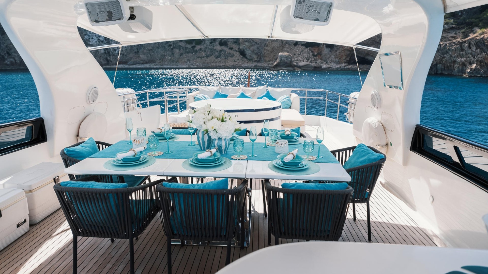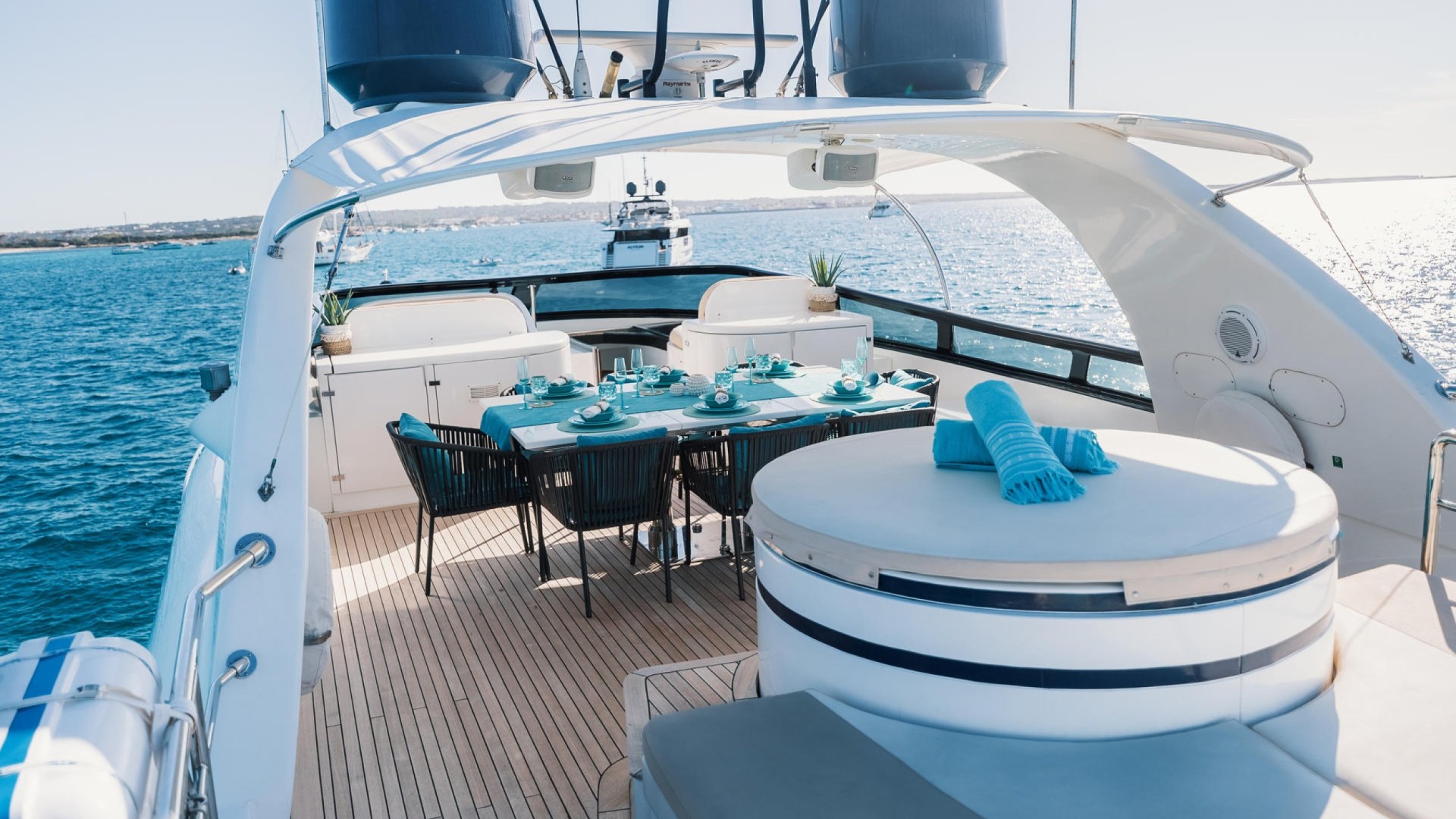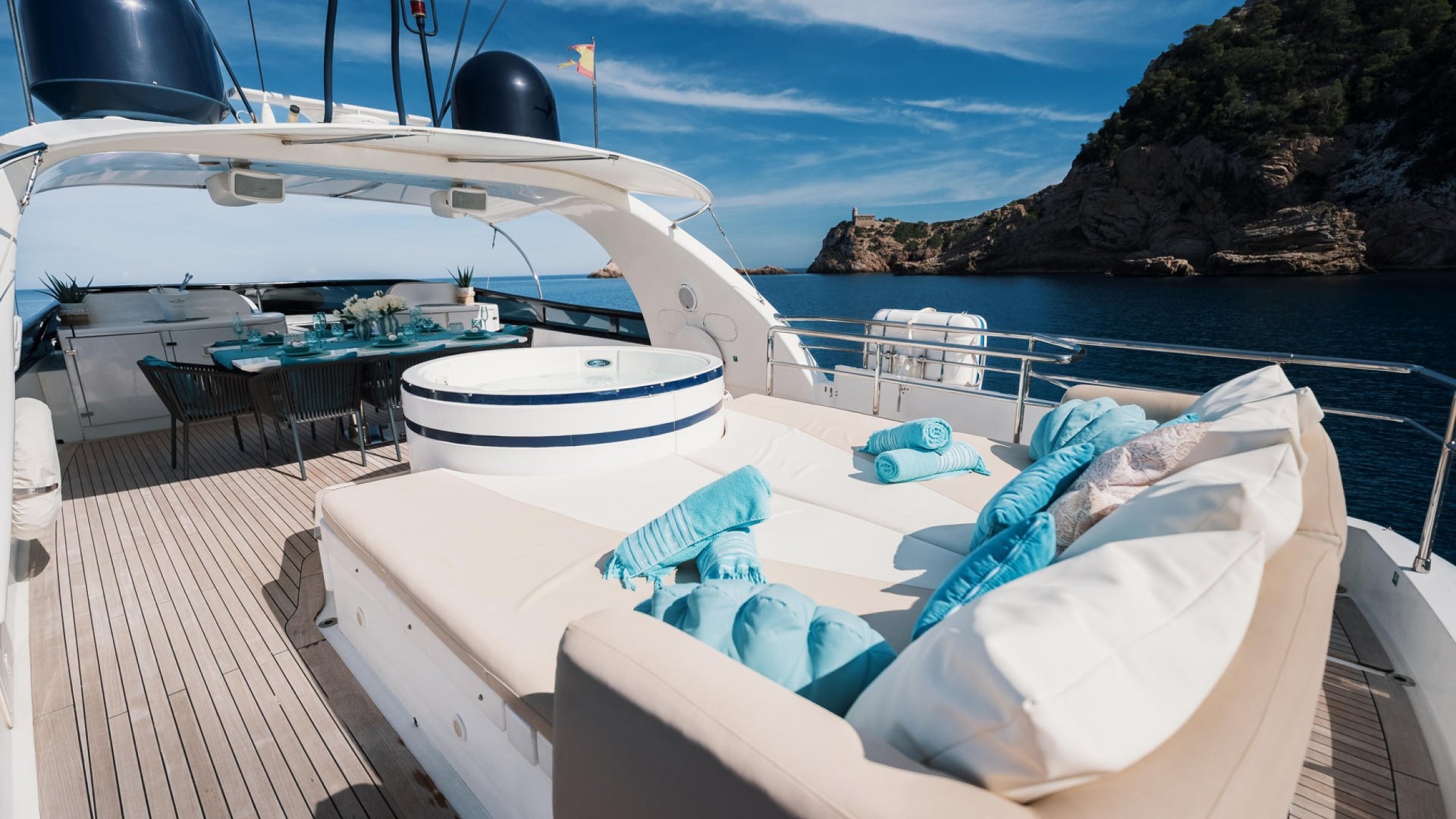Flybridge with Jacuzzi: The crown jewel. An expansive upper deck offering 360° panoramic views, a wet bar, al fresco dining area, and a spectacular jacuzzi to relax as the sun sets over Es Vedrà.
