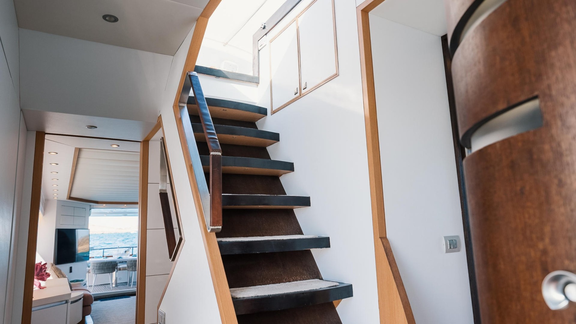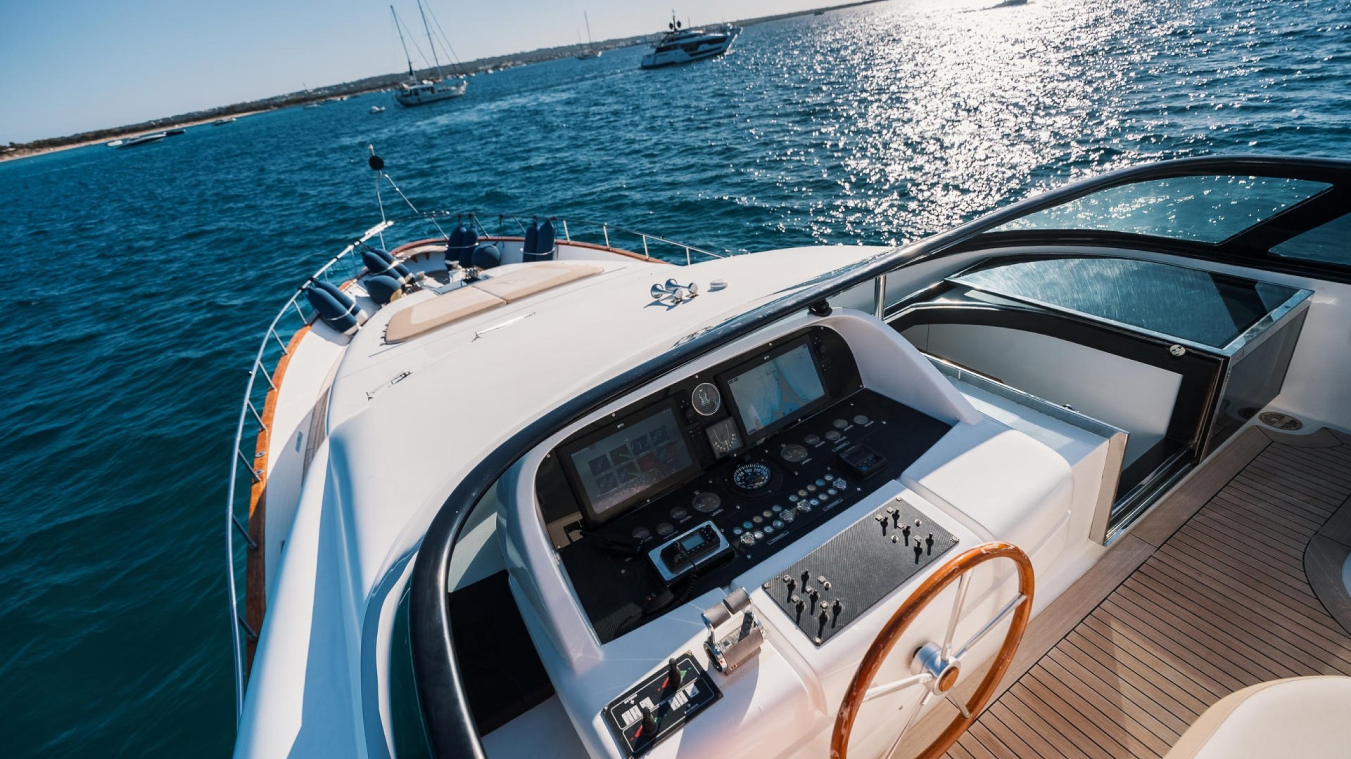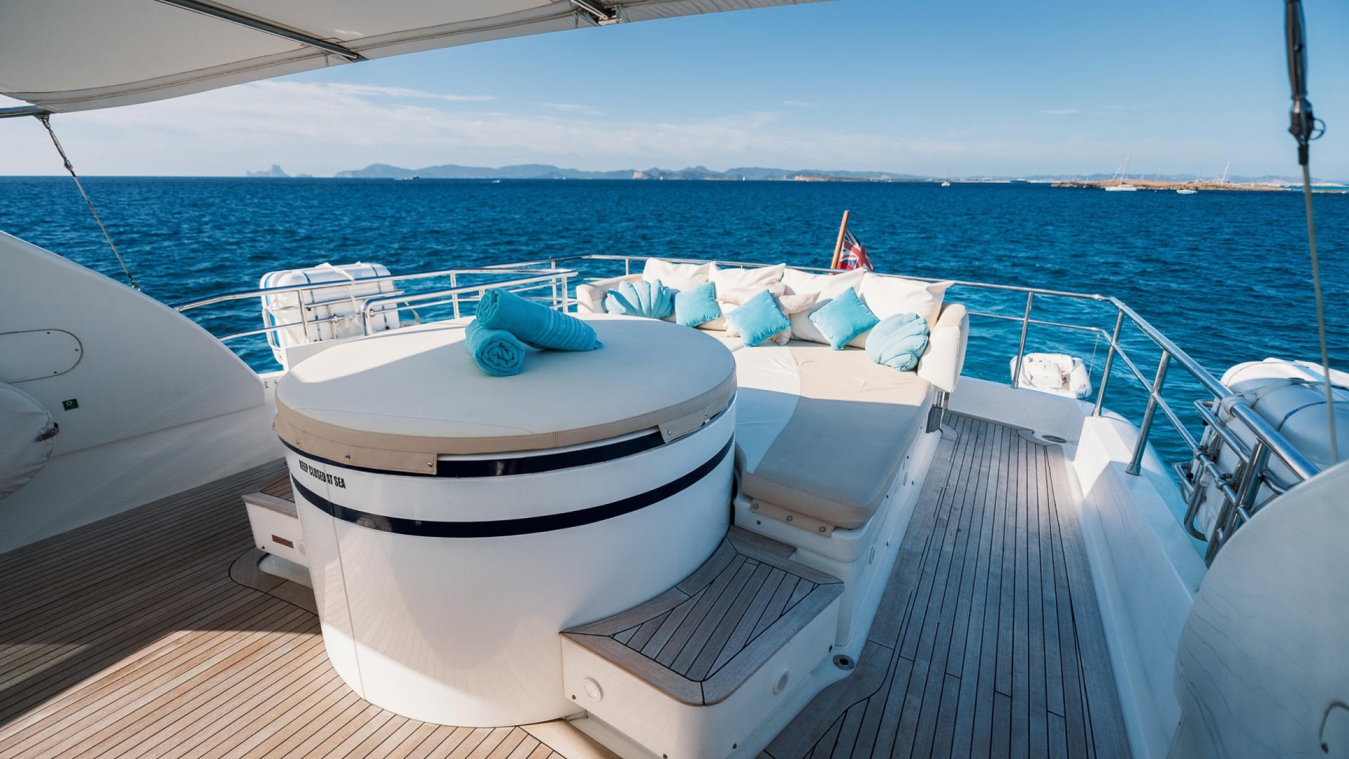 Flybridge with Jacuzzi: The crown jewel. An expansive upper deck offering 360° panoramic views, a wet bar, al fresco dining area, and a spectacular jacuzzi to relax as the sun sets over Es Vedrà.