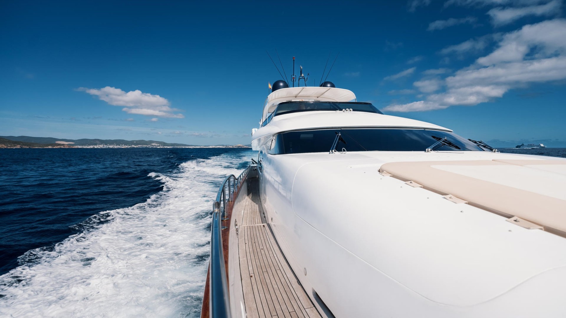 With a length overall (LOA) of 28.5 meters, this superyacht combines classic Italian elegance with an interior volume rarely matched in her class. Her navy blue hull and imposing presence make her the center of attention, whether at anchor off the coast of Formentera or entering Marina Botafoch. She is the ultimate choice for families or exclusive groups seeking privacy, absolute comfort, and “white-glove” service.