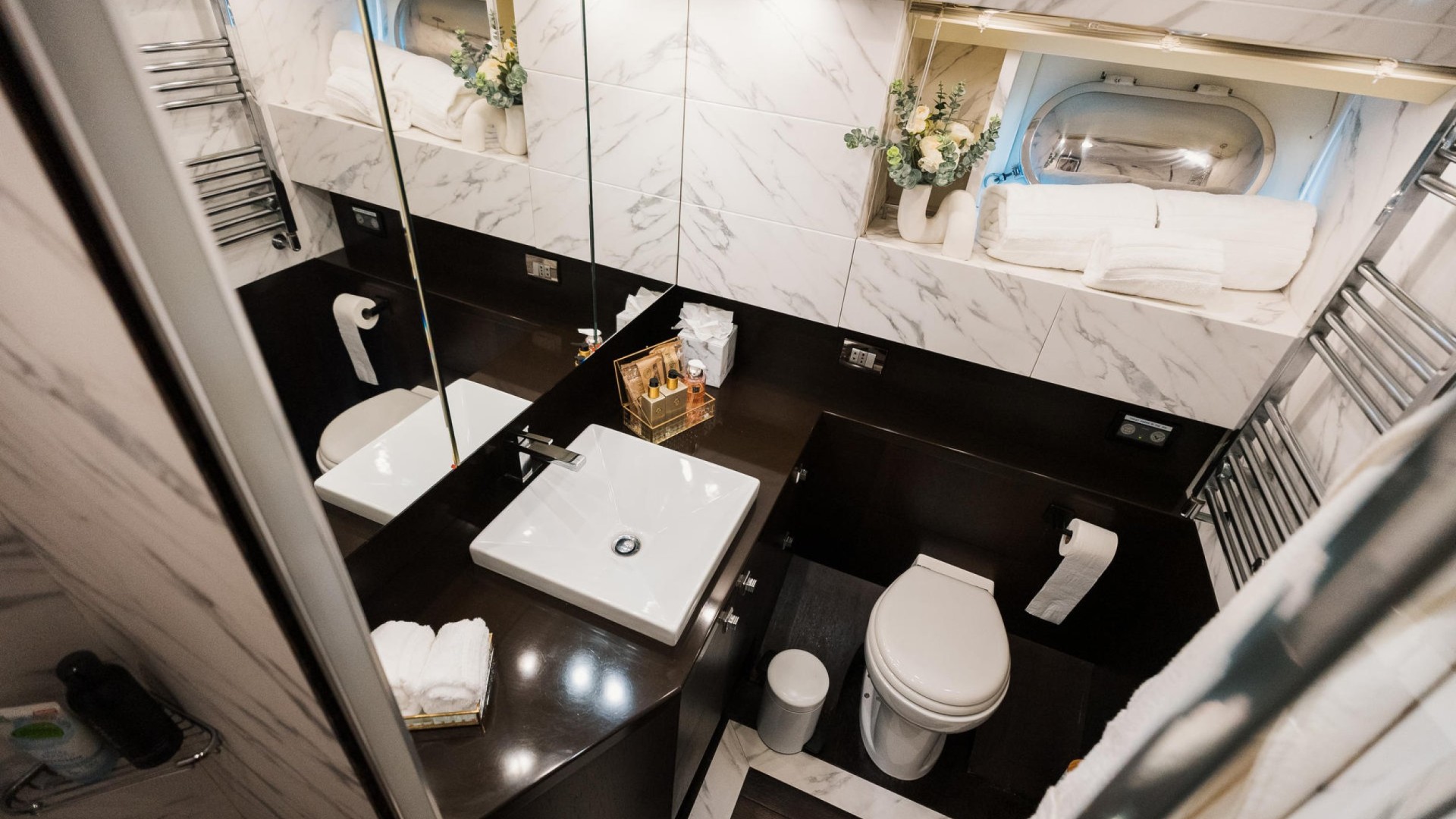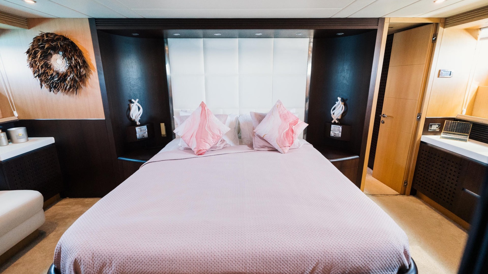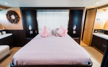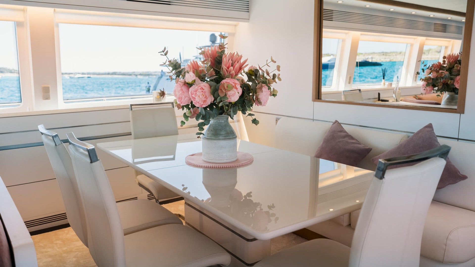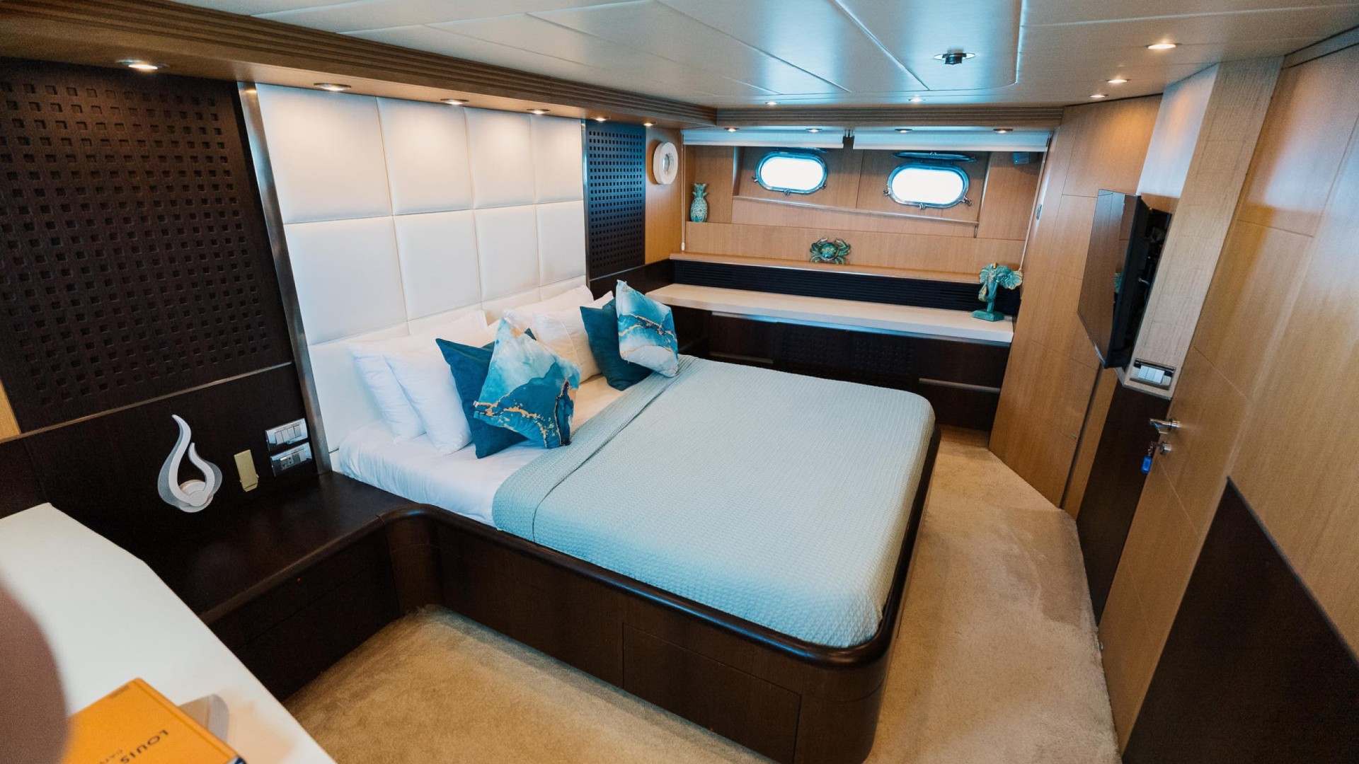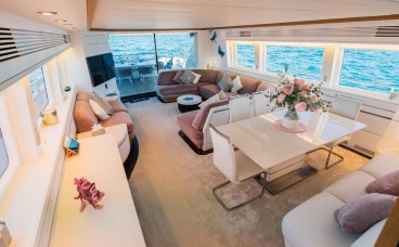 Designer Interior: The main saloon stands out with its panoramic windows and velvet furniture in powder tones. She features 4 luxurious cabins (3 doubles and 1 twin with an additional Pullman berth), accommodating 9 guests overnight in total comfort.