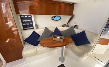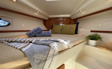 Luxury Interior Comfort: Her cabin, finished in fine woods and high-end materials, includes a convertible saloon, fully equipped galley, and a full head, offering a climate-controlled private sanctuary to escape the sun.