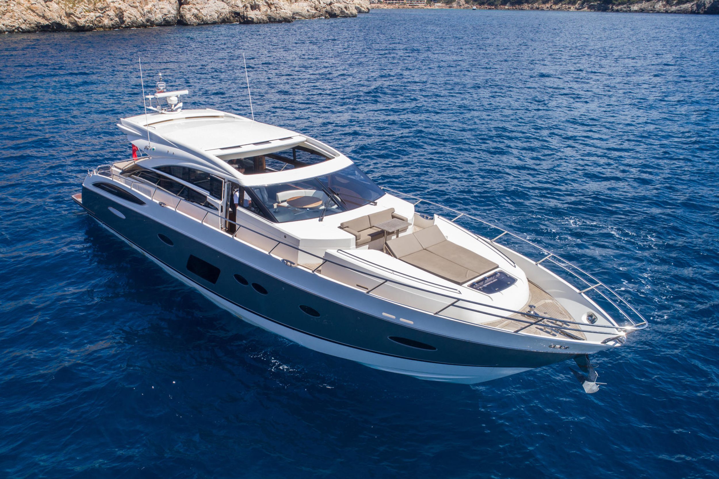 The Princess V72 Ruby Tuesday is the personification of the perfect balance between sporting thoroughbred power and British luxury sophistication, making her one of the most coveted vessels in Ibiza waters. Her greatest strength lies in a deep-V hull designed to deliver exceptionally smooth, fast, and precise handling, allowing for crossings to Formentera with a stability that conveys absolute confidence even at high speeds. This unit stands out for her commanding profile of fluid lines and her generous electric sunroof, which, when opened, transforms the main saloon into an outdoor space bathed in Mediterranean light and breeze.On deck, Ruby Tuesday offers a masterful layout that maximizes outdoor enjoyment, featuring a generously sized bow sunpad and an aft cockpit that integrates seamlessly with a state-of-the-art hydraulic bathing platform. The interior is a sanctuary of contemporary design where natural light takes center stage, highlighted by three spacious en-suite staterooms finished with noble materials and high-end textiles worthy of a luxury suite. She is the definitive choice for those seeking an elegant and powerful presence at sea, combining surprising interior liveability with a sporting spirit that guarantees a dynamic and unforgettable cruising experience.