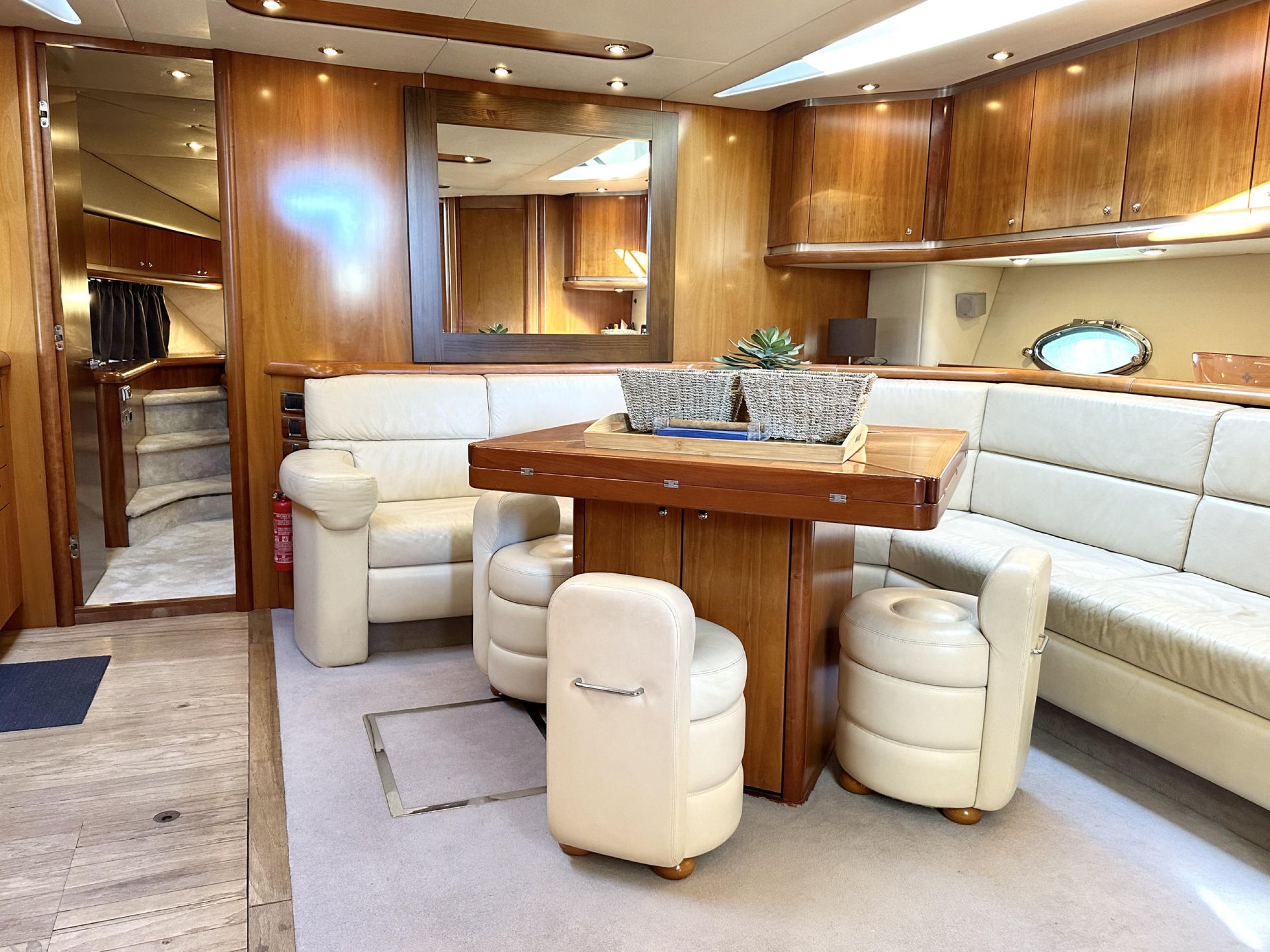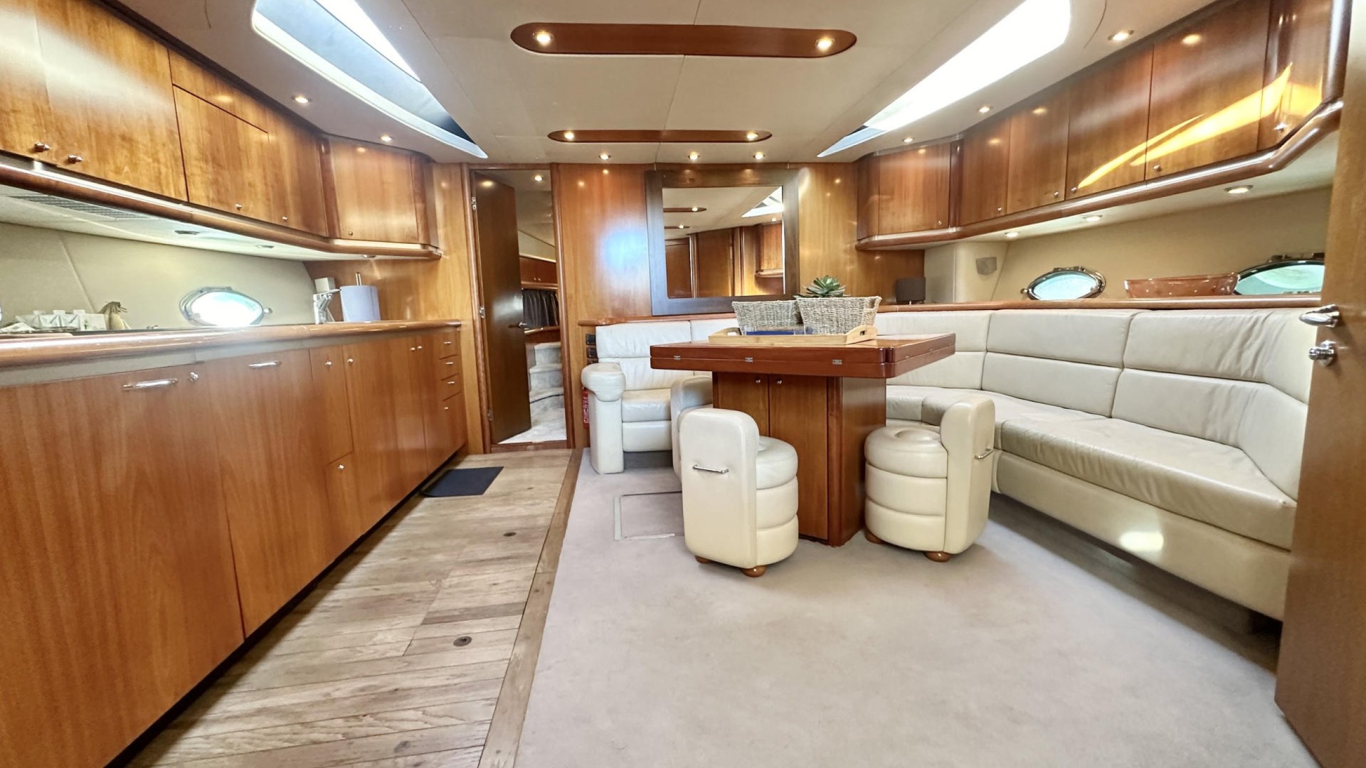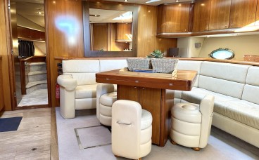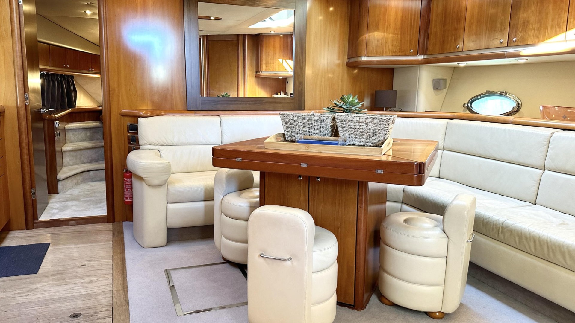 Luxury Saloon: A spacious interior with cherry wood finishes and white leather upholstery, creating a warm, sophisticated ambiance for relaxing in total privacy.