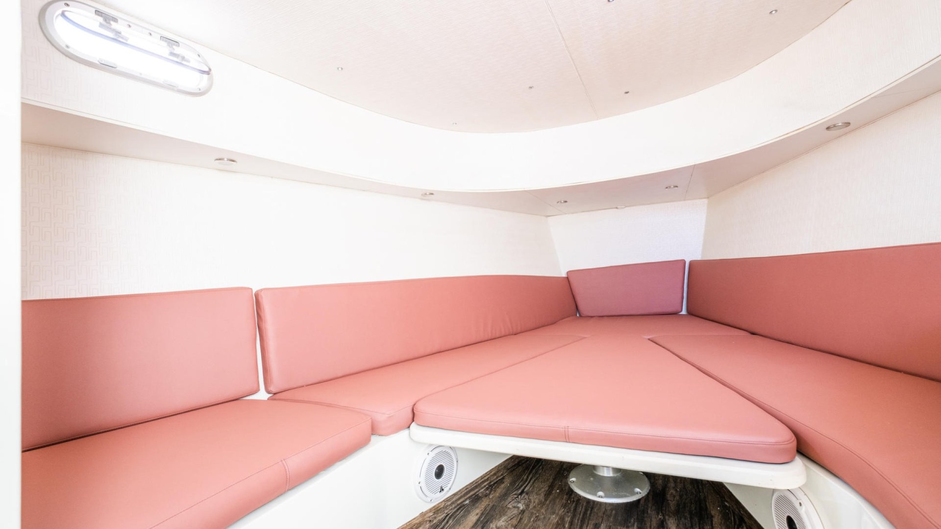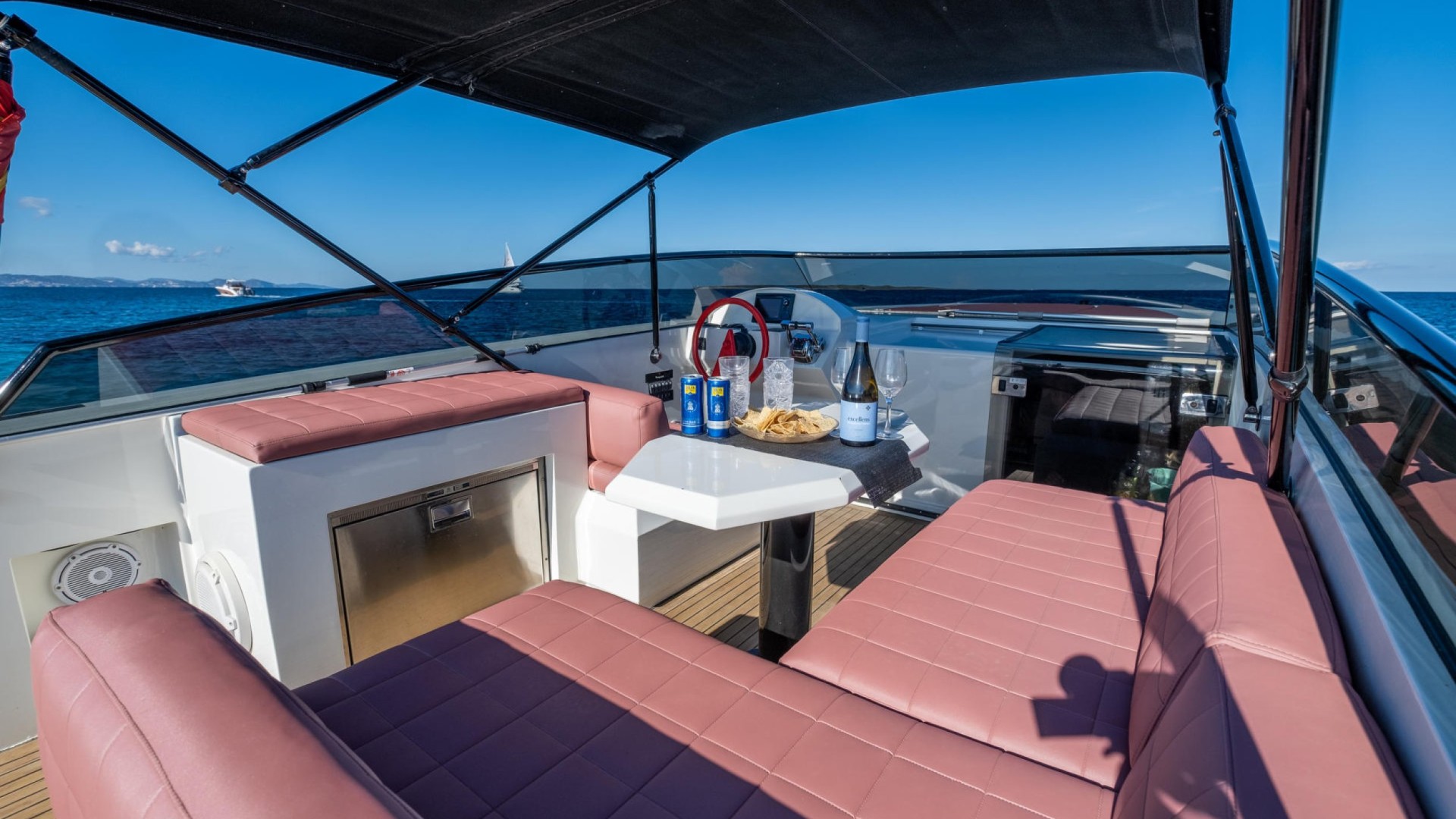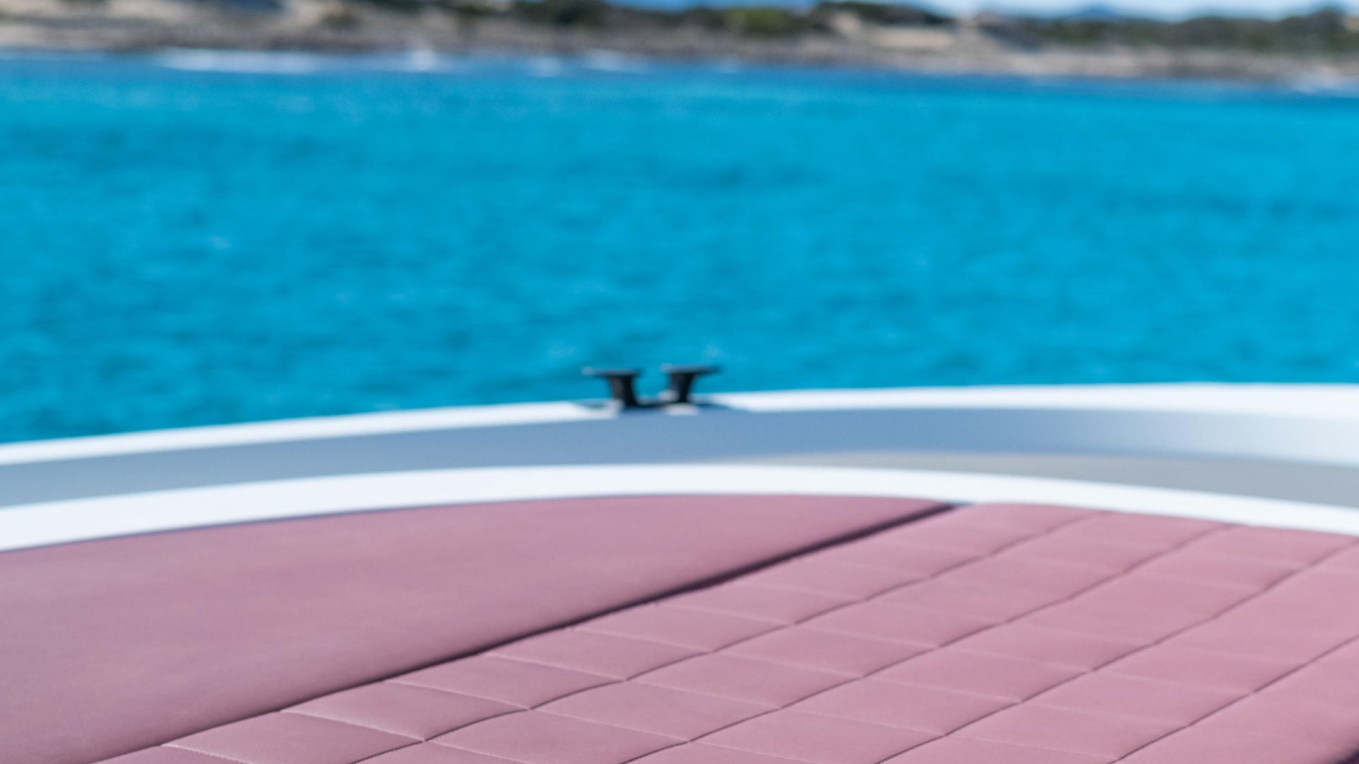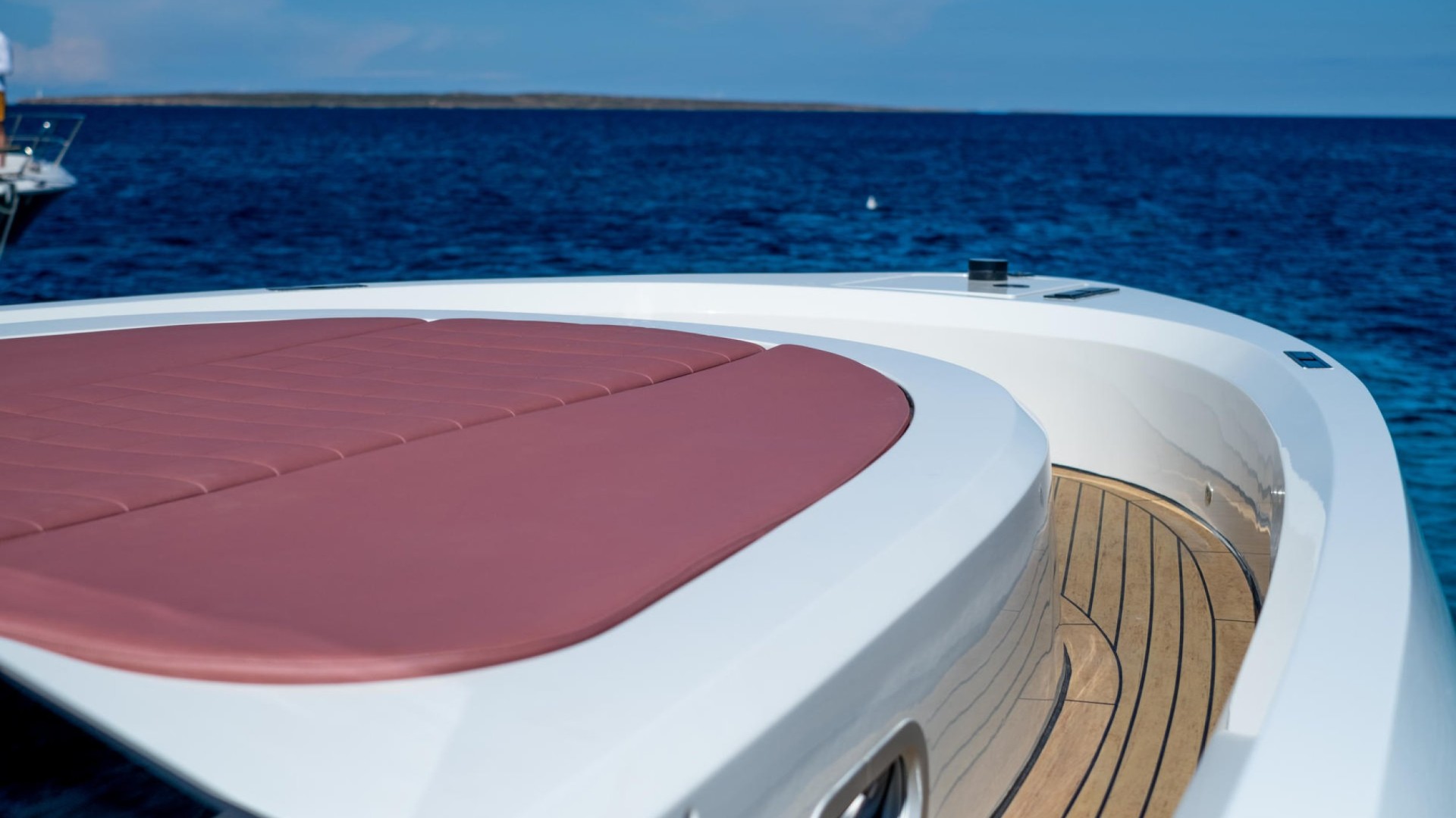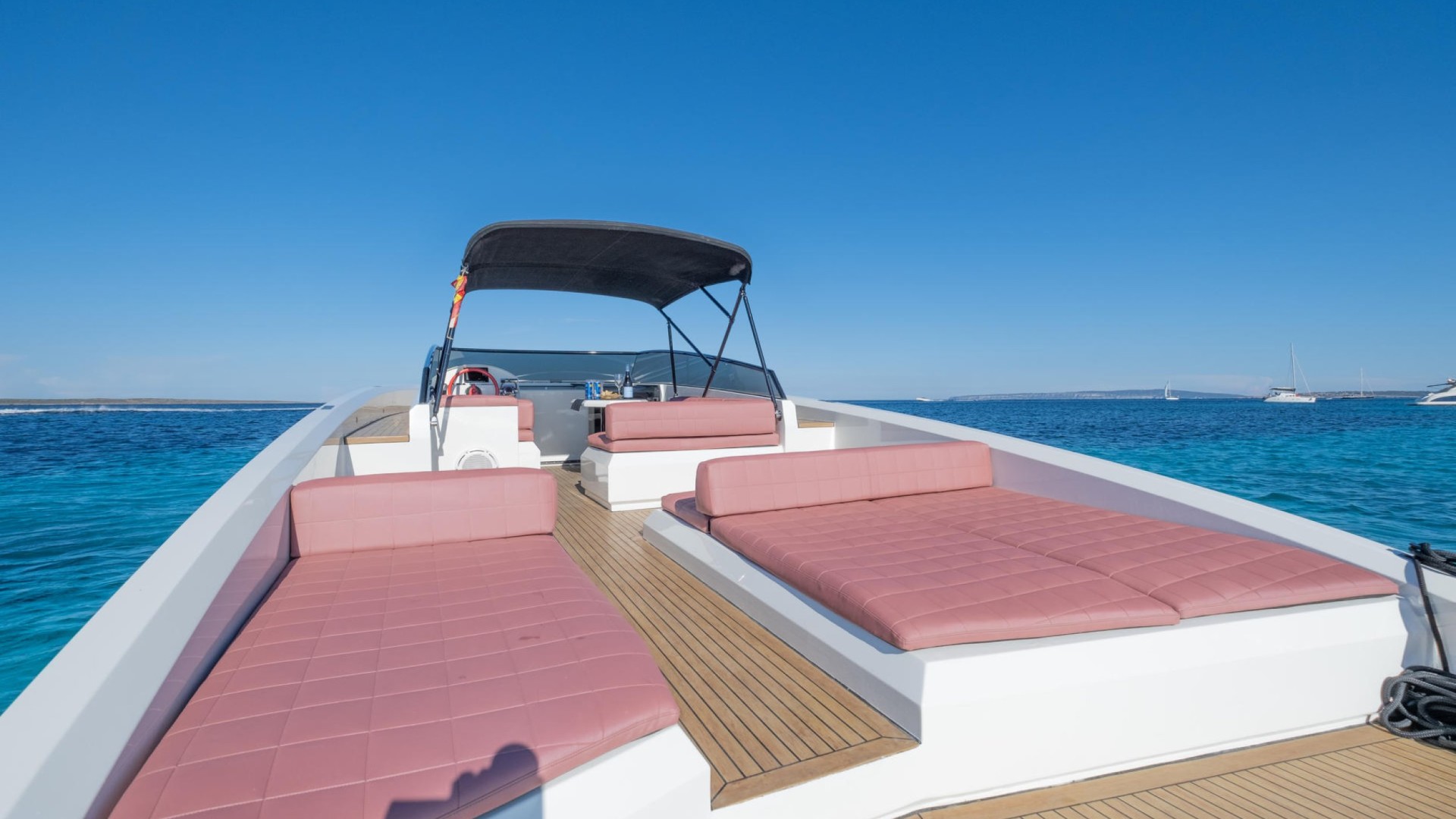 Premium Solariums: Equipped with spacious lounging areas at the bow and stern featuring high-resistance upholstery in rose tones, perfect for relaxing under the sun after a swim in Formentera’s crystal-clear waters.