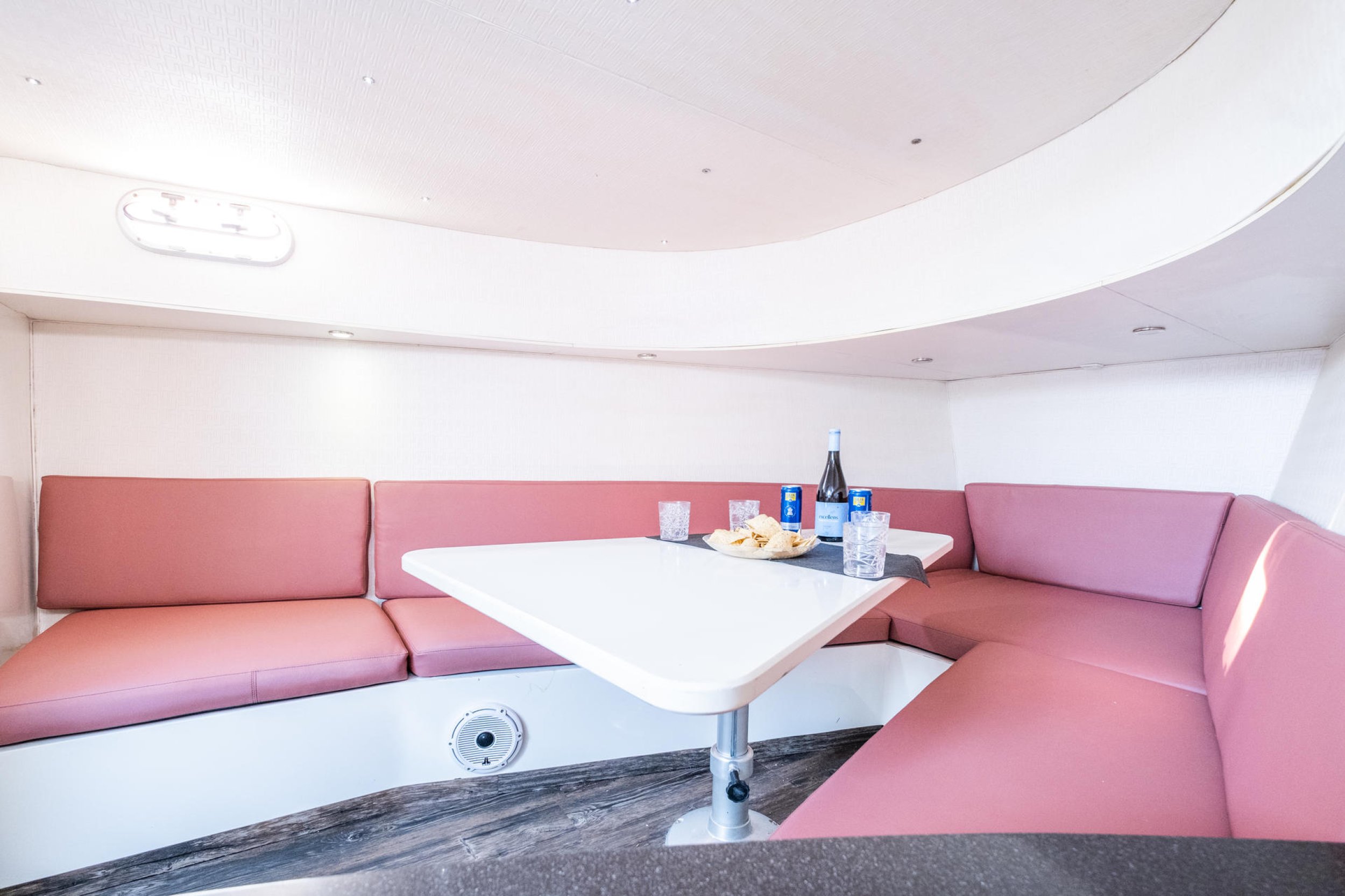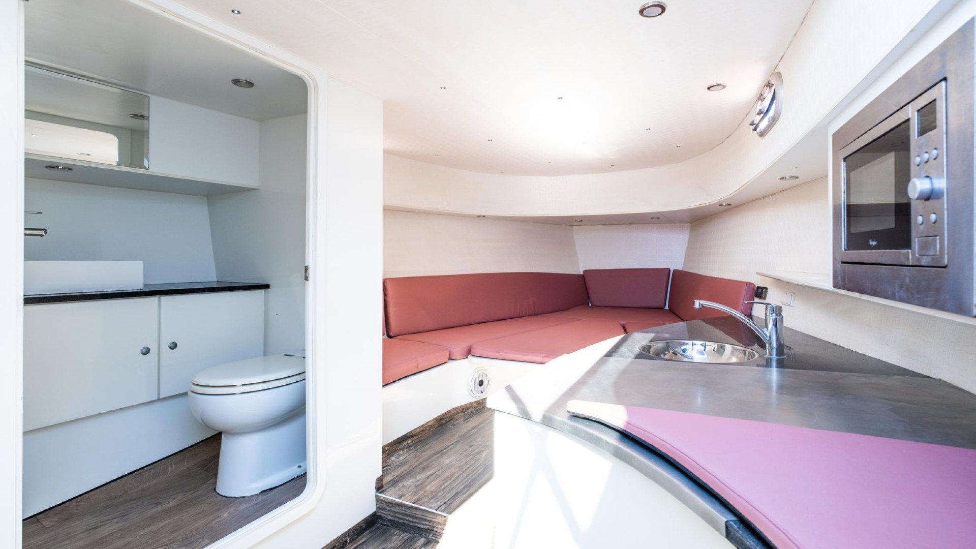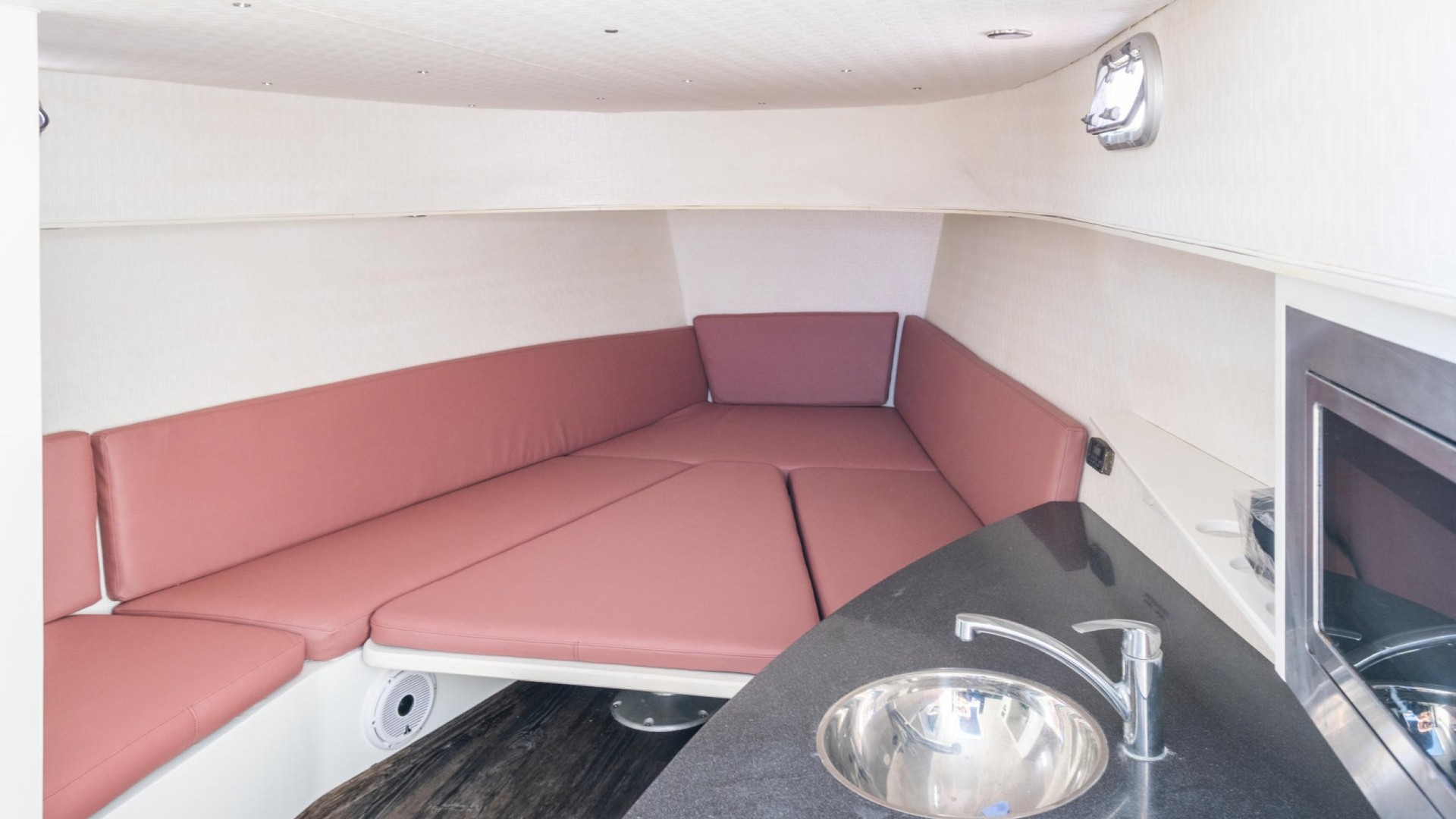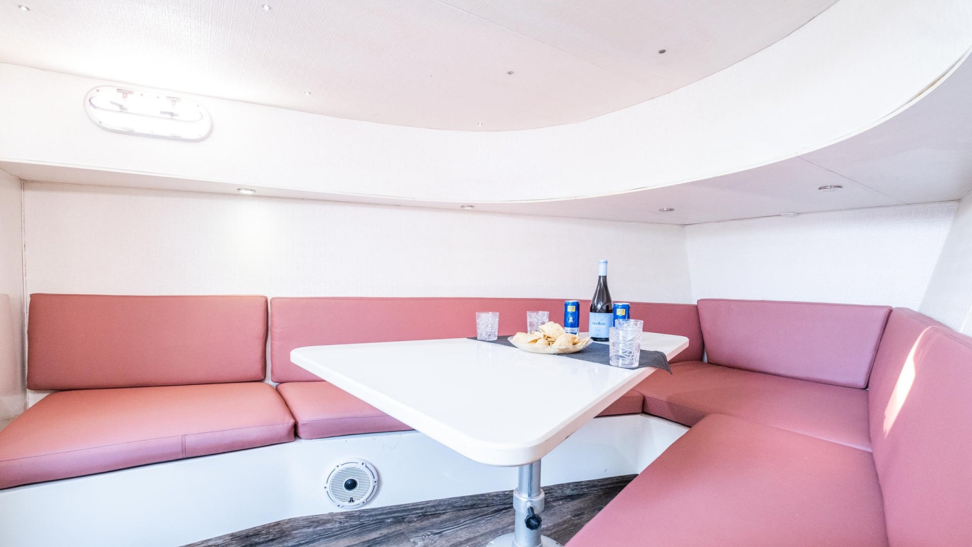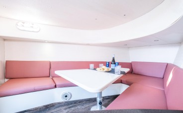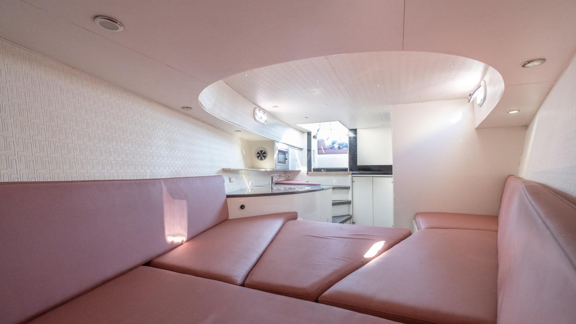 Surprising Interior Lounge: Below deck, “Tequila” offers a climate-controlled lounge with a clean, modern design, featuring a generous sofa area and table—perfect for a private break or an appetizer in the shade.