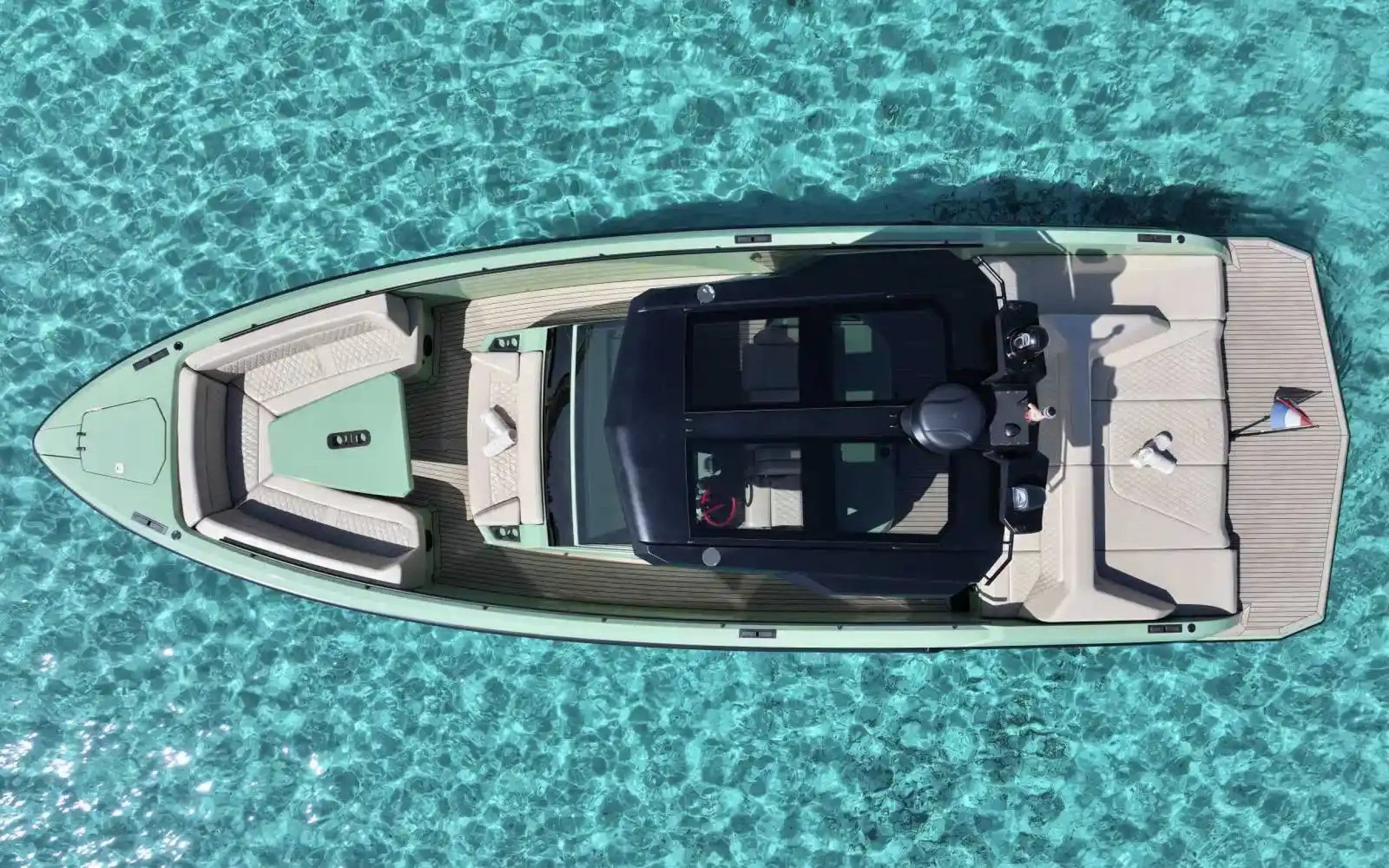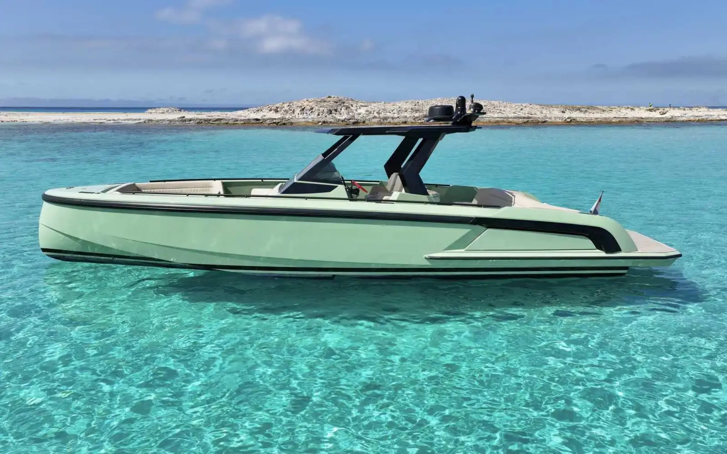 The Vanquish VQ40 «In Sync» is the definition of agility and disruptive style in Ibiza’s waters, a unit that encapsulates the Dutch shipyard’s “we do things differently” philosophy in a compact and extremely powerful format.With its 12-meter LOA (Length Overall), this vessel, built in high-quality composite, stands out for its iconic stepped hull and an aerodynamic profile that seems designed to cut the wind even while moored. Unlike traditional pleasure craft, the «In Sync» opts for a minimalist and aggressive aesthetic, where every line serves a functional and visual purpose, offering a sailing platform that feels as solid as a block of granite yet possesses the lightness of an elite sports car.It is a boat designed to live in the present with absolute intensity, capable of reaching speeds exceeding 40 knots with almost instantaneous helm response. Its open deck is meticulously configured for social interaction, allowing guests to move freely between the bow solarium and the aft lounge area, always protected by a hull that ensures exceptionally dry and stable cruising. Featuring a high-fidelity sound system and a design exuding modern sophistication, the VQ40 «In Sync» is the ultimate choice for those seeking a day boat with an overwhelming personality and impeccable technical performance.