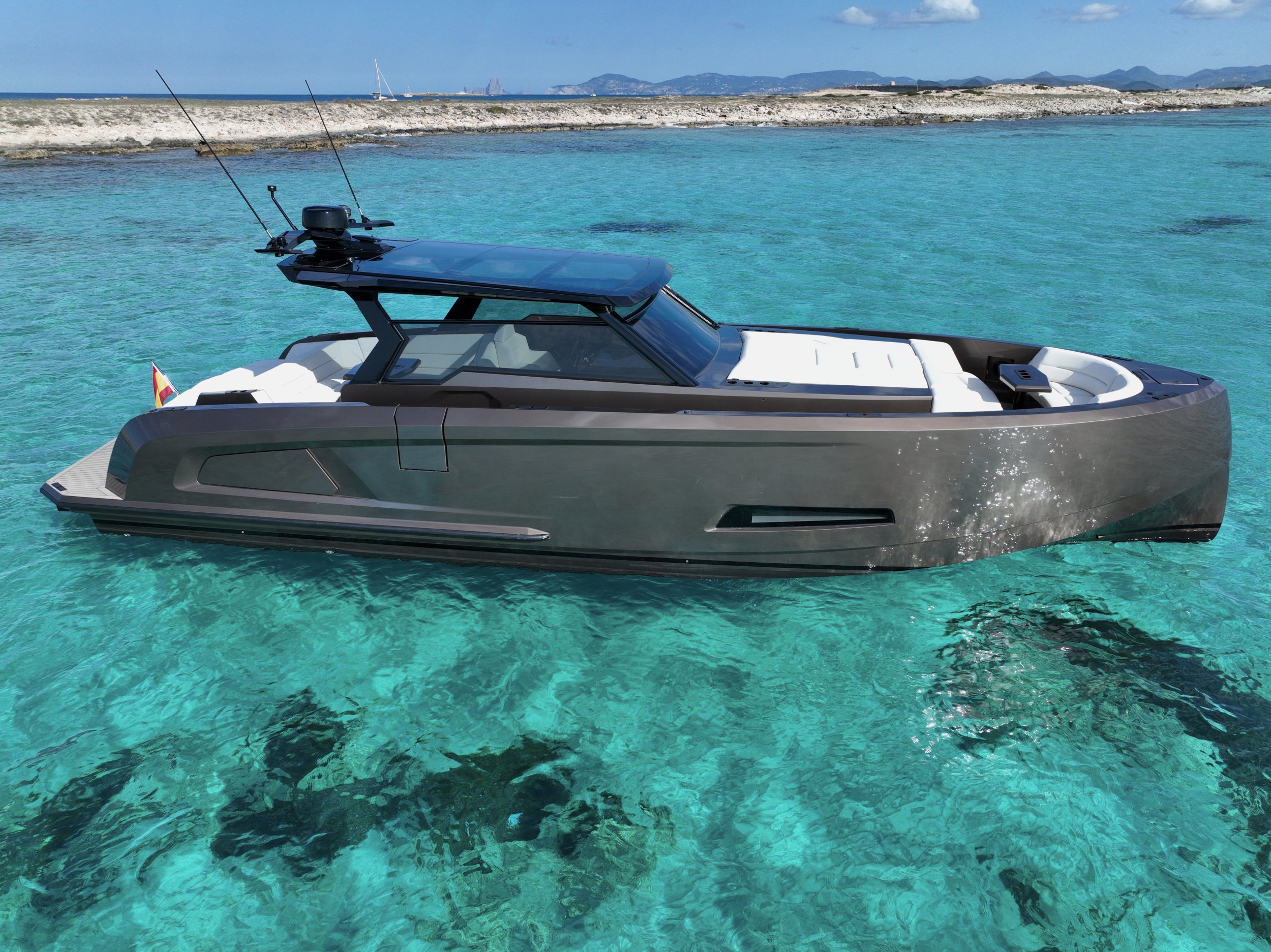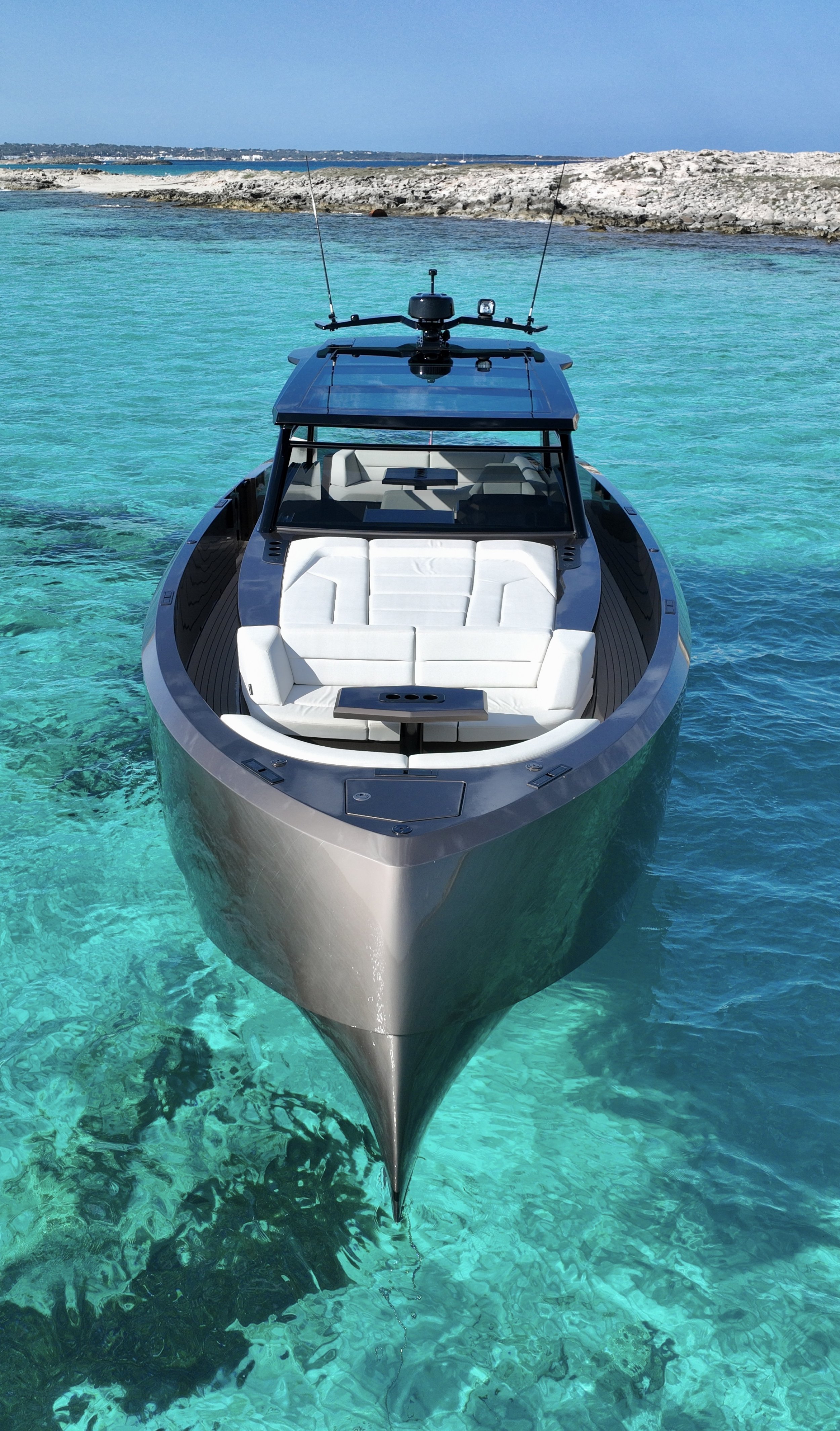 The Vanquish VQ45 T-Top “Media Naranja” is perhaps one of the most iconic and photographed vessels on the Ibiza yachting scene. This yacht not only represents cutting-edge Dutch engineering but has also become a symbol of modern luxury cruising thanks to its disruptive design and unmistakable personality. With a length overall (LOA) of 14 meters, this unit—handcrafted in marine-grade aluminum—stands out for its signature vertical bow and commanding T-Top, which offers a unique architectural silhouette while providing essential shade for the Mediterranean climate. Unlike mass-produced GRP (fiberglass) boats, “Media Naranja” possesses a structural rigidity that allows it to handle the sea with a steadiness and quietness that surprises even the most seasoned mariners, keeping the deck completely dry even at high speeds. Designed for dynamic exclusivity, it is capable of exceeding 40 knots with ease thanks to its lightweight, high-strength hull. The deck is a masterpiece of social functionality, featuring expansive sunpads at the bow and stern, a high-end wet bar, and a sound system tailored to turn any cove into a private event. With its minimalist interior and unmatched seekeeping (stability when crossing waves), “Media Naranja” is the definitive choice for those seeking a yacht that combines advanced naval engineering with the vibrant Balearic lifestyle.