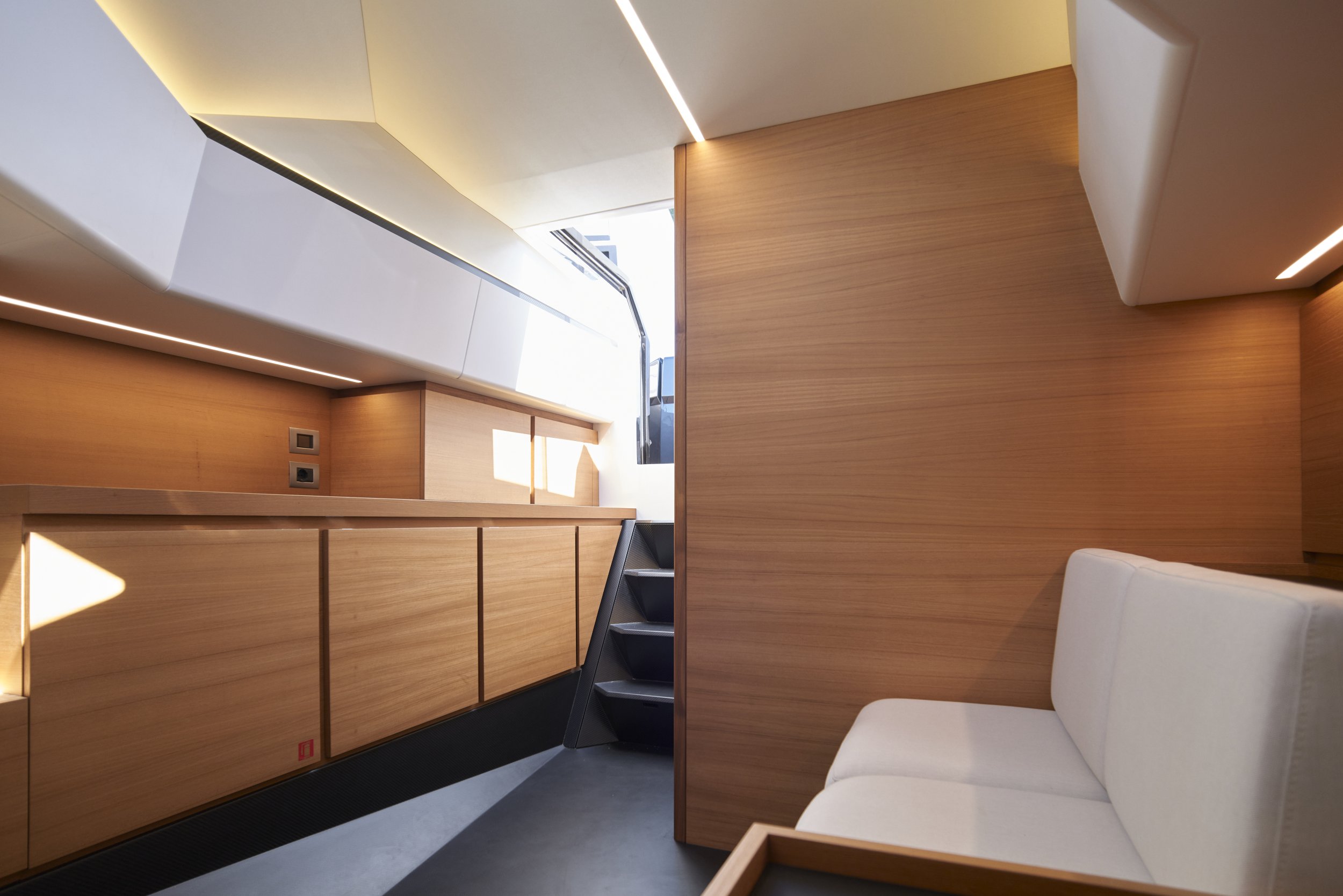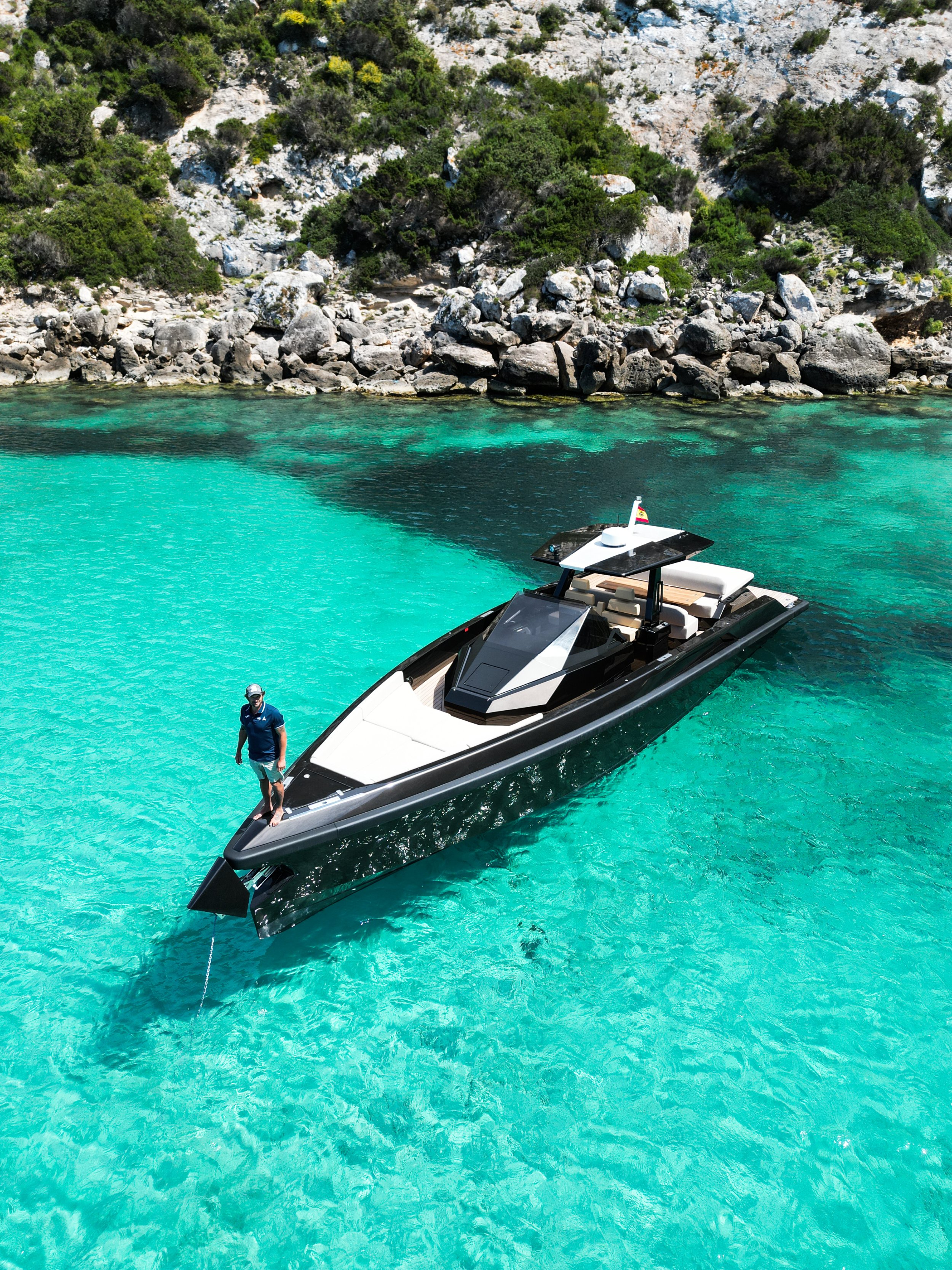 The Wallytender 48 “Jemima” is the quintessence of Monegasque nautical purism—a yacht that redefines the concept of a support vessel to become an independent design icon, where tactical functionality and minimalist aesthetics reach their ultimate expression.With an LOA (Length Overall) of 14.5 meters, this unit commands attention with its unmistakable vertical bow and angular carbon fiber hull, granting it a stealthy and powerful presence on the water. Unlike conventional day-cruisers, whose profiles are interrupted by hardware and fittings, the “Jemima” features a completely clear flush deck, where every element—from the cleats to the anchor—is concealed to preserve absolute visual purity.Designed for limitless entertainment, she stands out for her innovative folding bulwarks at the stern which, when deployed, transform the swim area into a vast private terrace over the sea. Equipped with an engine package that allows her to approach 38 knots with unwavering stability, the Wally 48 glides with silky smoothness even in choppy sea conditions. Boasting an avant-garde interior with a luxury suite for overnight stays, she is the definitive choice for those seeking a design that doesn’t just sail, but dictates the rules of style on the world’s most exclusive coastlines.