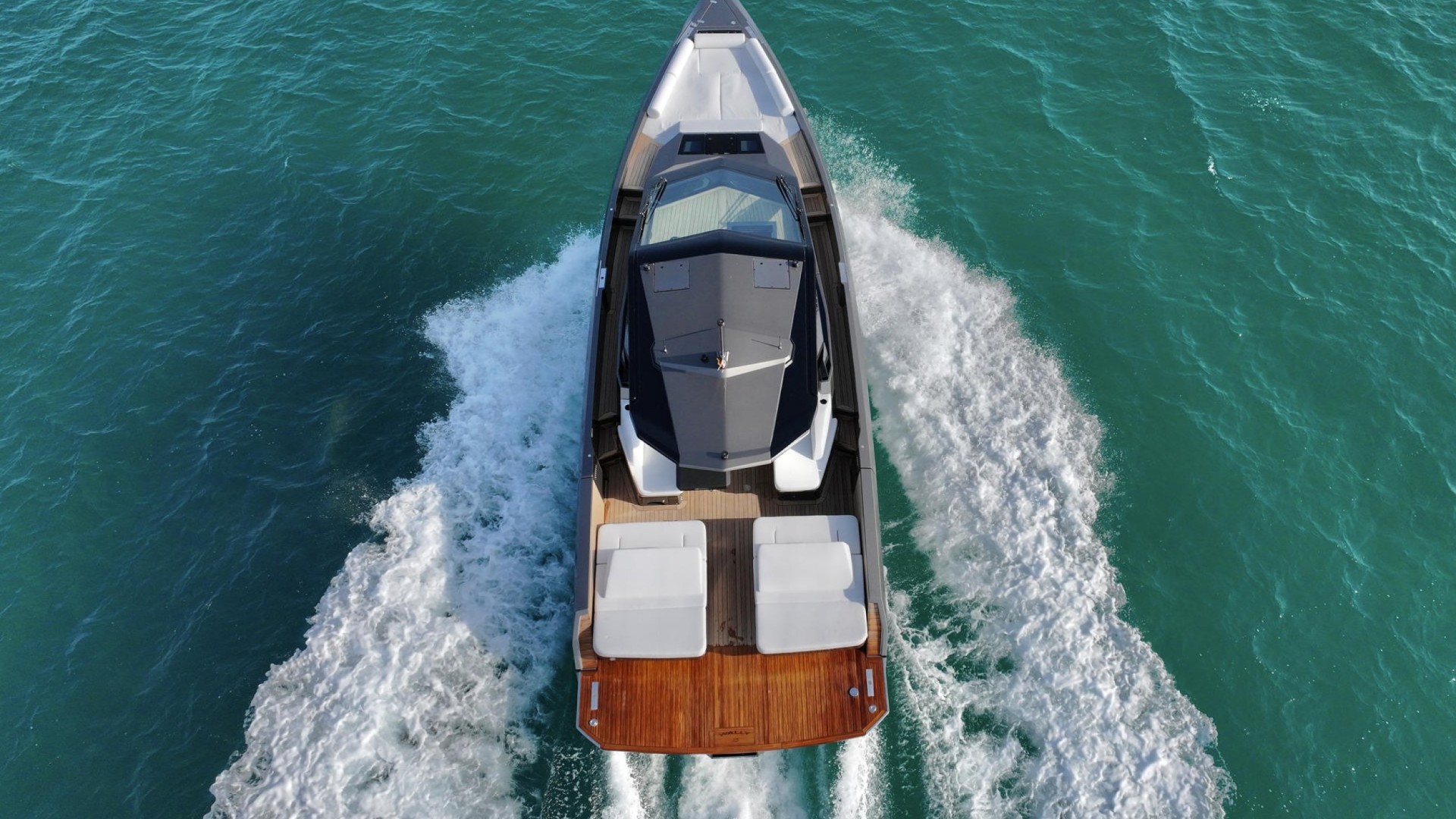 “Terrace on the Sea” Deck: The open-transom design featuring folding bulwarks expands the available space, creating an authentic private terrace at water level to enjoy the Ibiza sun.