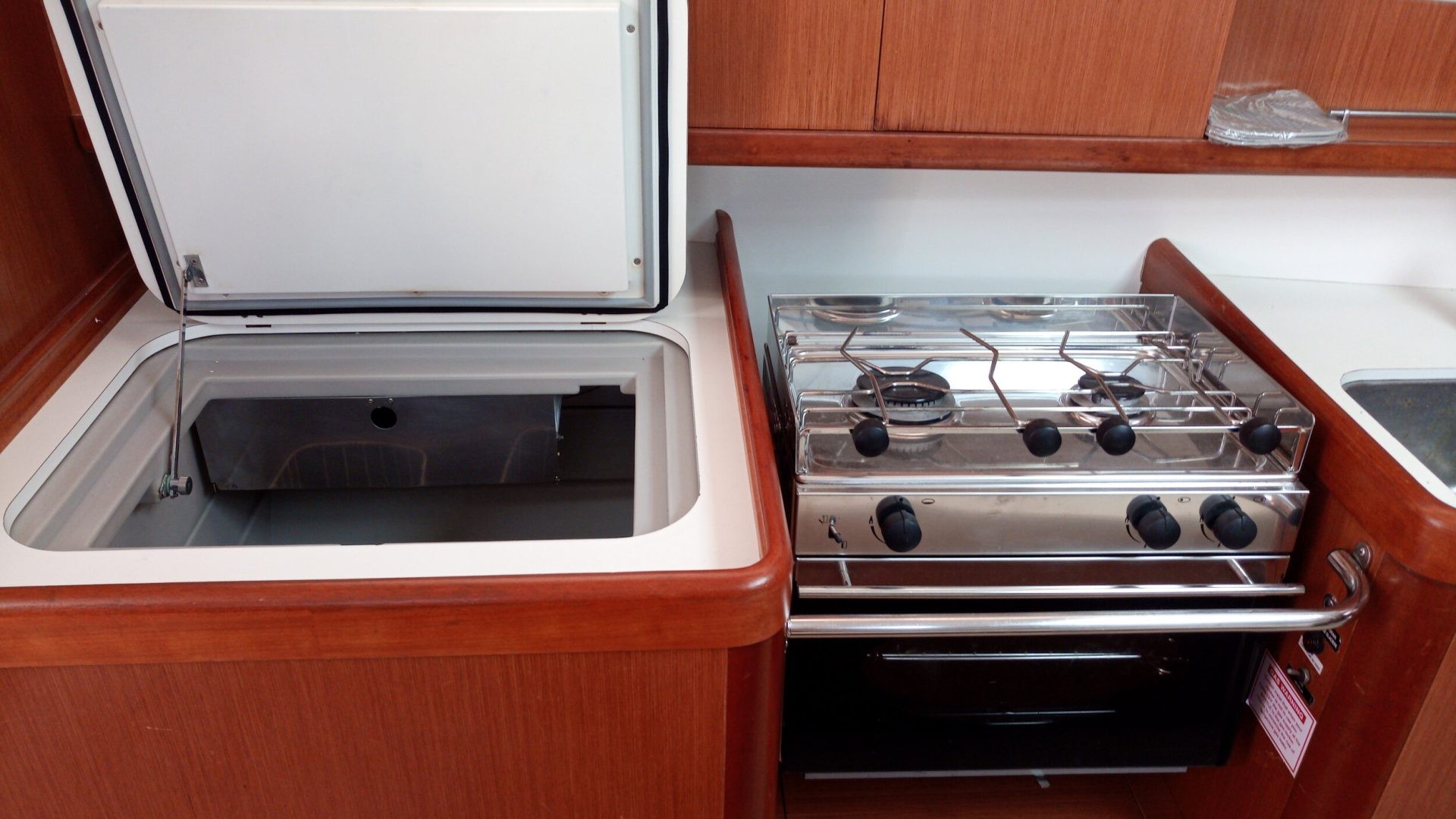 Gourmet-Ausstattung und Komfort: Die Pantry ist komplett ausgestattet mit Backofen, Edelstahlofen und einer großen elektrischen Toplader-Kühlbox – ideal, um den Champagner beim Ankern vor Es Vedrà auf der perfekten Temperatur zu halten.