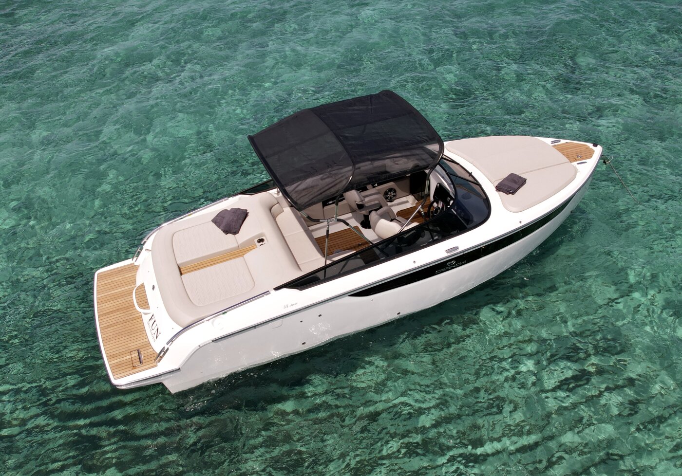 Designer-Stil & Zeitlose Ästhetik: Sein Vordeck aus Teakholz und die umlaufende Windschutzscheibe erinnern an den Glamour der Dolce Vita und bieten ein anspruchsvolles Profil, das jedes andere Boot dieser Rumpflänge übertrifft.