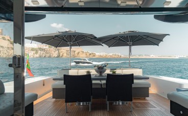 Open-Deck-Design: Die Konfiguration ist auf das gesellschaftliche Leben unter der Sonne ausgerichtet. Sie verfügt über riesige Sonnenliegen an Bug und Heck sowie einen Hauptsalon mit Panoramadach, das das Interieur perfekt mit der mediterranen Brise verbindet.