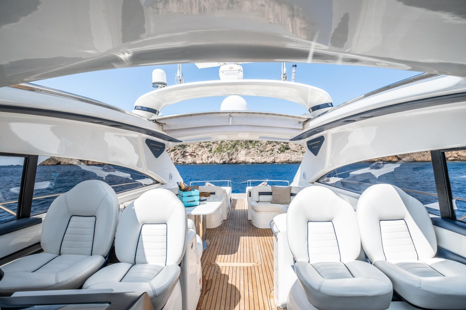 Open-Design und Großzügigkeit: Das weitläufige Achtercockpit und die großzügigen Sonnenliegen sind ideal, um die Sonne in voller Privatsphäre zu genießen. Das elektrische Hardtop ermöglicht es, den Salon in Sekundenschnelle zum Himmel hin zu öffnen und so das Interieur mit der Natur zu verschmelzen.