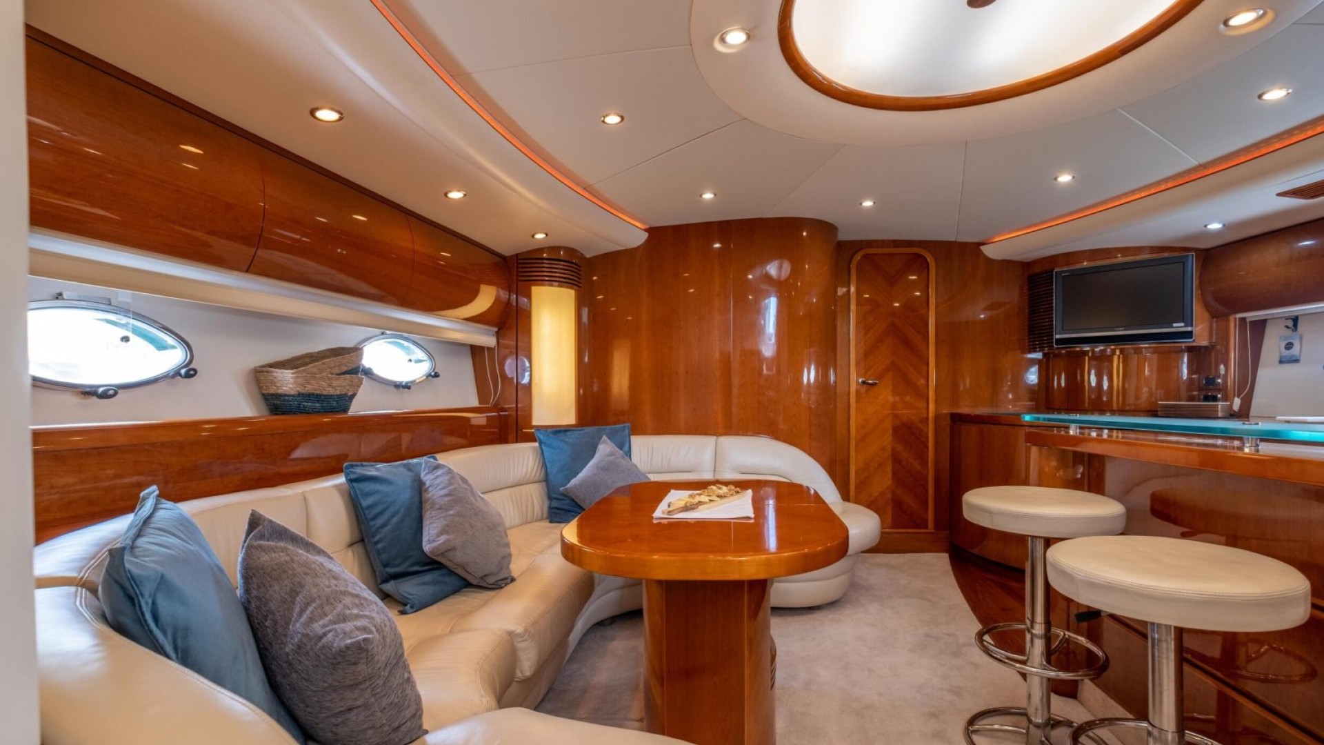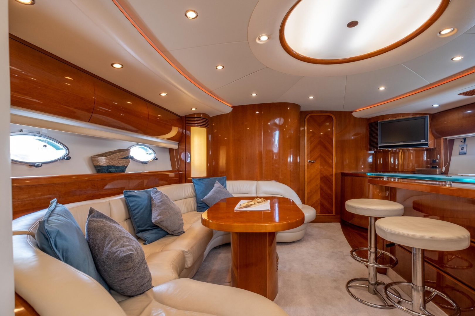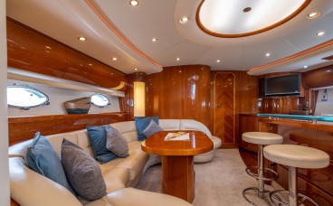Luxuriöses Interieur: Der Salon besticht durch Edelholz-Finishes und hochwertiges Leder, was ein anspruchsvolles und gemütliches Ambiente schafft, um nach einem Tag auf dem Wasser zu entspannen.