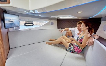 Mit einem fließenden Rumpfdesign und einer modernen Schwarz-Weiß-Ästhetik besticht dieses Modell durch seine optimale Raumausnutzung. Es ist das perfekte Boot zum Ankern in Ses Illetes und bietet ein riesiges vorderes Solarium sowie eine vielseitige Plicht, die zum Entspannen einlädt. Die Doppelmotorisierung von Mercury garantiert eine sanfte, schnelle und vor allem sichere Fahrt.