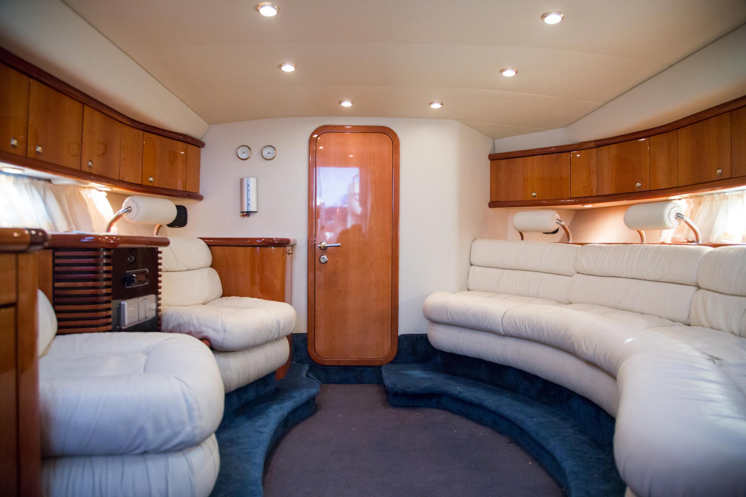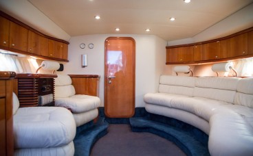 Exklusives Interieur: Der Salon ist ein luxuriöser Rückzugsort mit polierten Edelhölzern und halbmondförmigen weißen Ledersofas. Ein klimatisierter und gemütlicher Raum, um sich vom Sonnenbad zu erholen, ohne auf Stil zu verzichten.