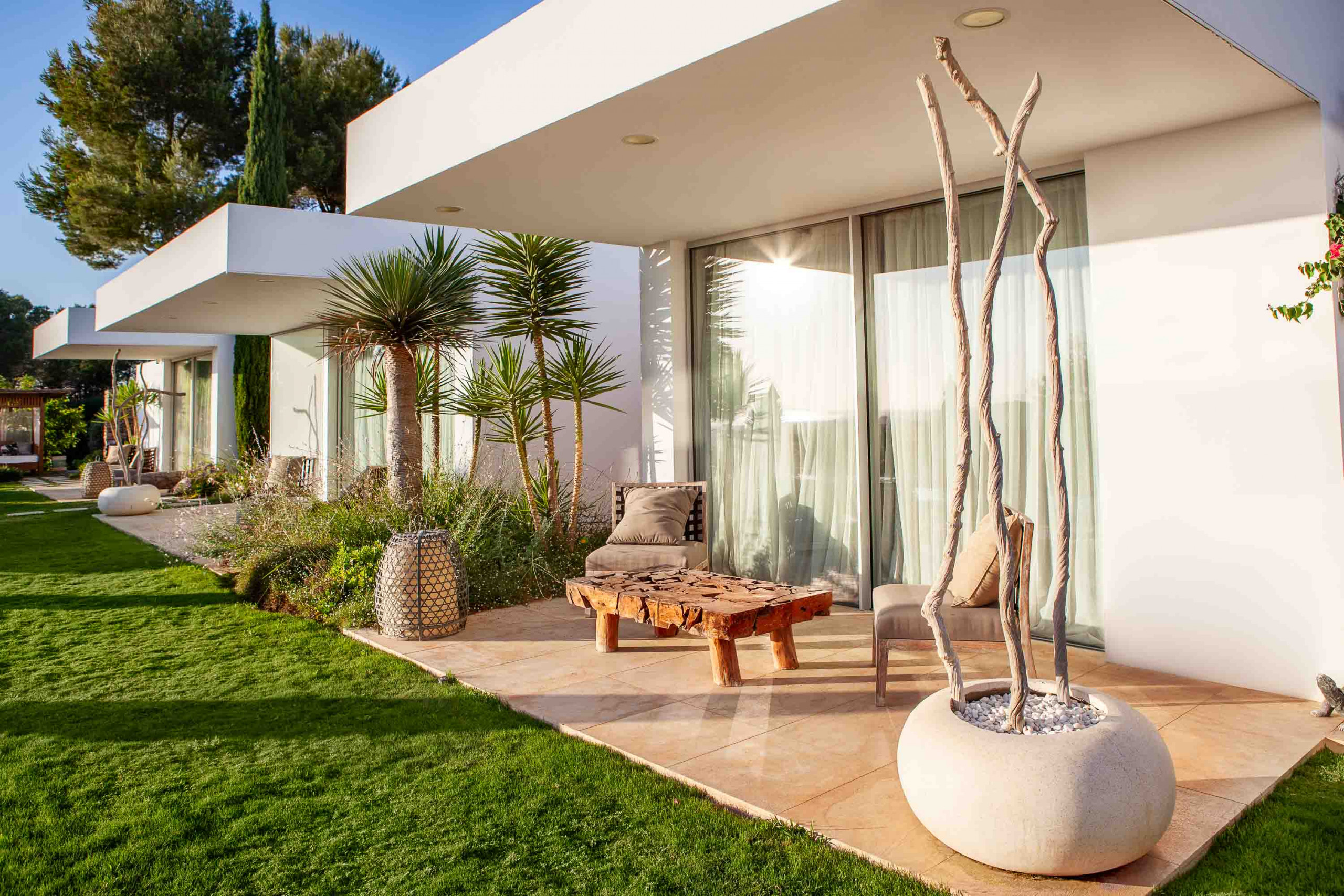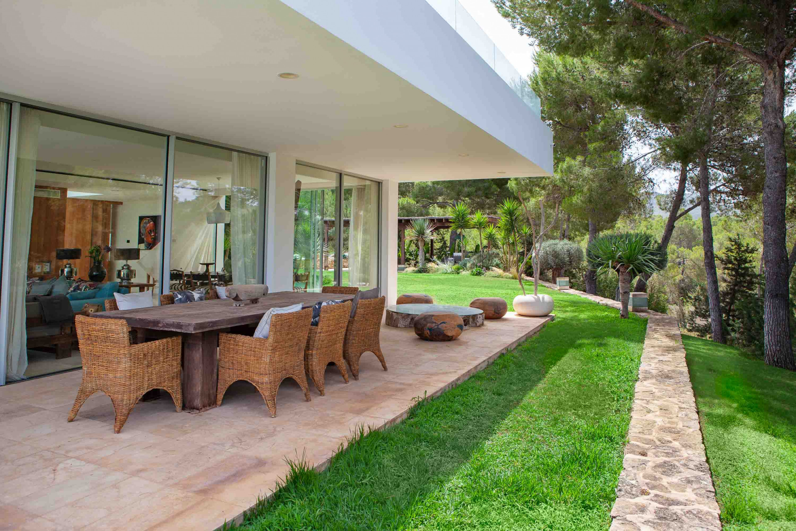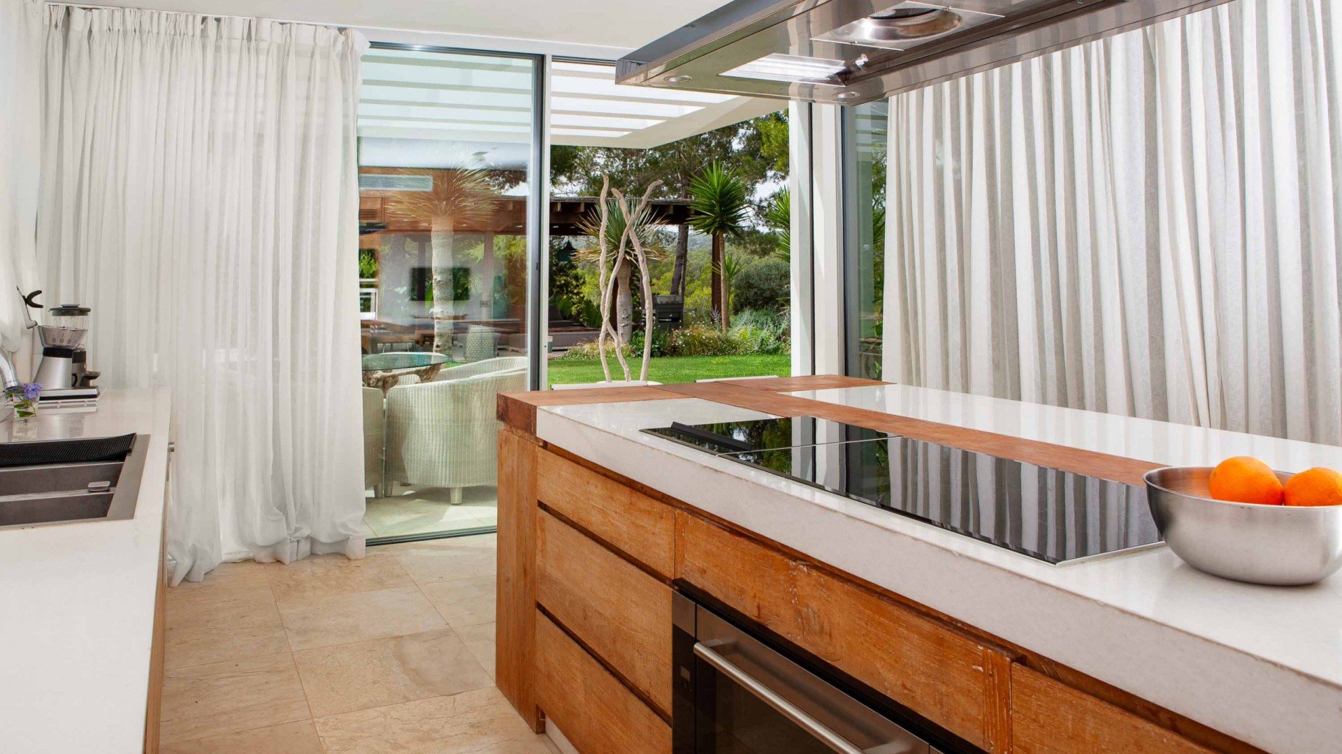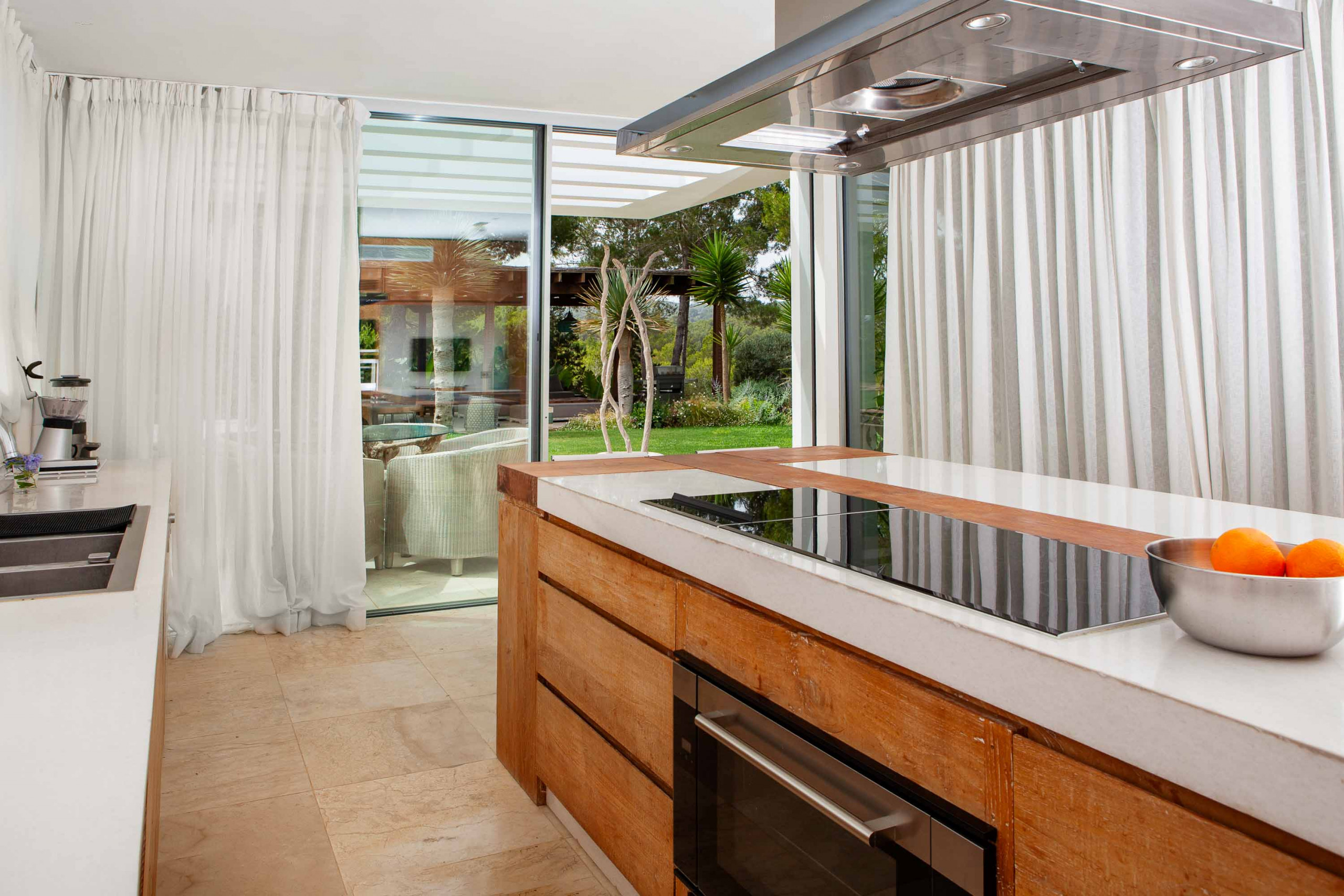 Al otro lado de la casa está la amplia cocina con salida a un patio exterior y a una enorme zona cubierta con una pérgola de comedor y zona de chill-out.
