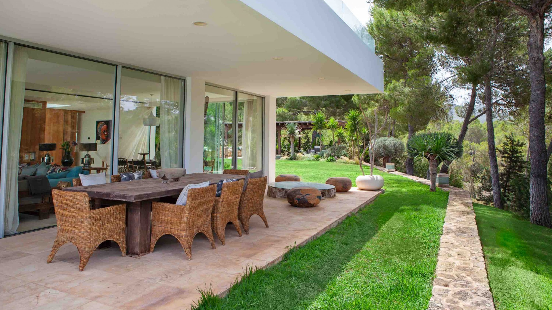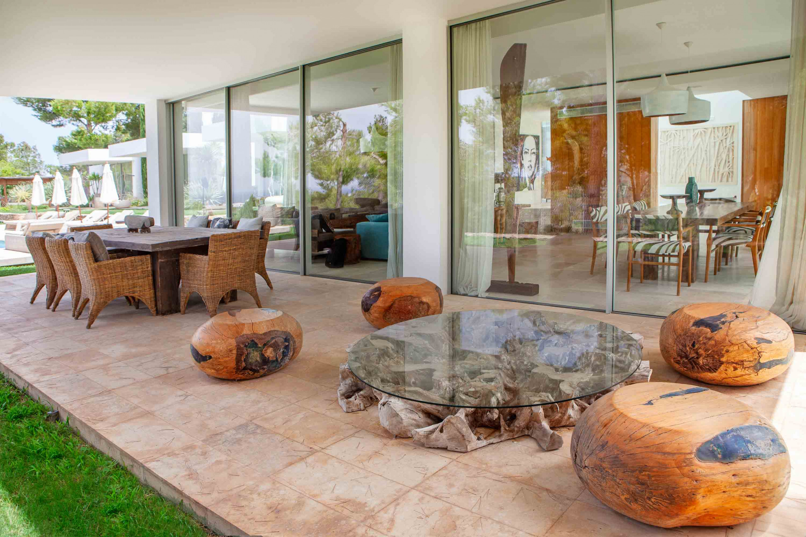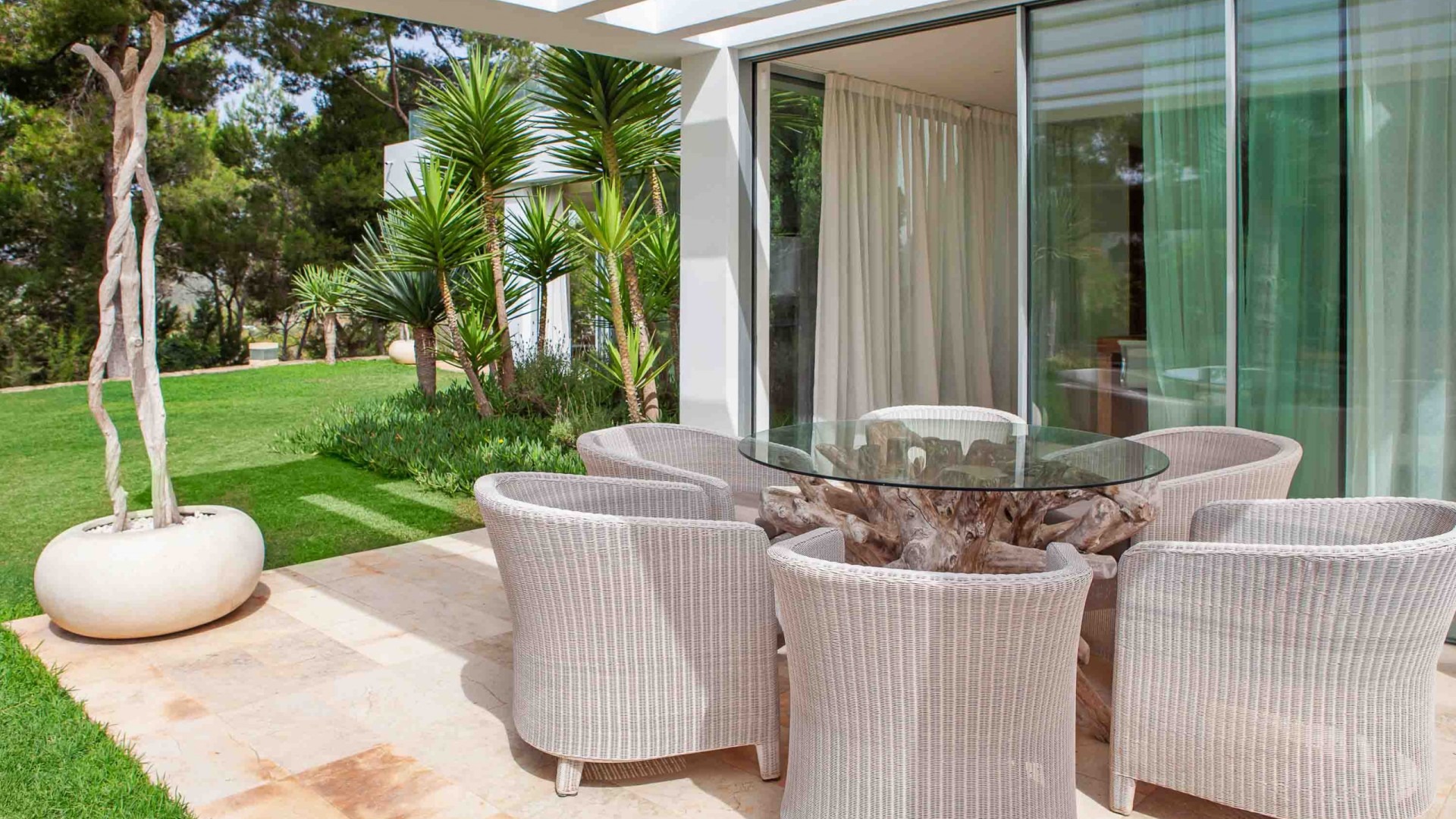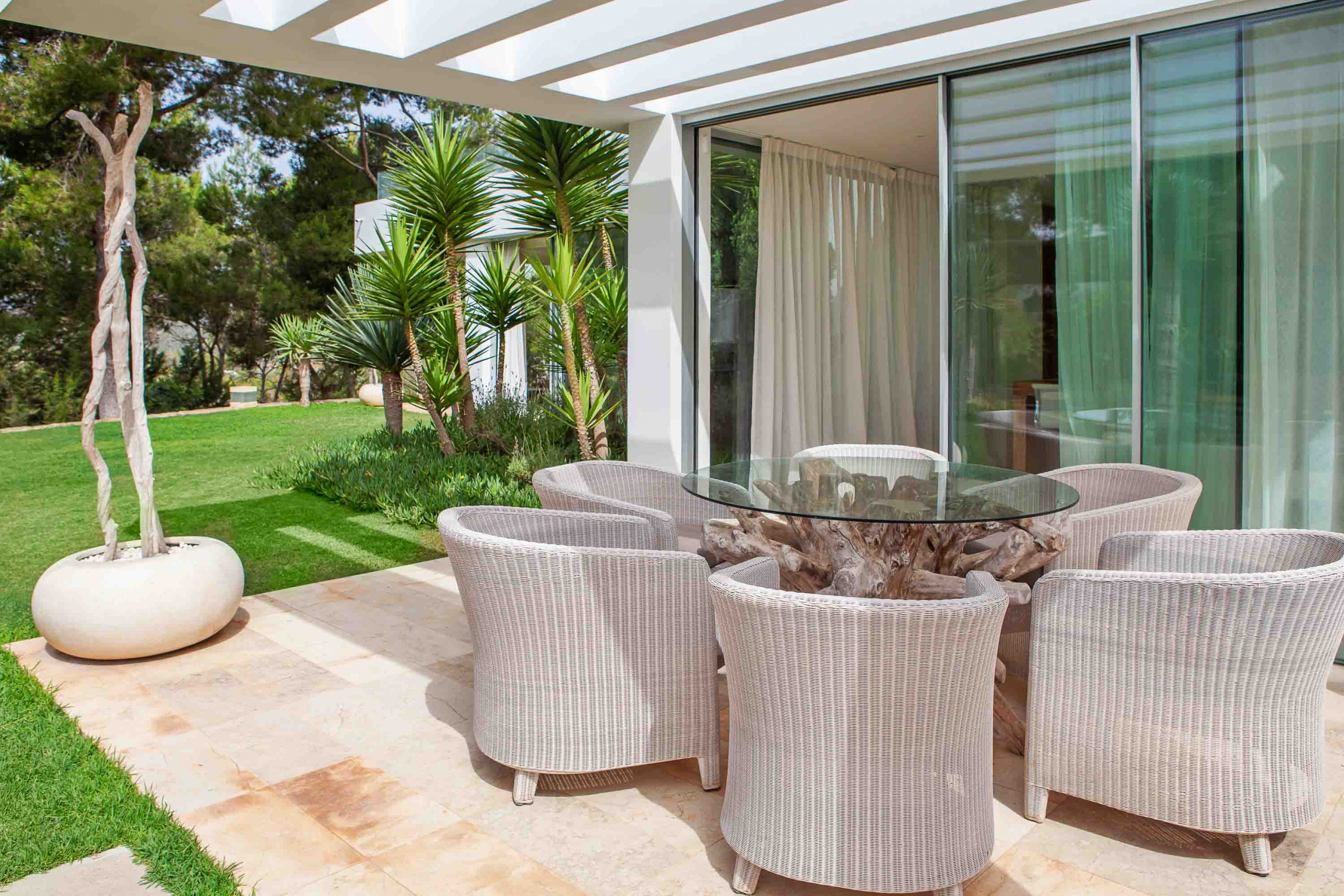 Al otro lado de la casa está la amplia cocina con salida a un patio exterior y a una enorme zona cubierta con una pérgola de comedor y zona de chill-out.