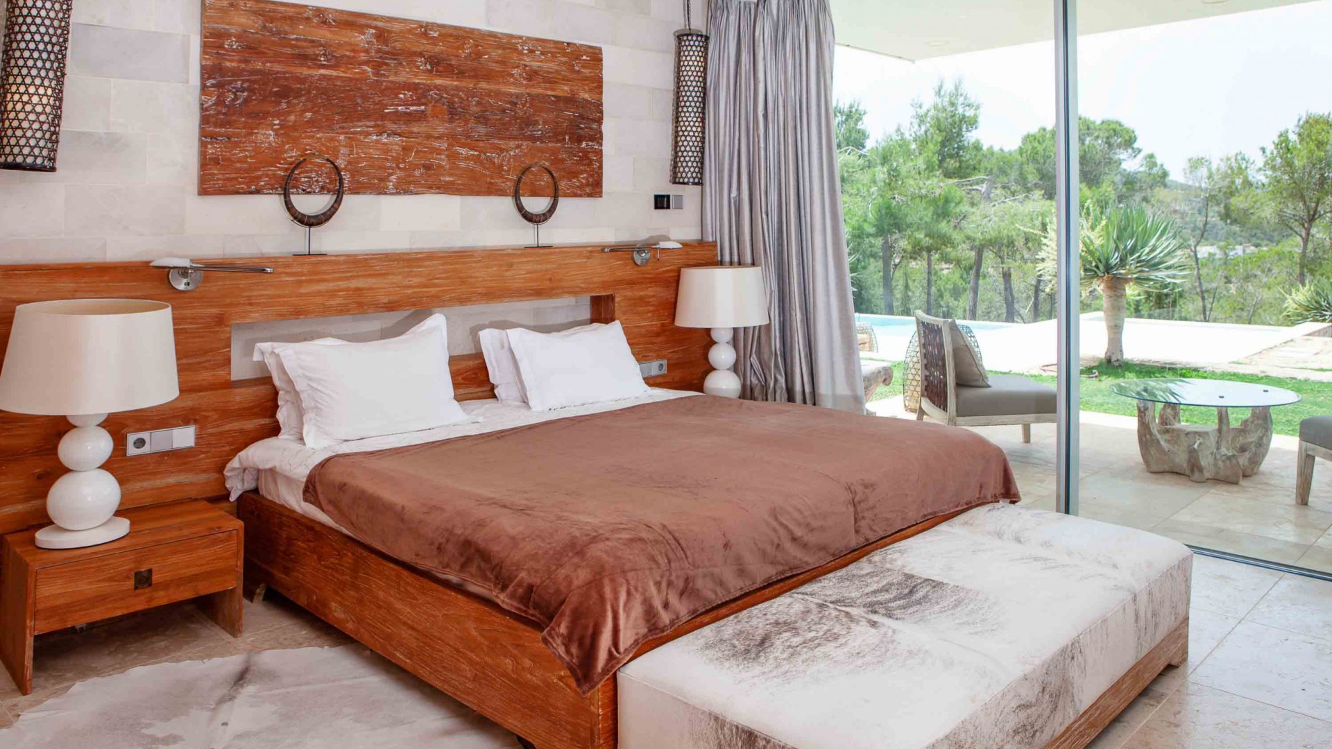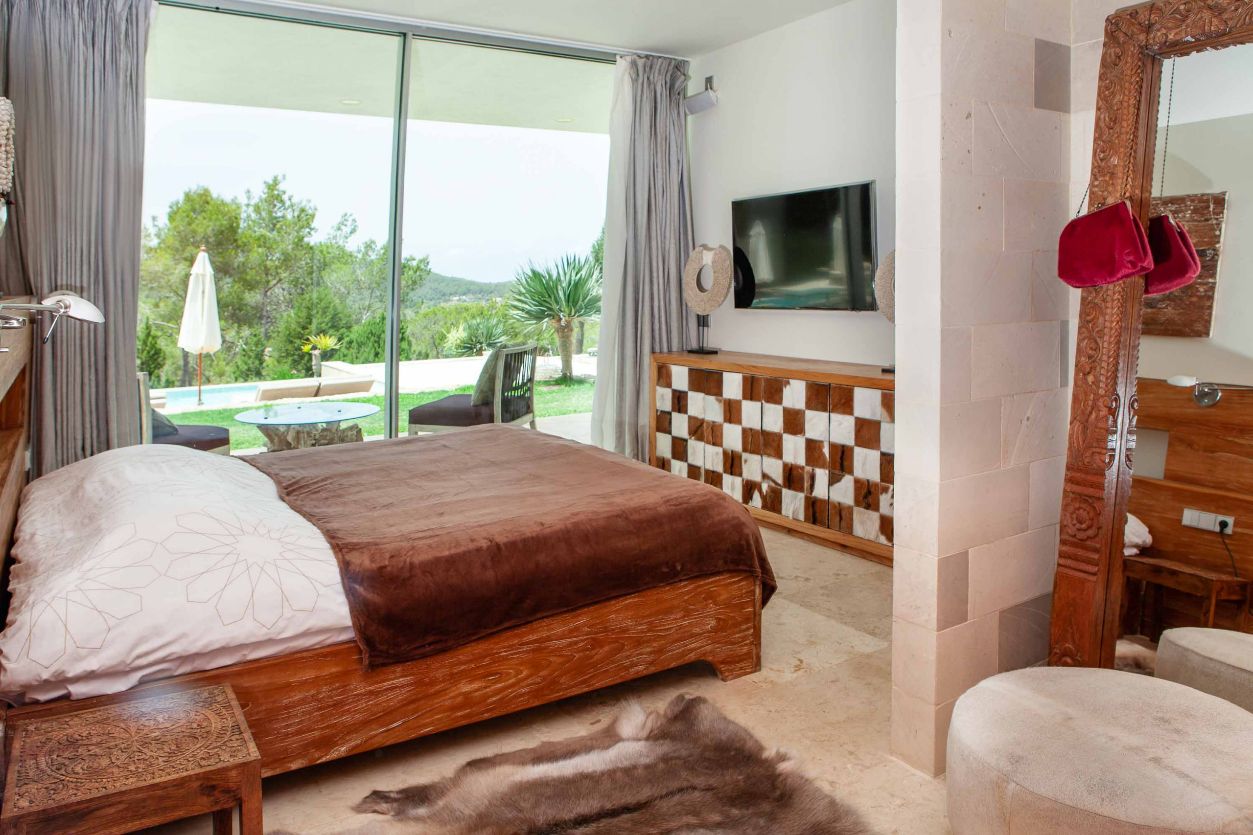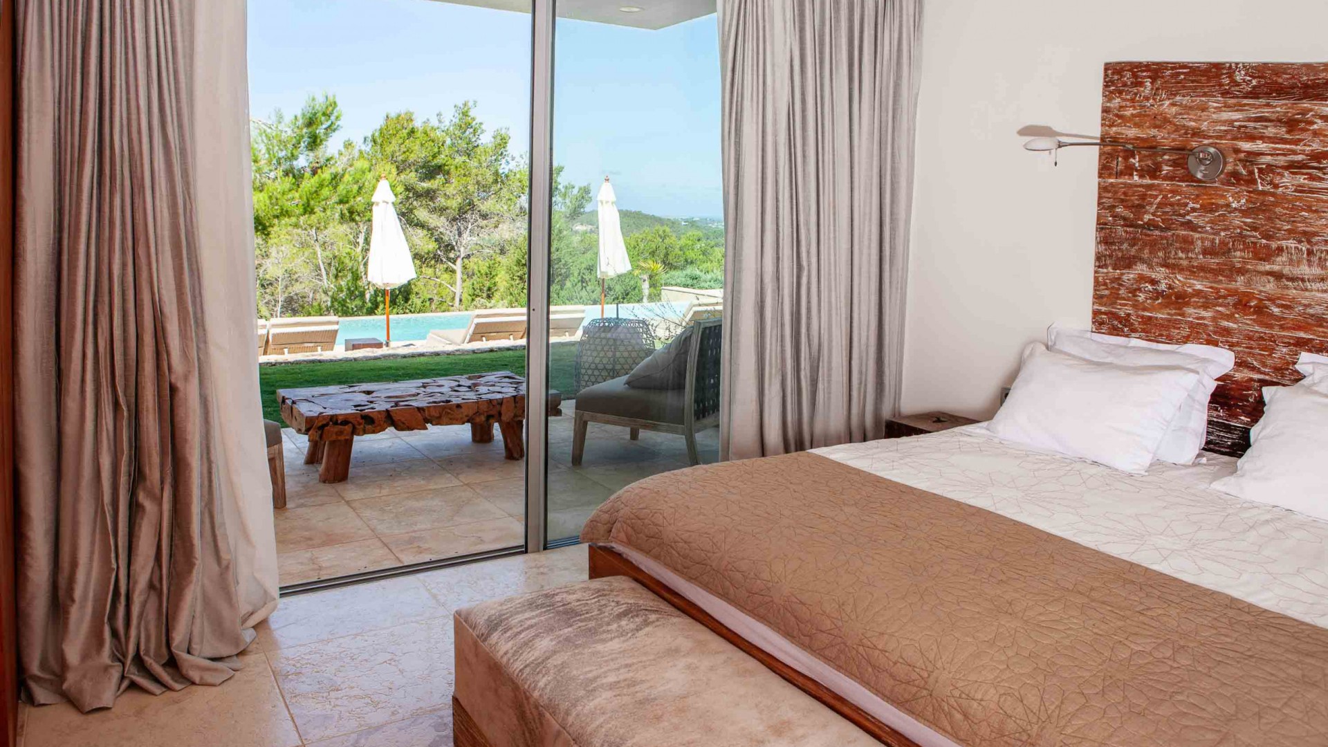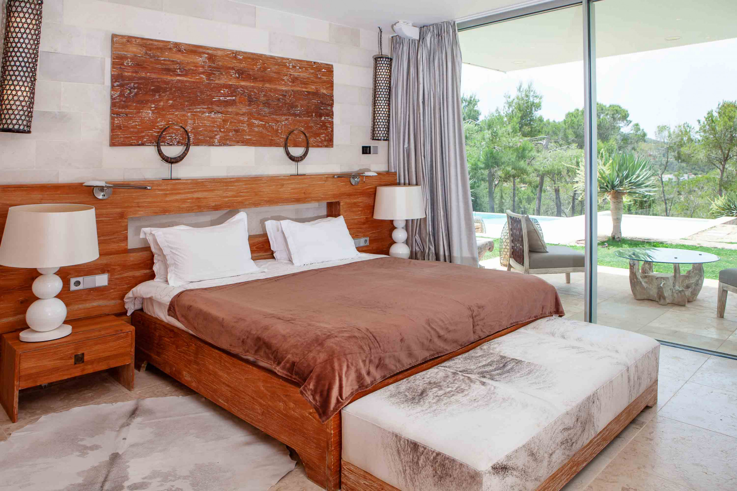El dormitorio máster está al final de la casa principal con salida y vistas a la piscina y a la bahía. Un quinto dormitorio exterior, independiente con su baño en suite.