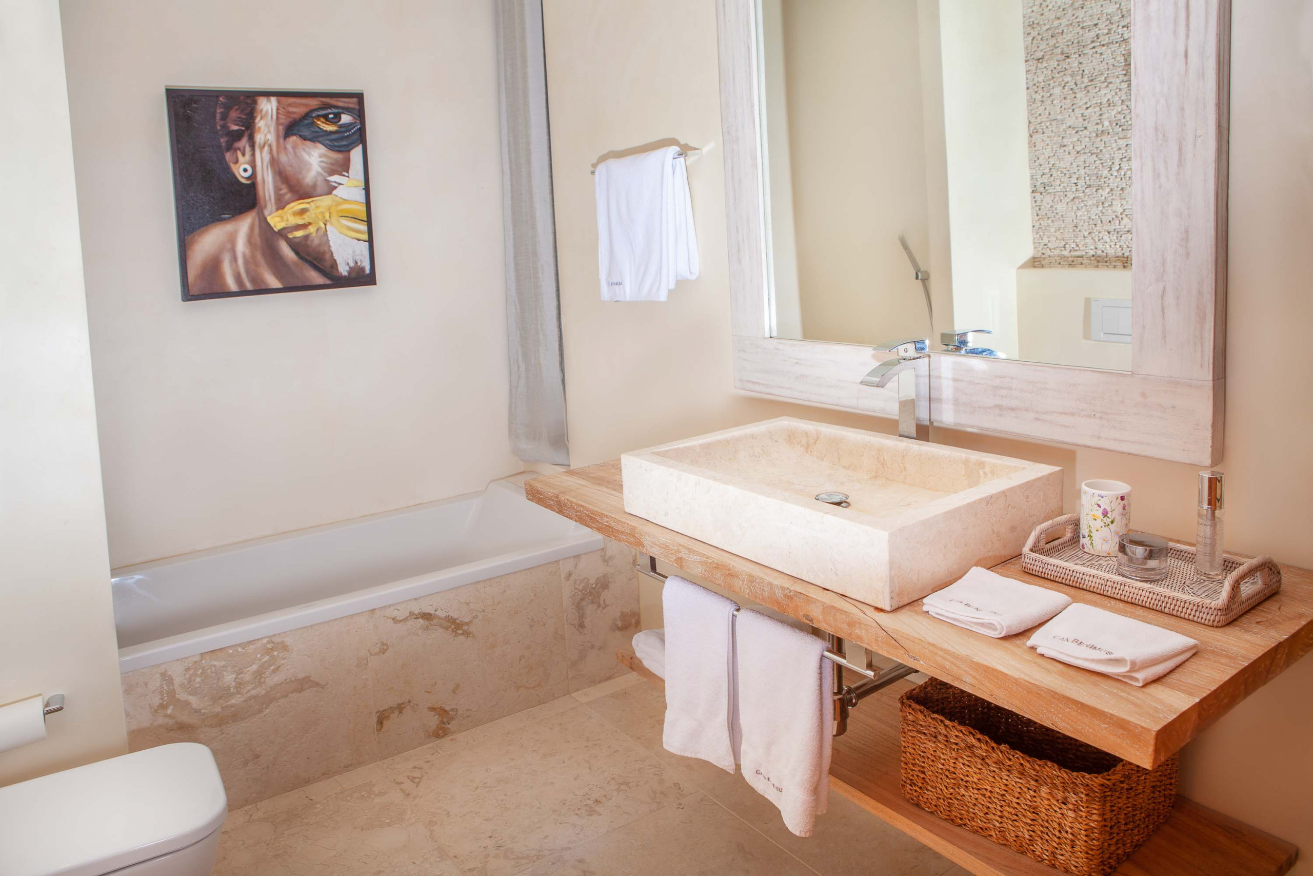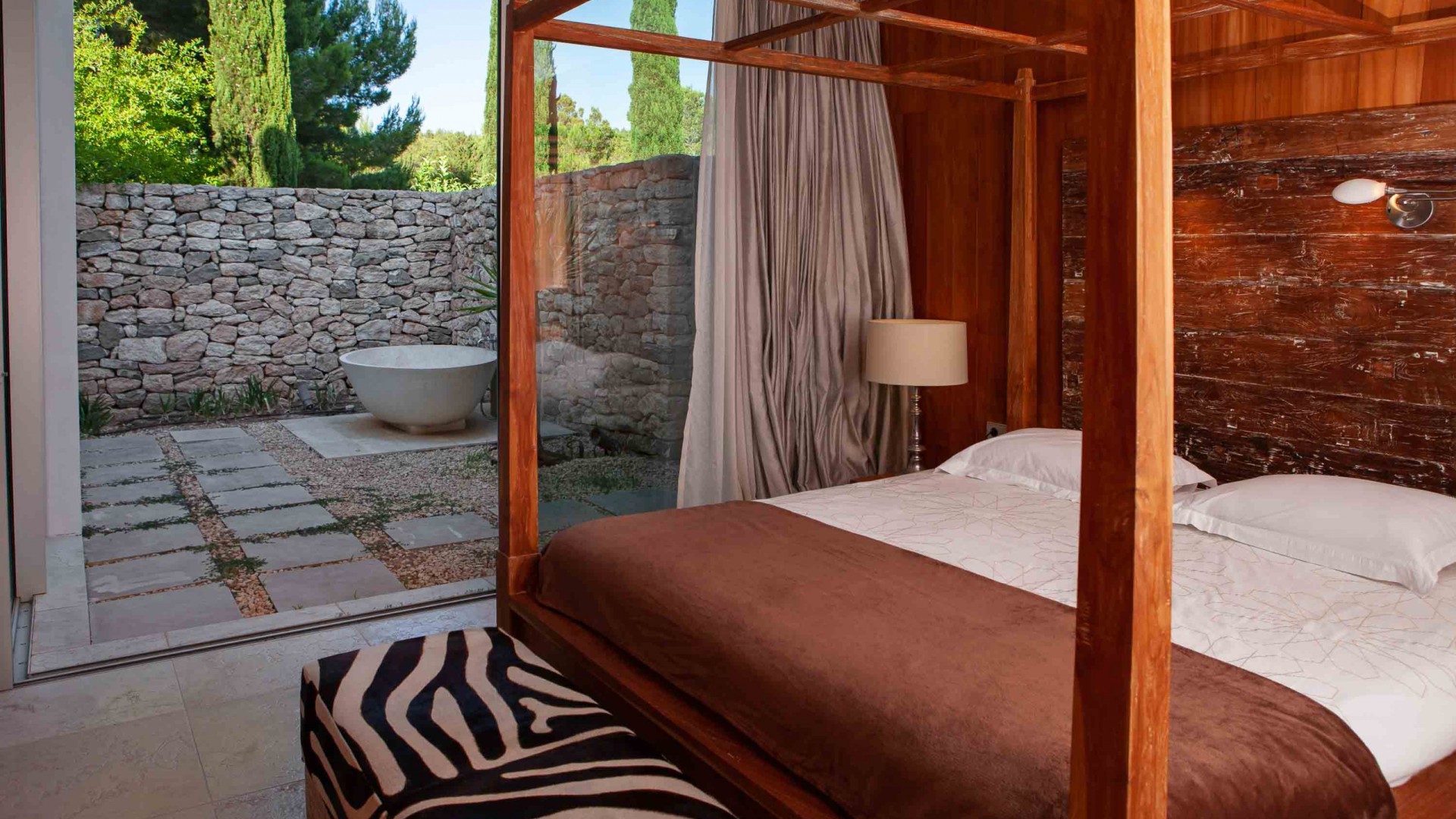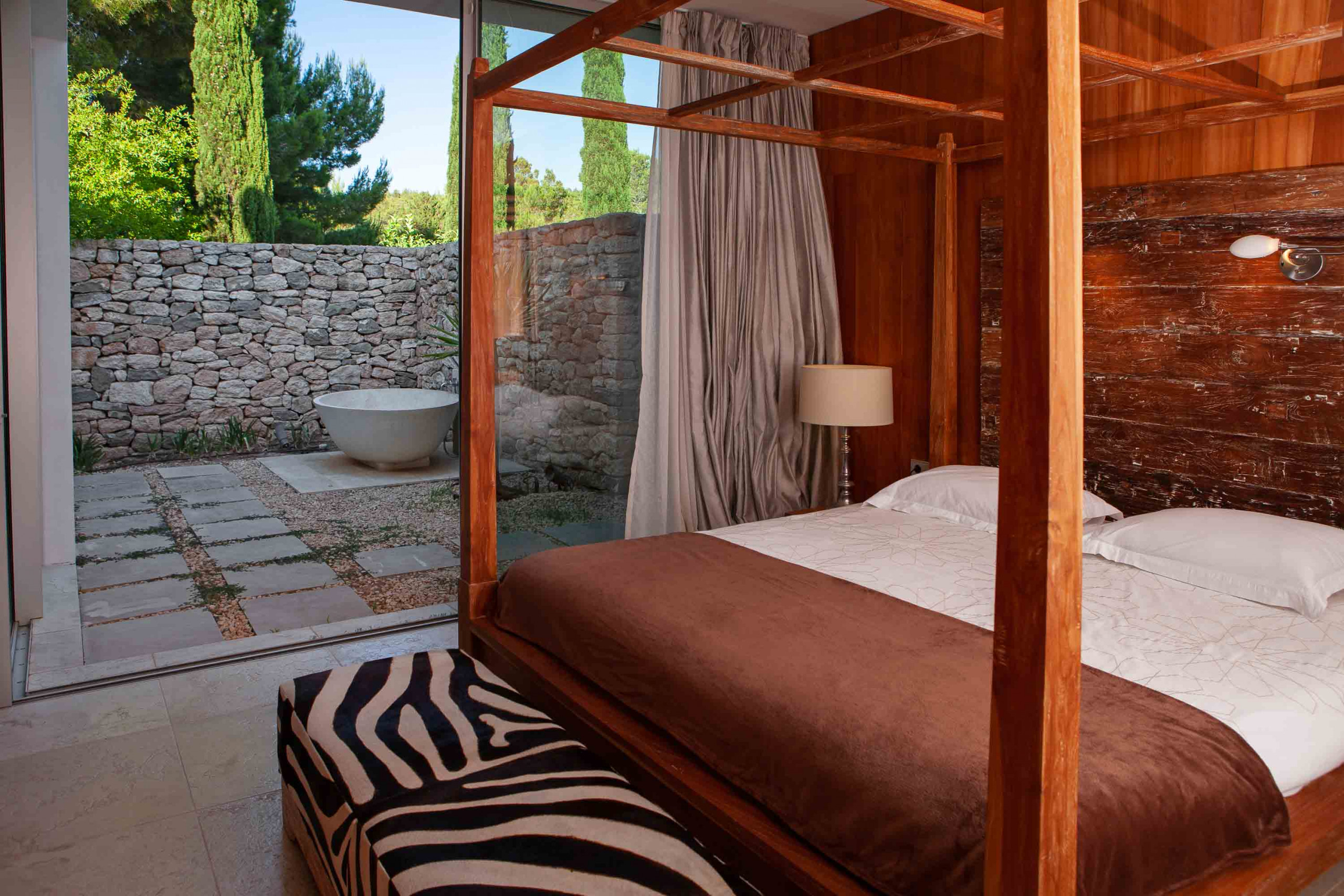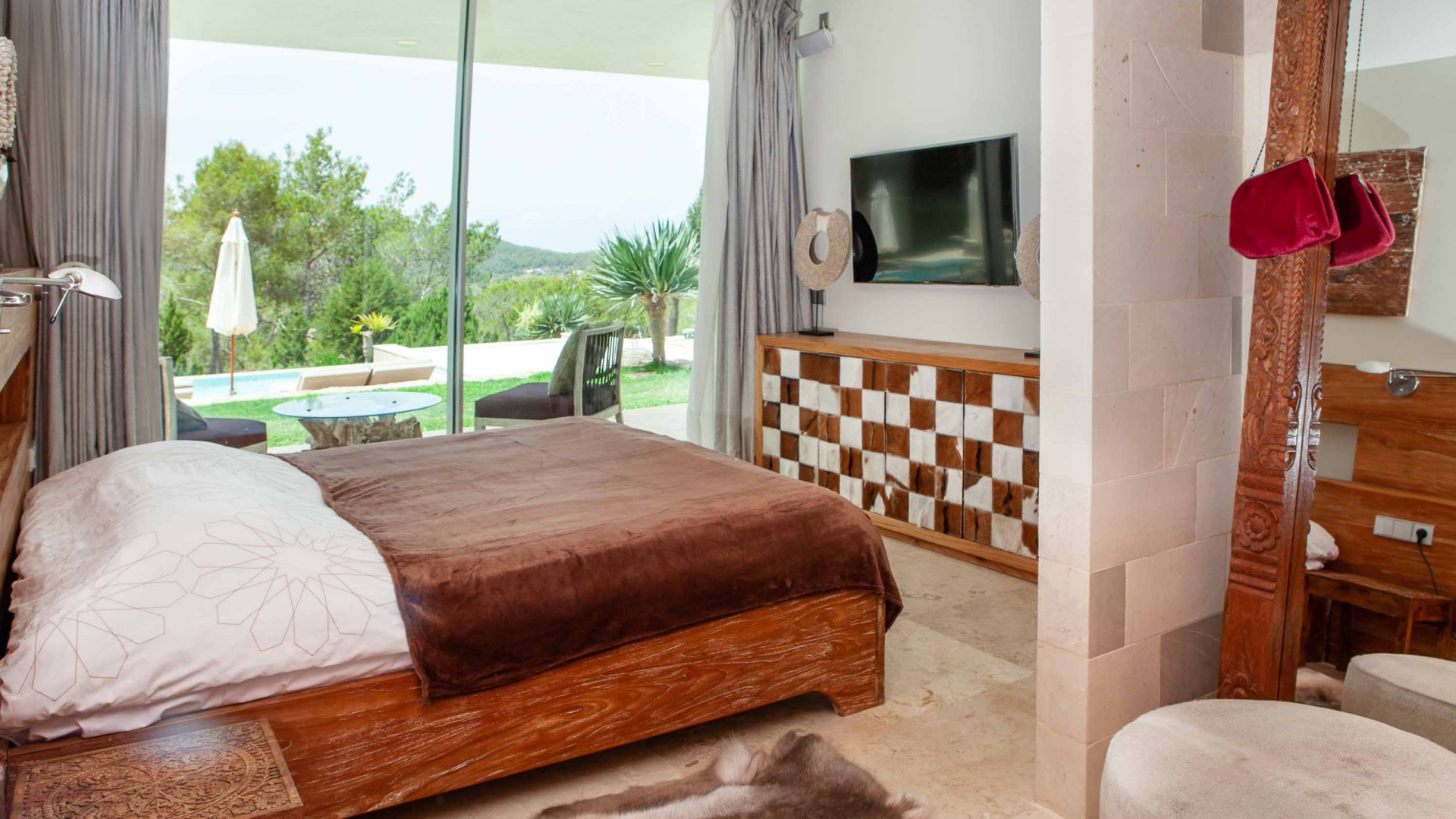 El dormitorio máster está al final de la casa principal con salida y vistas a la piscina y a la bahía. Un quinto dormitorio exterior, independiente con su baño en suite.