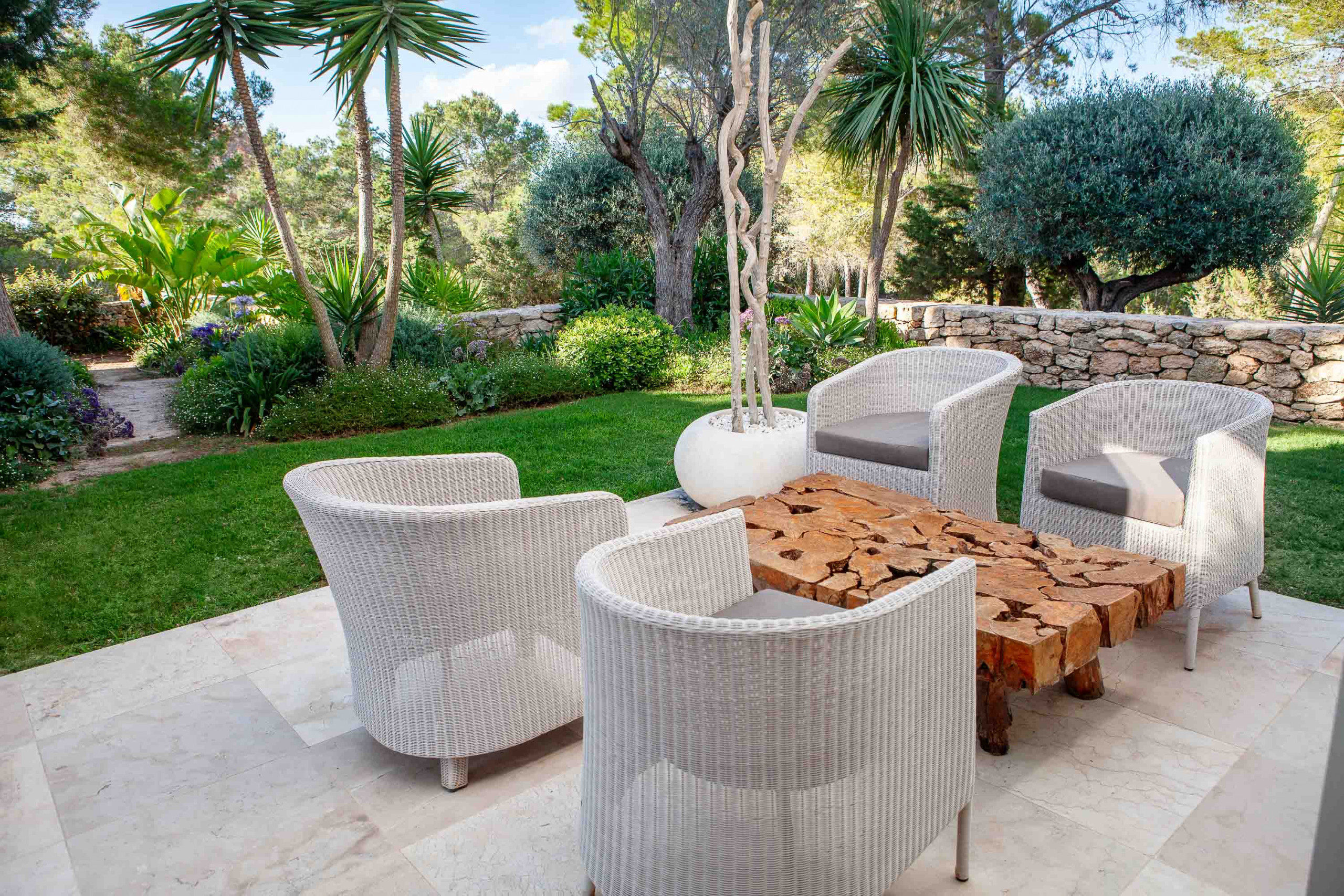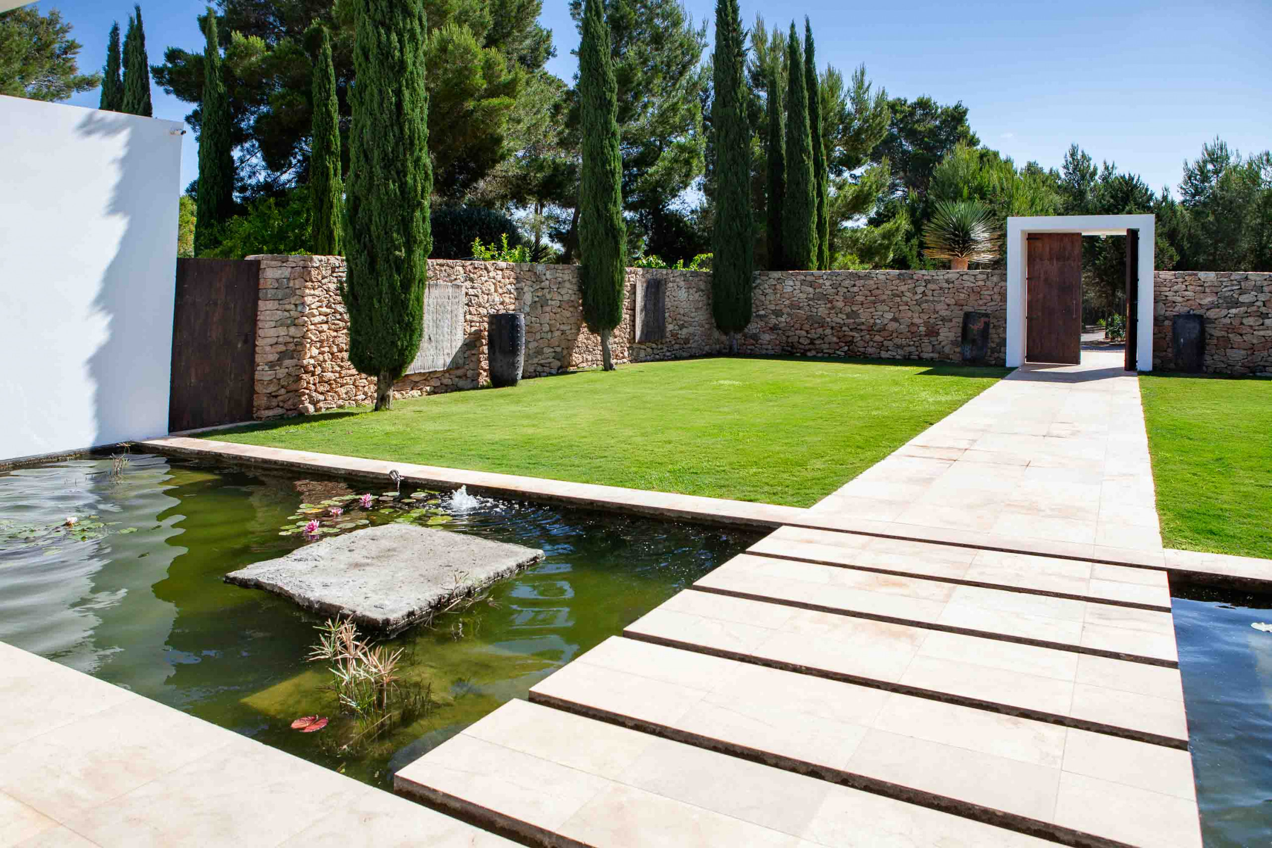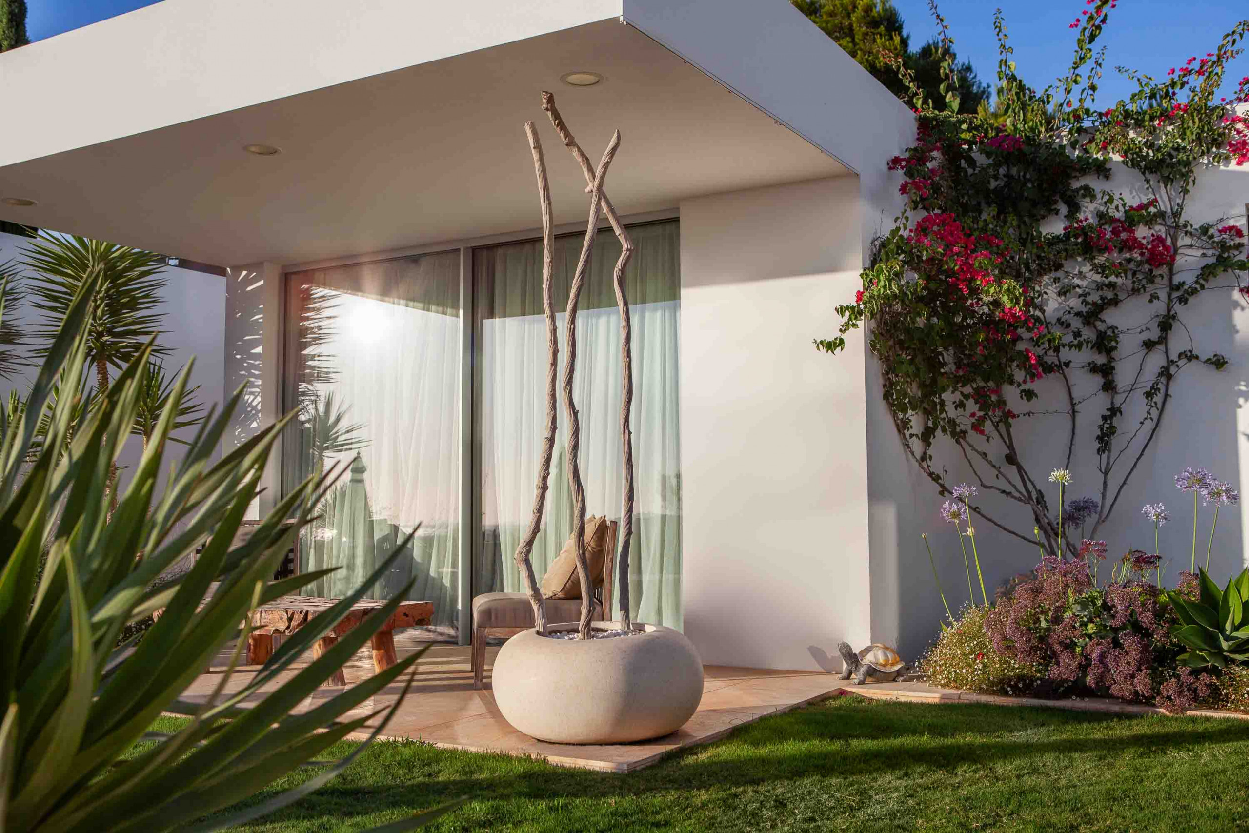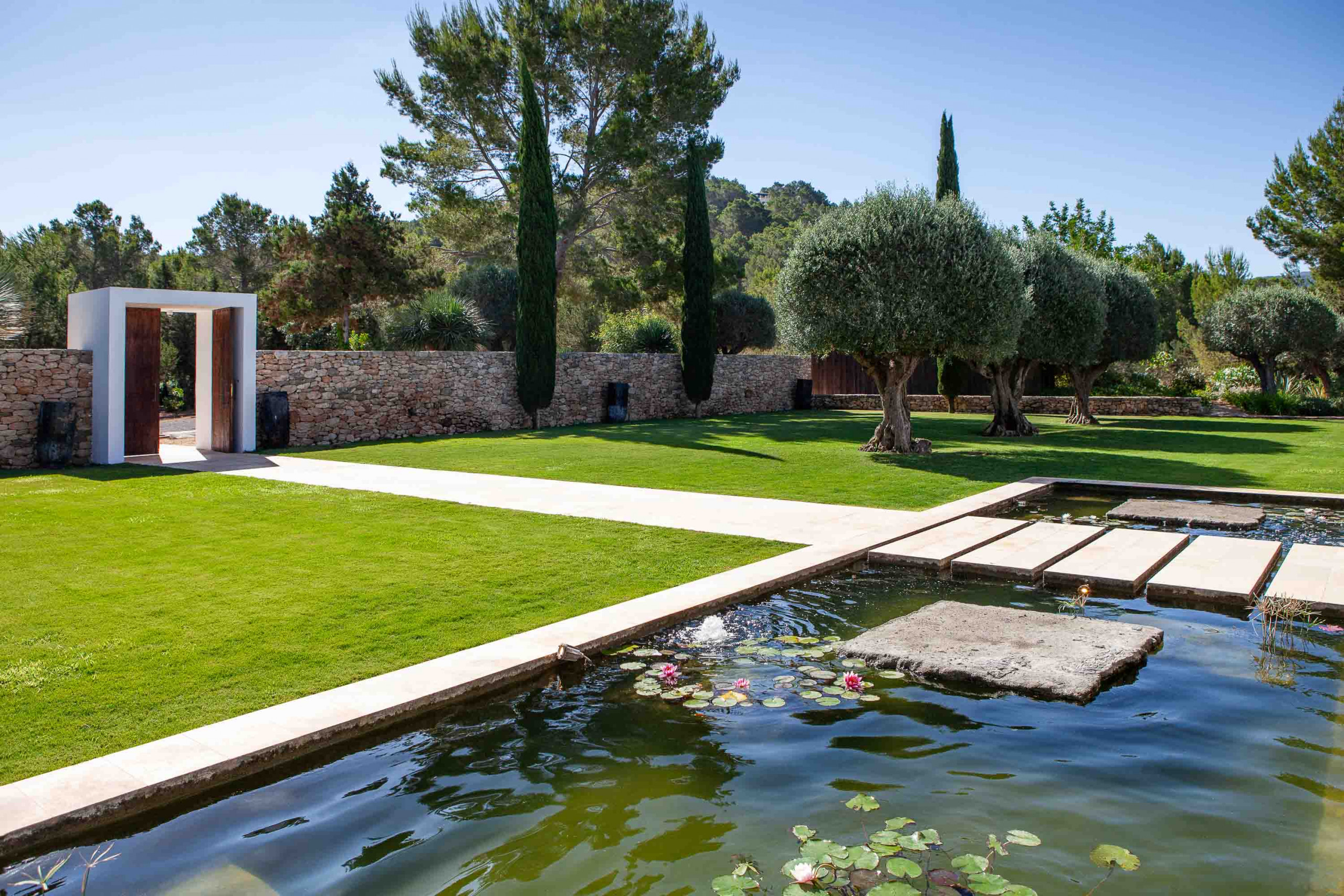 La propiedad dispone de 35.000 metros cuadrados de terreno, vallados y la mayor parte de ellos con jardín y césped. Tiene varias zonas de exterior completamente diferenciadas y para su uso y disfrute. La entrada de la casa con mucho verde y llegando a la amplia zona de salón y comedor. De ahí hacia la derecha vamos hacia la zona de dormitorios, todos exteriores con mucha luz, salida al jardín y baños completos interiores y tres ellos con bañera exterior.
