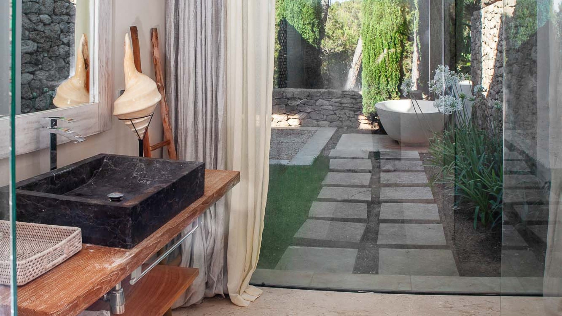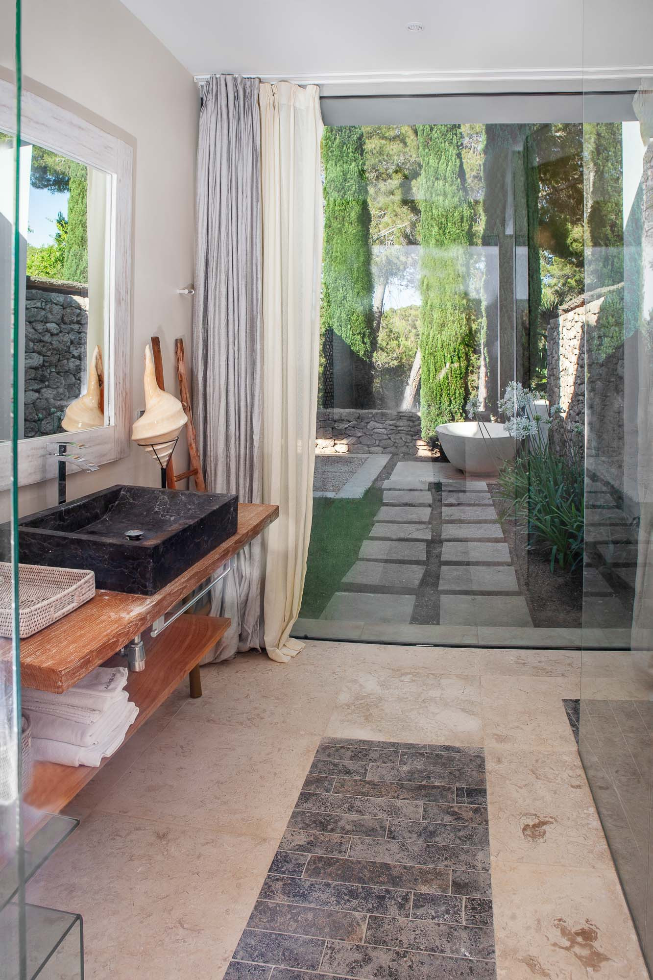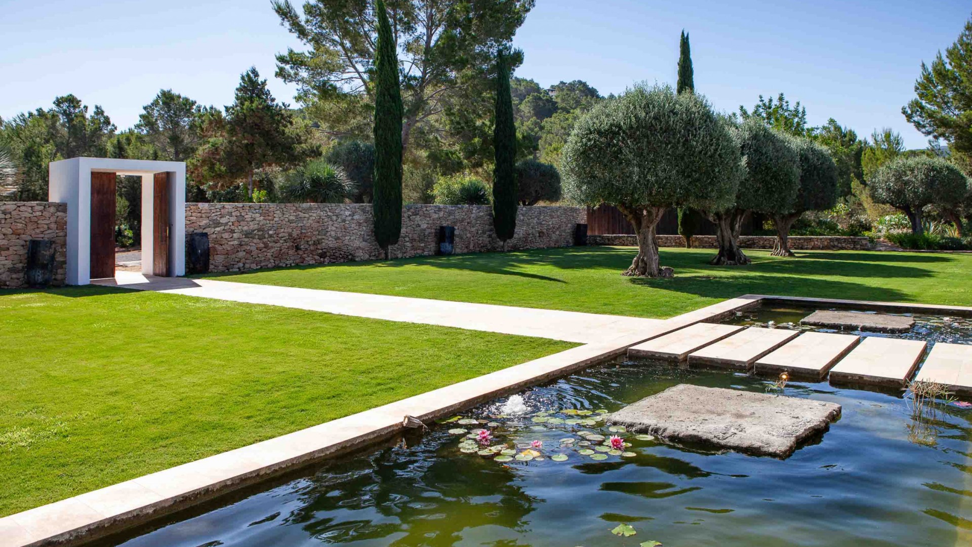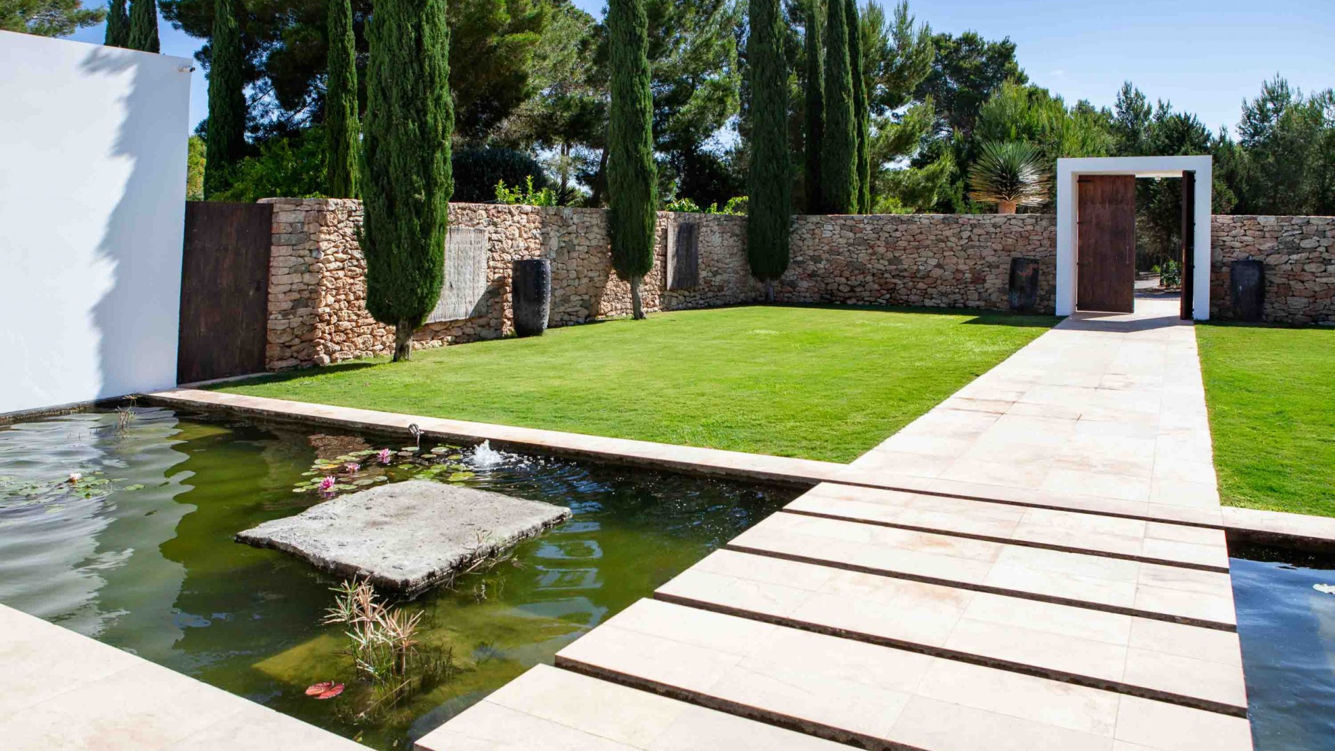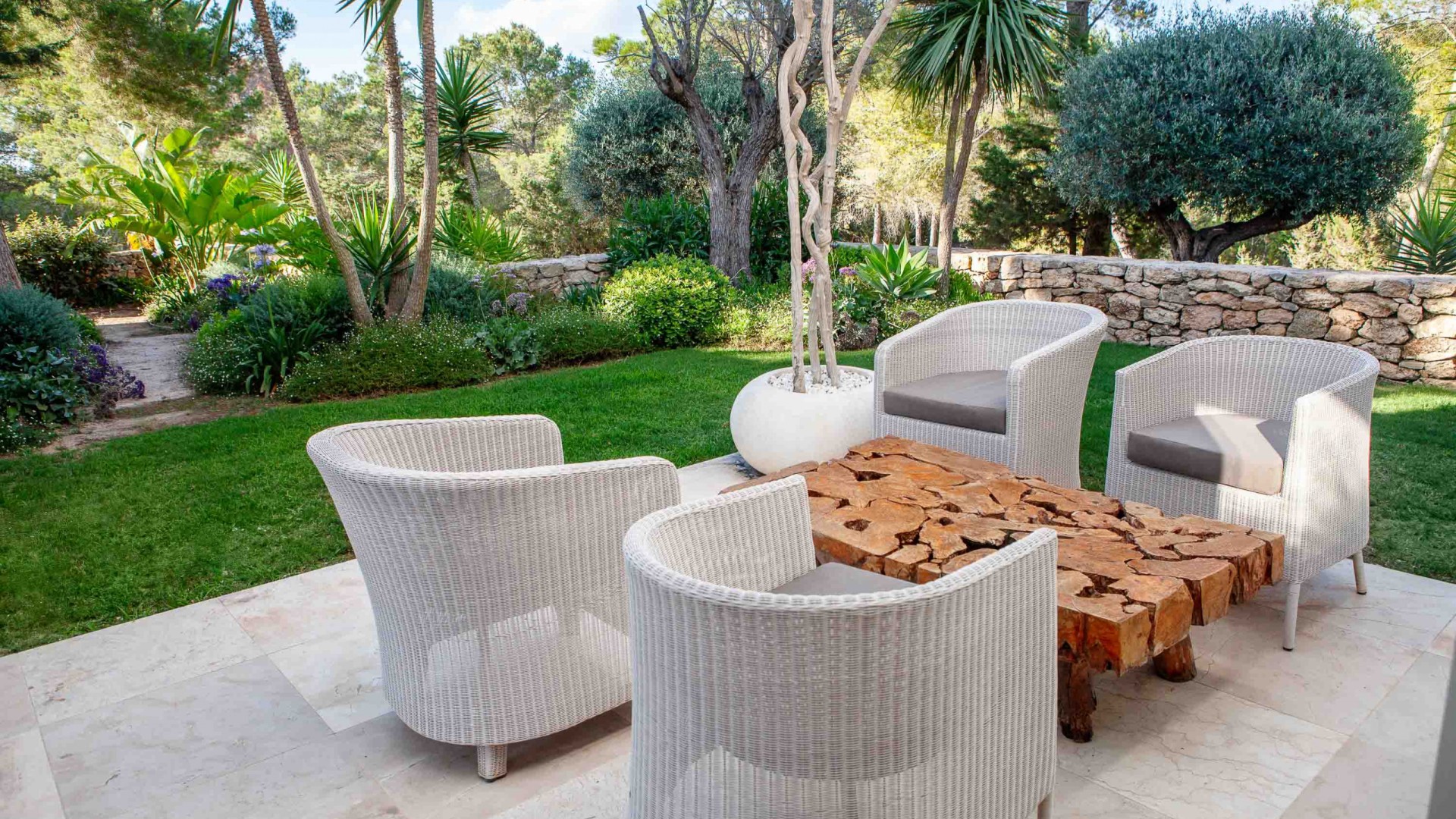 La propiedad dispone de 35.000 metros cuadrados de terreno, vallados y la mayor parte de ellos con jardín y césped. Tiene varias zonas de exterior completamente diferenciadas y para su uso y disfrute. La entrada de la casa con mucho verde y llegando a la amplia zona de salón y comedor. De ahí hacia la derecha vamos hacia la zona de dormitorios, todos exteriores con mucha luz, salida al jardín y baños completos interiores y tres ellos con bañera exterior.