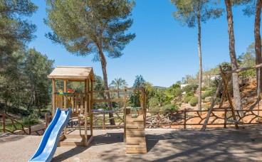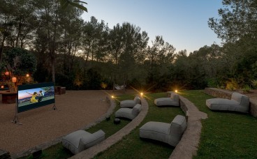 El jardín mediterráneo alberga un olivar, huerto, zona infantil, cama elástica, pista de petanca, deck de yoga y un anfiteatro exterior, ideal para proyecciones o reuniones al aire libre.
