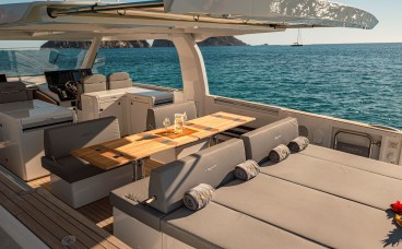 Espacios de Relax Infinitos: Cuenta con dos soláriums espectaculares (proa y popa) y una mesa de comedor exterior en teca que invita a largas sobremesas. Sus dimensiones «XL» ofrecen la mayor superficie de cubierta en su categoría.