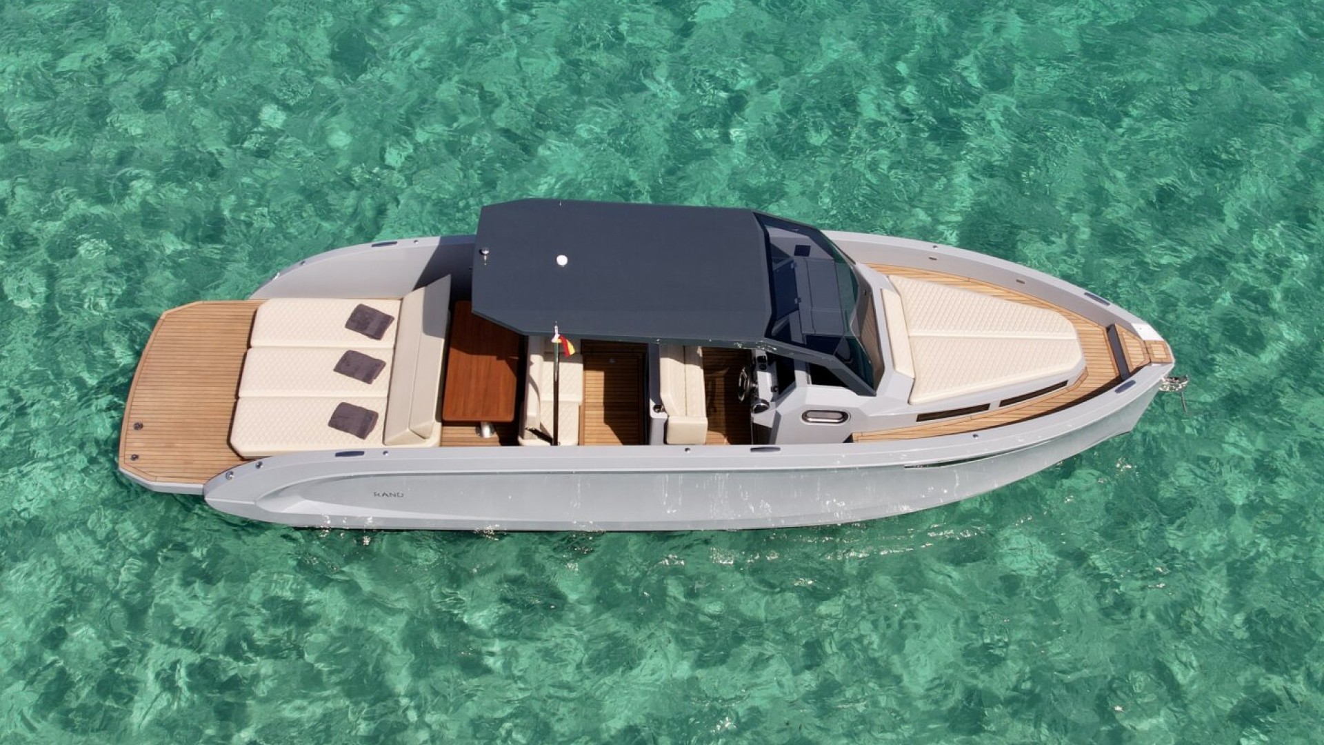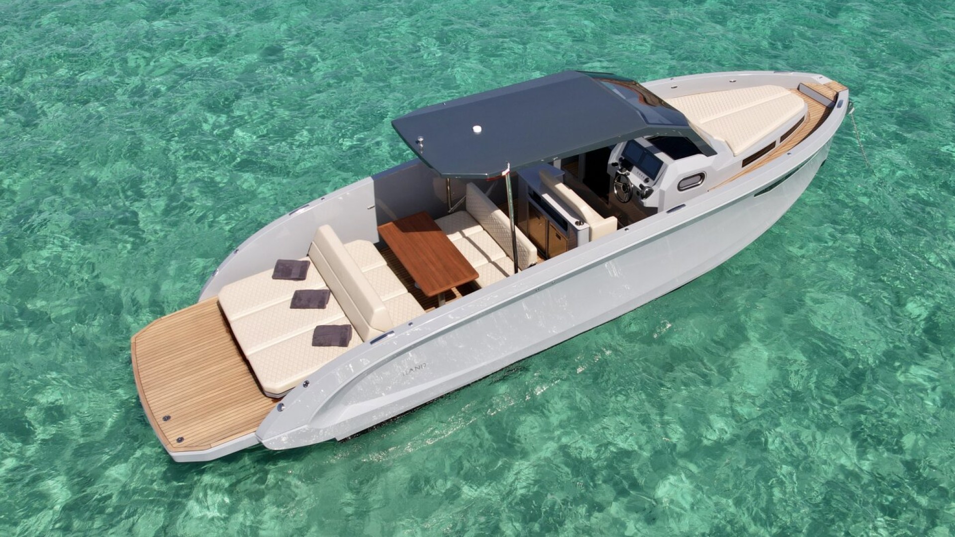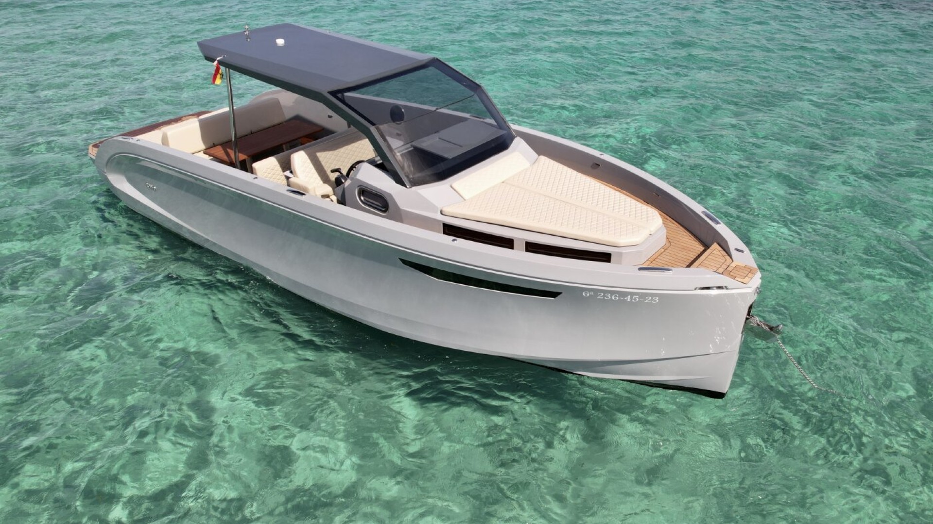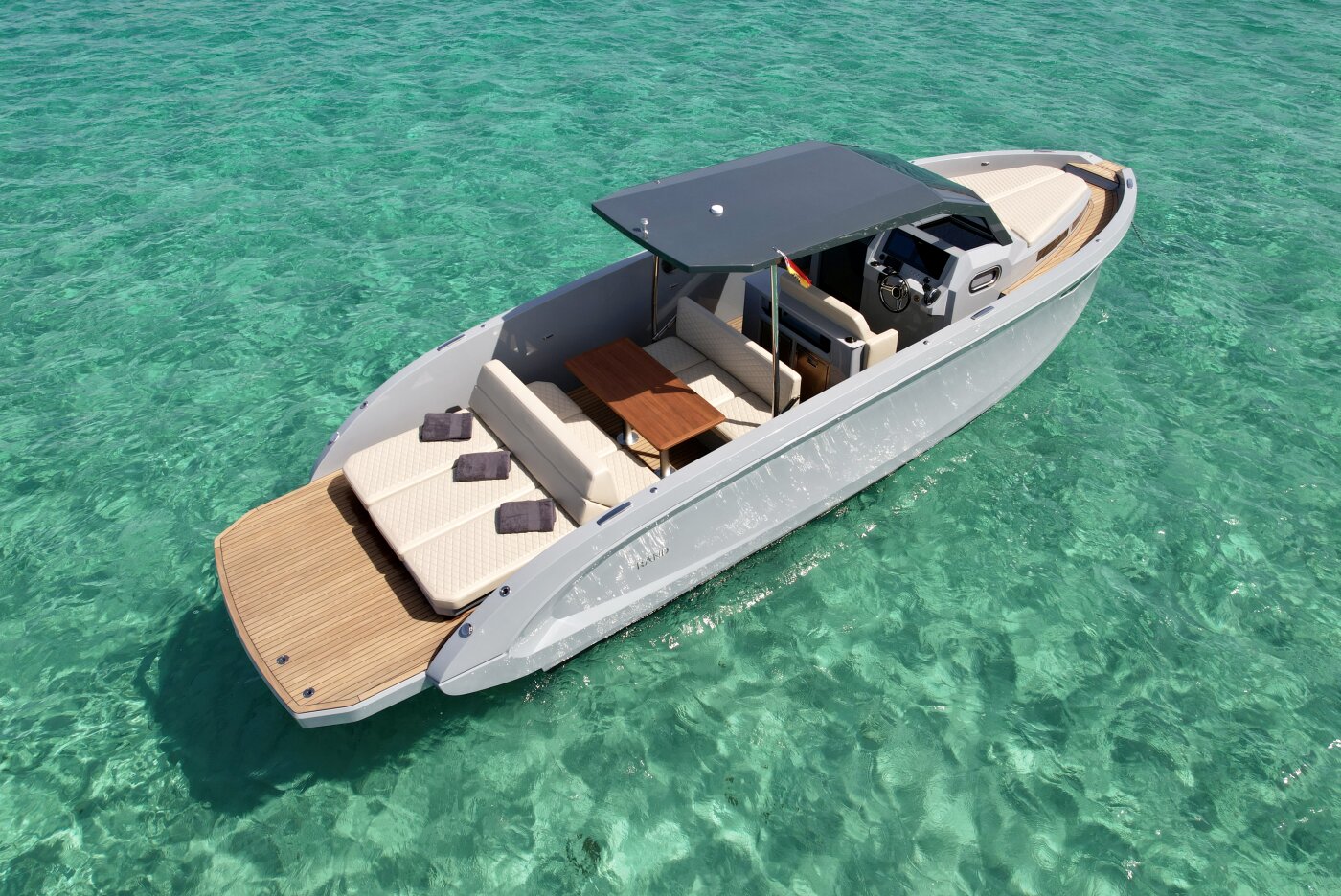 Conexión Total con el Mar: Su amplia plataforma de baño en teca, a ras de agua, es la base perfecta para practicar snorkel o simplemente dejarte llevar por el azul turquesa de Formentera.